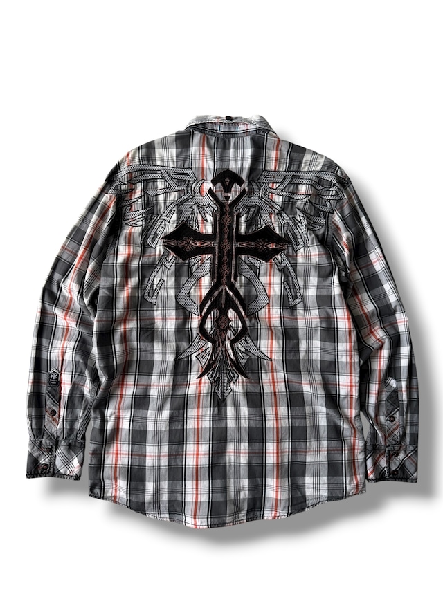 ♾KANJI♾ Cross motif embroidered & studs check shirt size XL