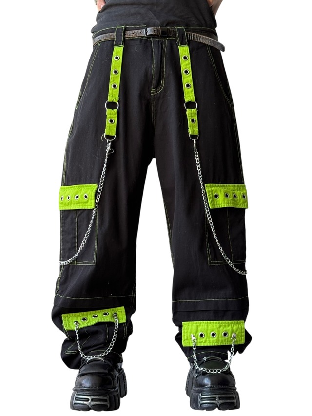 【SOCIAL COLLISION】 Metal Chain Decoration Stitch Work Wide Pants ブラックのボディに蛍光グリーンのカラーのステッチと切り替えが目を引くボンテージ風パンツ!!!!! メタルチェーンやハトメのデコレーション等あのUSパンクブランドを彷彿させるかのようならしいギミックなスペシャルな1本。 価格も抑えめで履くと意外とシンプルなディテールとワイドシルエットなので綺麗目なスタイリングからストリートまで全部対応できそうです☺️♡♡ ◾️SIZE表記 13 ◾️実寸 ウエスト90cm 股上32cm 股下78cm わたり幅34cm 裾幅25cm ◾️素材 100% COTTON ◾️状態 used exclusive of decoration ◾️着用モデル171cm ※多少写真との色味の違いが生じる場合がございます。ご了承ください。