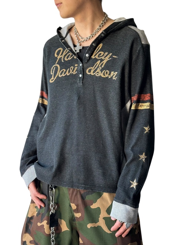 ♾Harley-Davidson♾ Rhinestone Design Mesh Thermal Hoodie size 1W ・ ハーレーさんのy2k感半端ないサーマルフーディーの入荷❣️❣️ 前後ろどちらにもラインストーンがセットされており、前後ろどちらから見てもキュートなデザイン✨️✨️ これは春に1枚で着たくなるやつ♡ クローゼットにマストで欲しい1着です‼️‼️ ・ サイズ 表記 1W 着丈62cm 肩幅52cm 身幅65cm 袖丈63.5cm 着用者 171cm 素材 POLYESTER 64% NAILON 36% 状態 used 使用感あり。 デザインによるプリント剥げあり ラインストーン欠損あり。 多少写真との色味の違いが生じる場合がございます。ご了承ください。