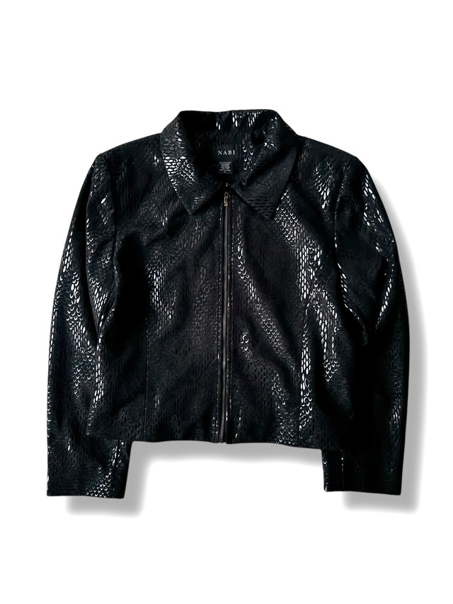 ♾NAVI♾ Python pattern short length print jacket size L ・ パイソンパターンがたまらないジャケットの入荷‼️‼️ スウェード調の生地感にパイソンパターンがプリントされており、めちゃくちゃクールなデザイン✨️✨️ ほどよいサイズ感でアウターとしてもインナーとしても使えるサイズ感‼️‼️ 今時期に最高な1着です✨️✨️ サイズ 表記 L 肩幅43cm 身幅55cm 着丈 52.5cm 袖丈 62cm 着用者175cm 素材 POLYESTER 70% RAYON 30% 状態 used 使用感あり 目立った傷、汚れなし。 多少写真との色味の違いが生じる場合がございます。ご了承ください。
