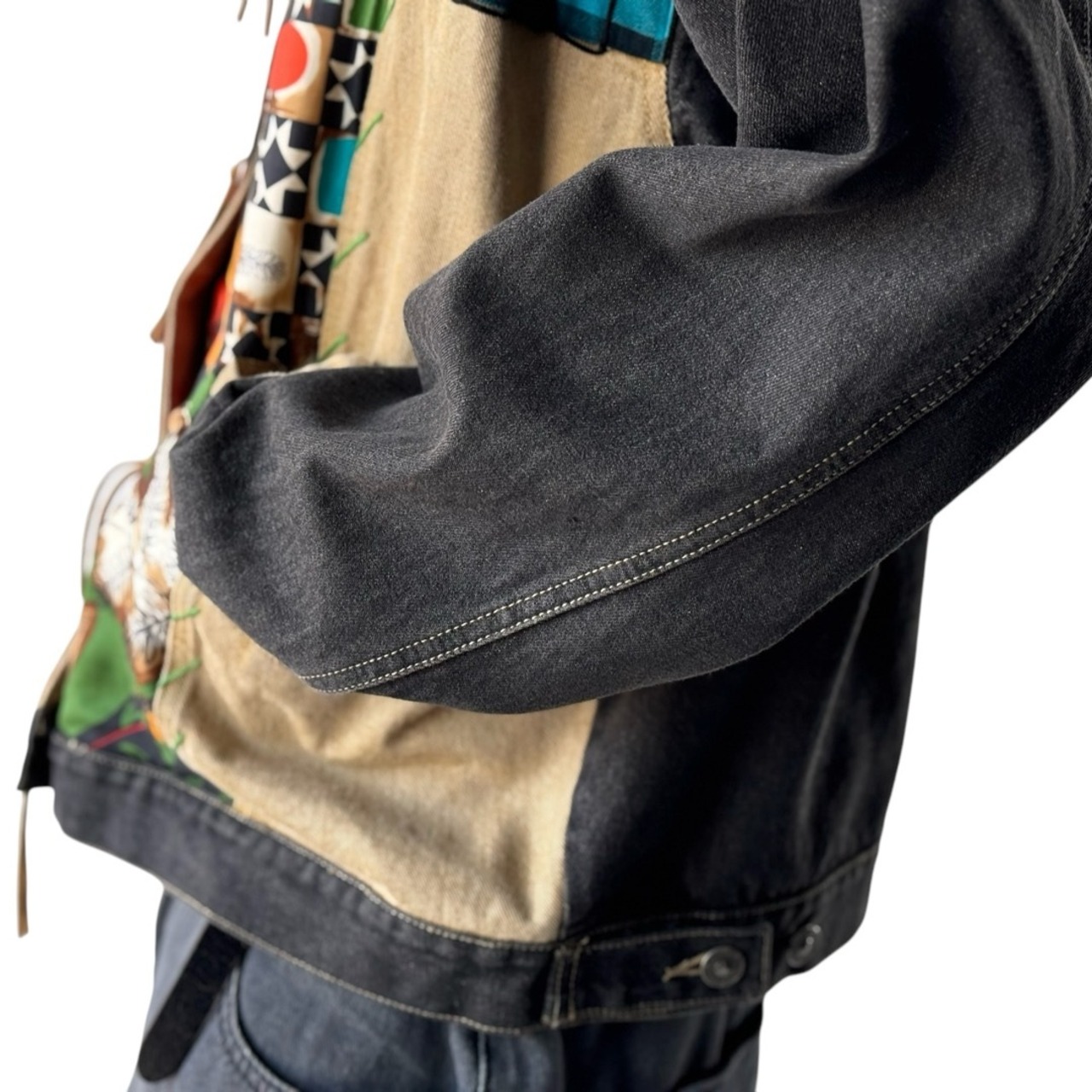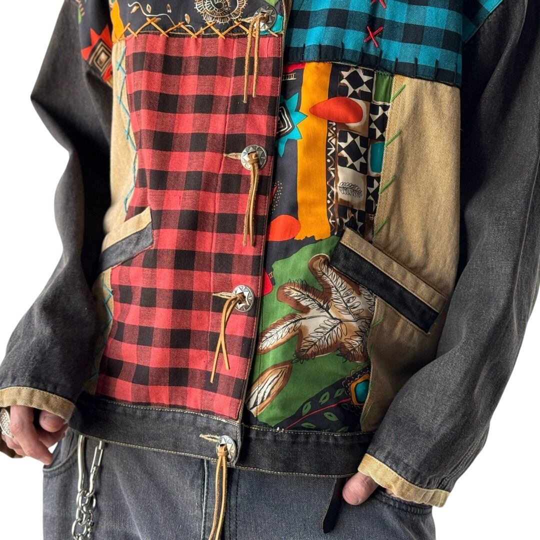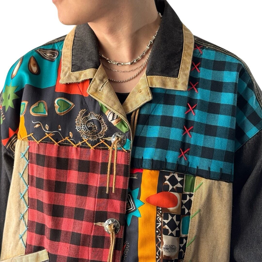 チェック×柄の存在感抜群で目を引く組み合わせが古着らしさのあるデザインとなっており、ボタンは大振りなメタルコンチョボタン、アクセントに多色のハンドステッチを施した素敵な世界観が溢れる無二な仕上がりが最高✨️