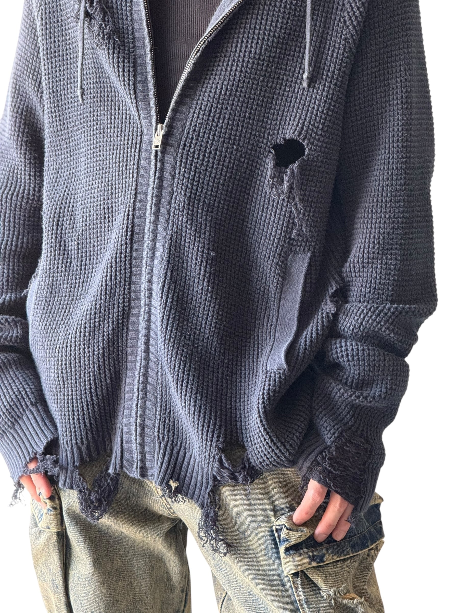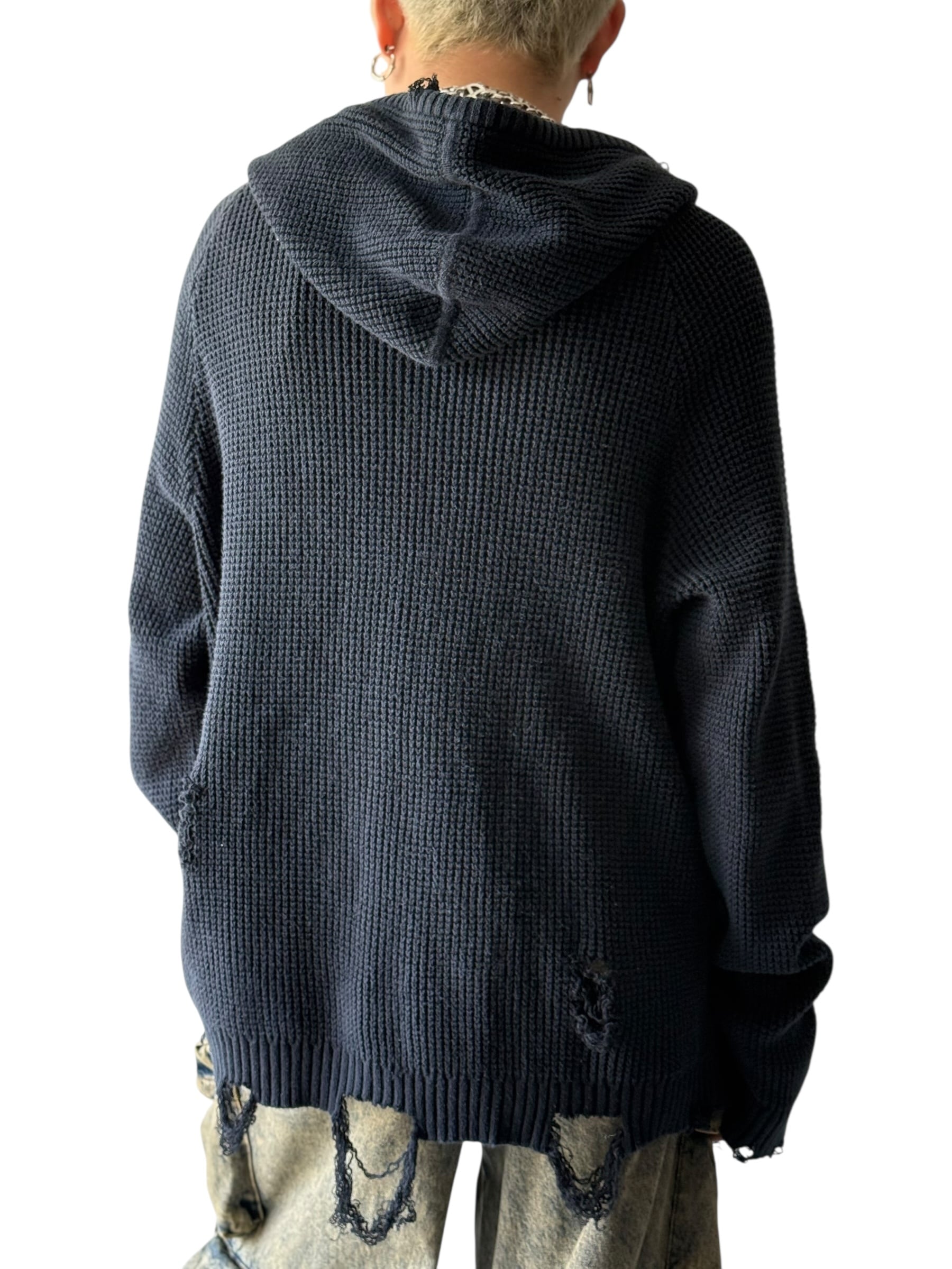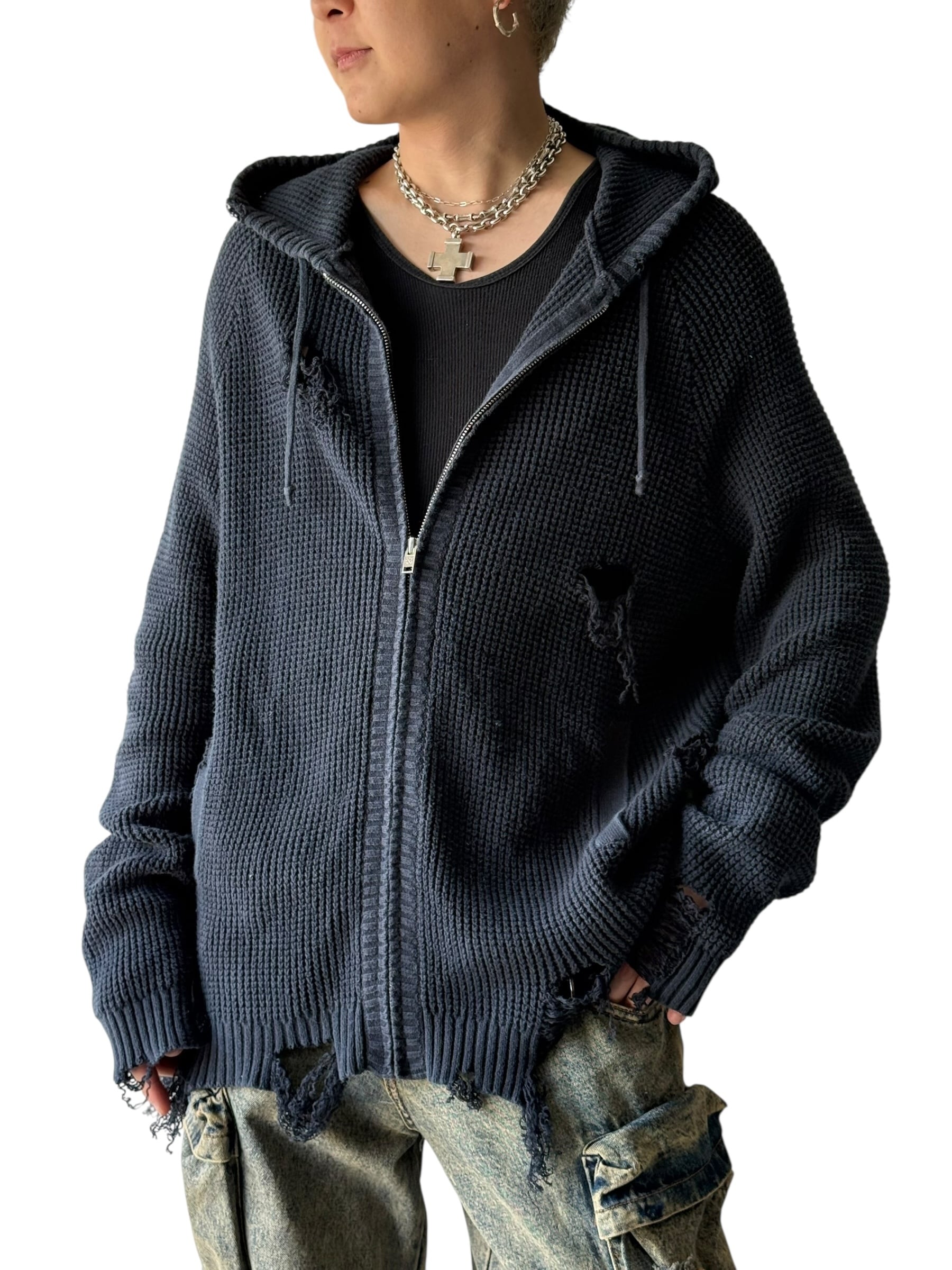 無地単色のシンプルなニットフーディーにダメージ加工を施したダルっとしたオーバーなシルエットが目を引くデザインフーディー‼️