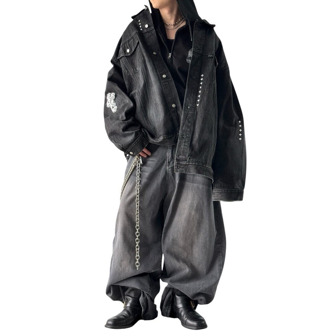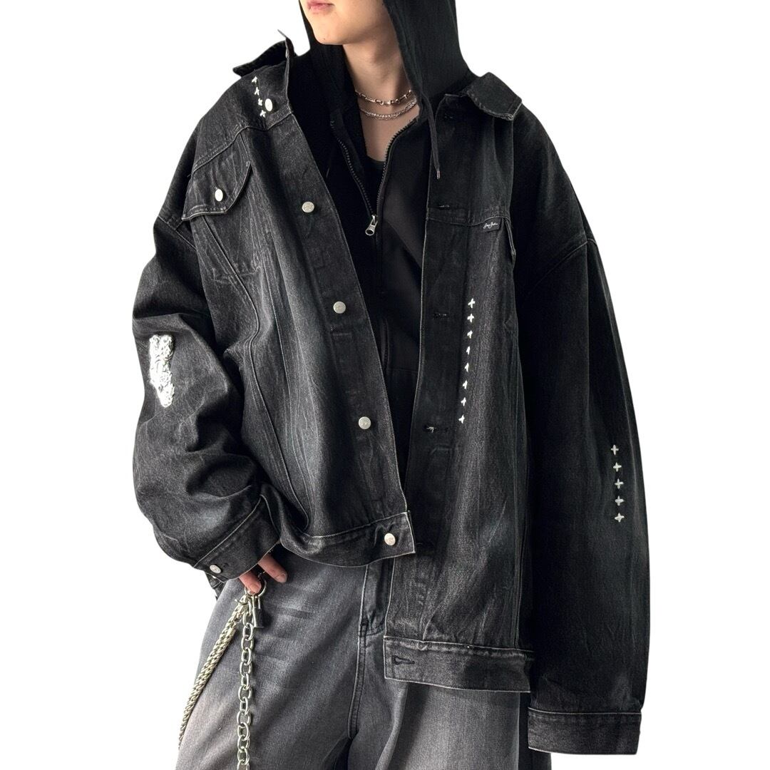 cross motif dusty custom design over sized big silhouette black denim tracker jacket