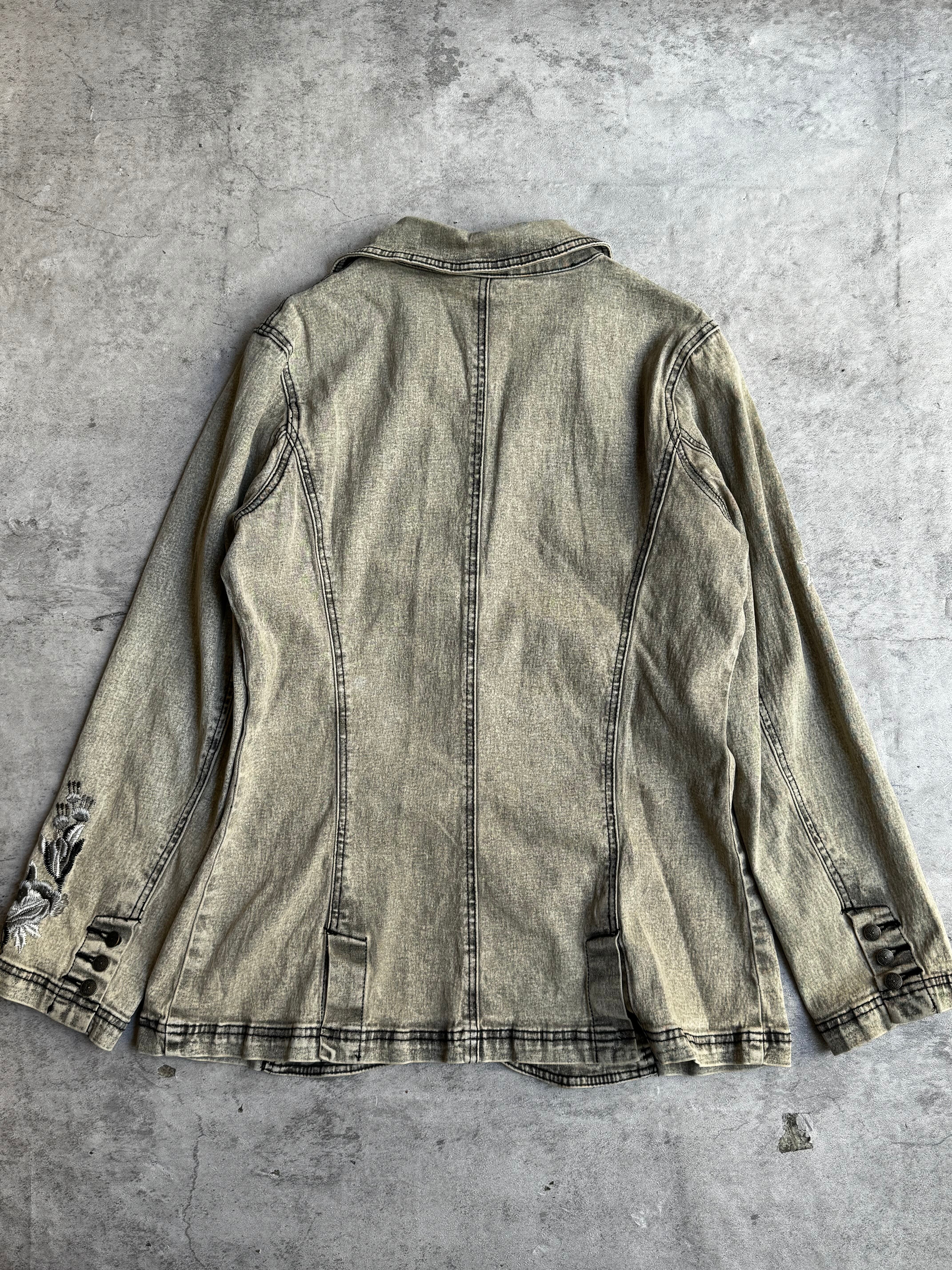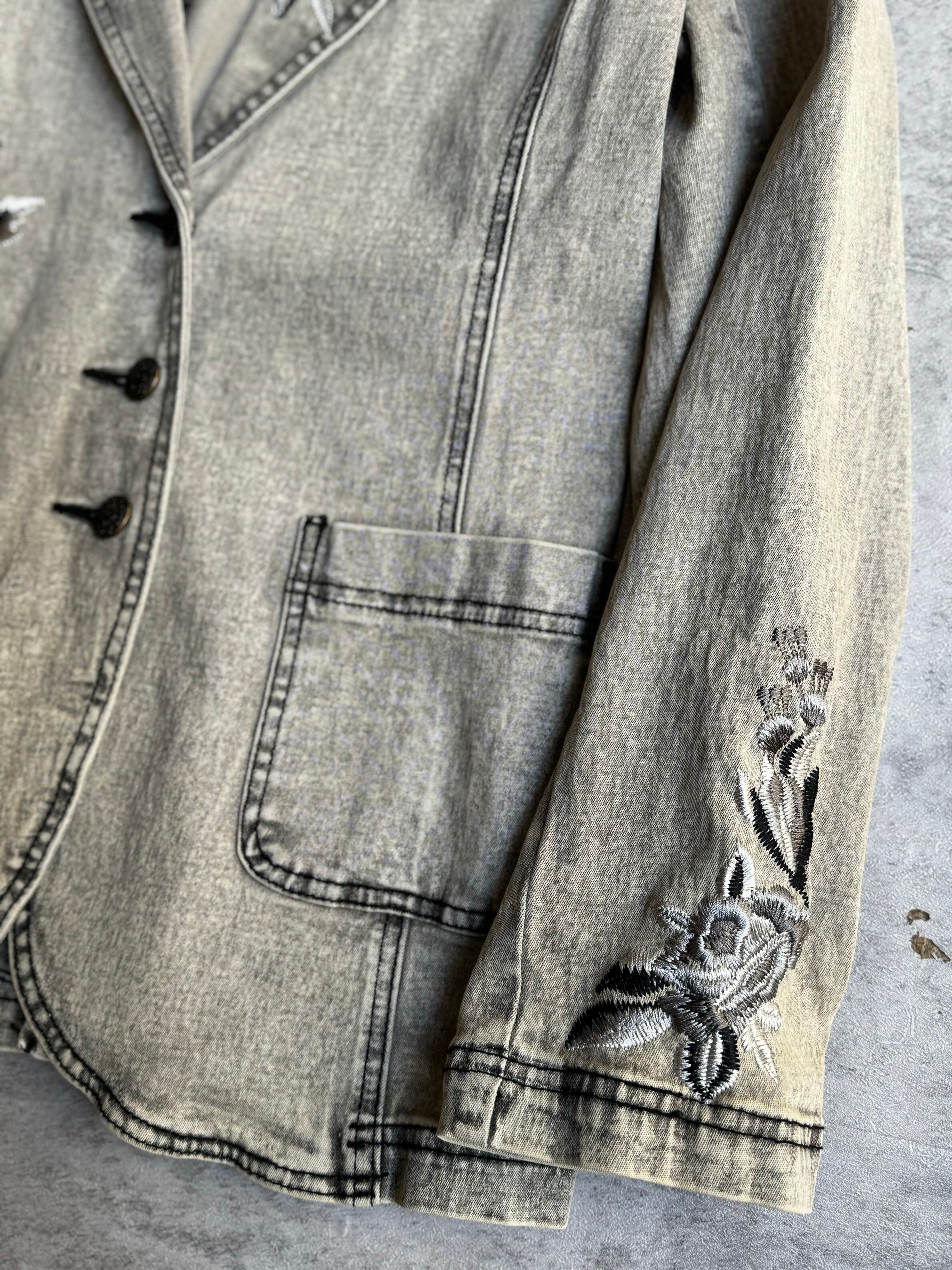 フェード加工のような淡い柔らかなボディに、花々の刺繍がこだわりあるデザインジャケット‼️
