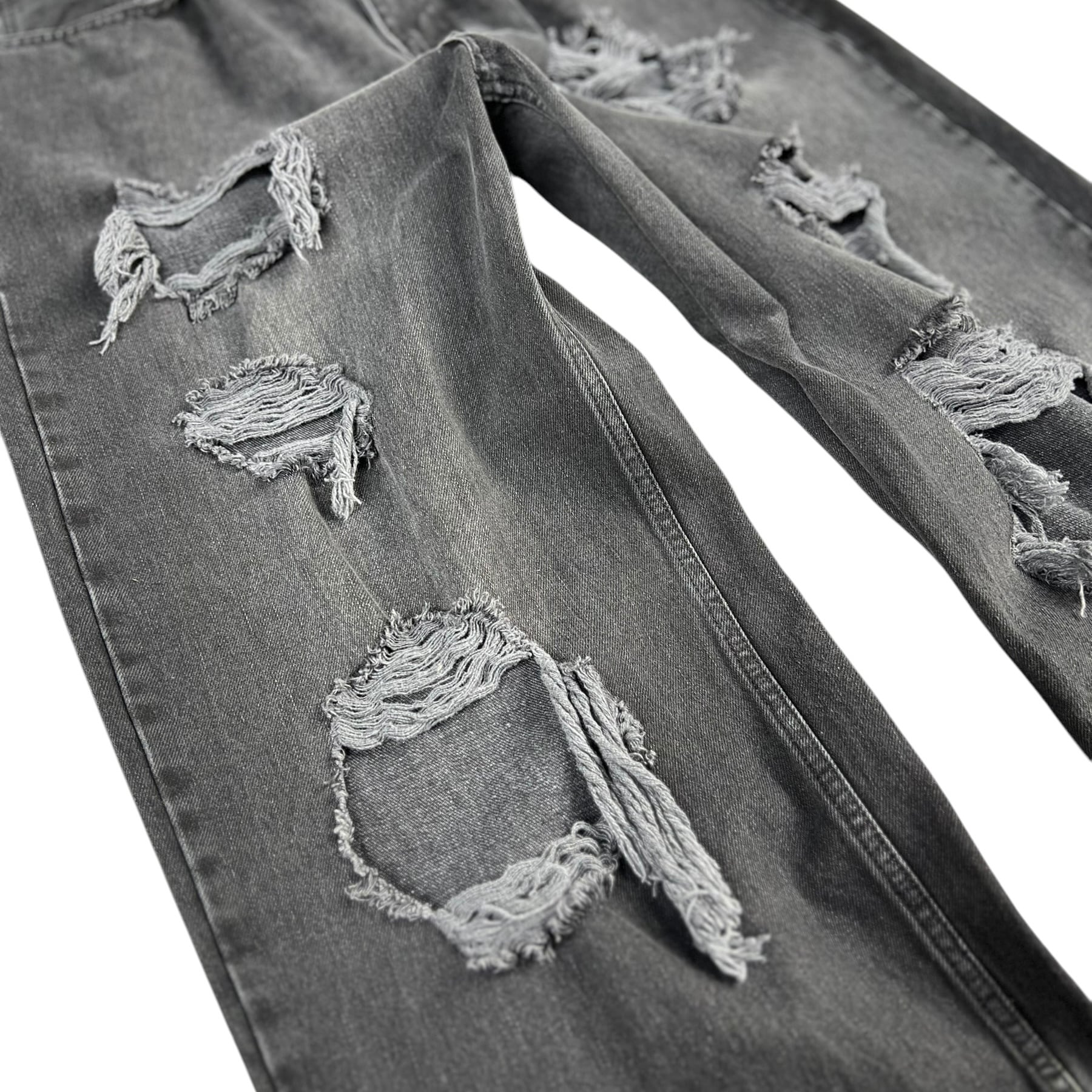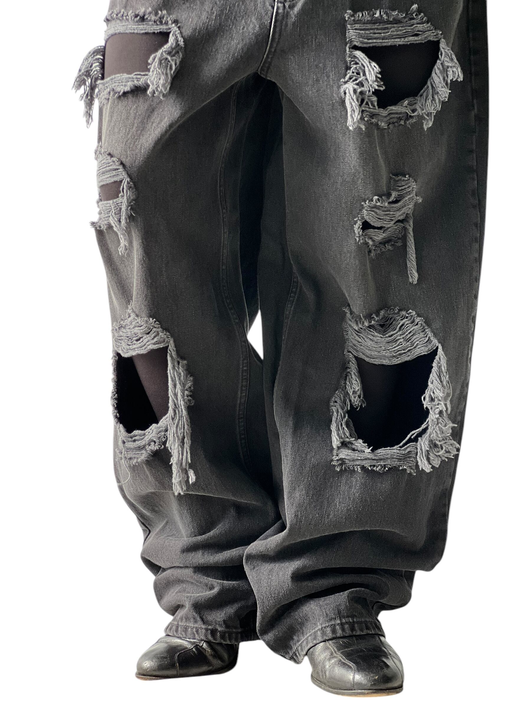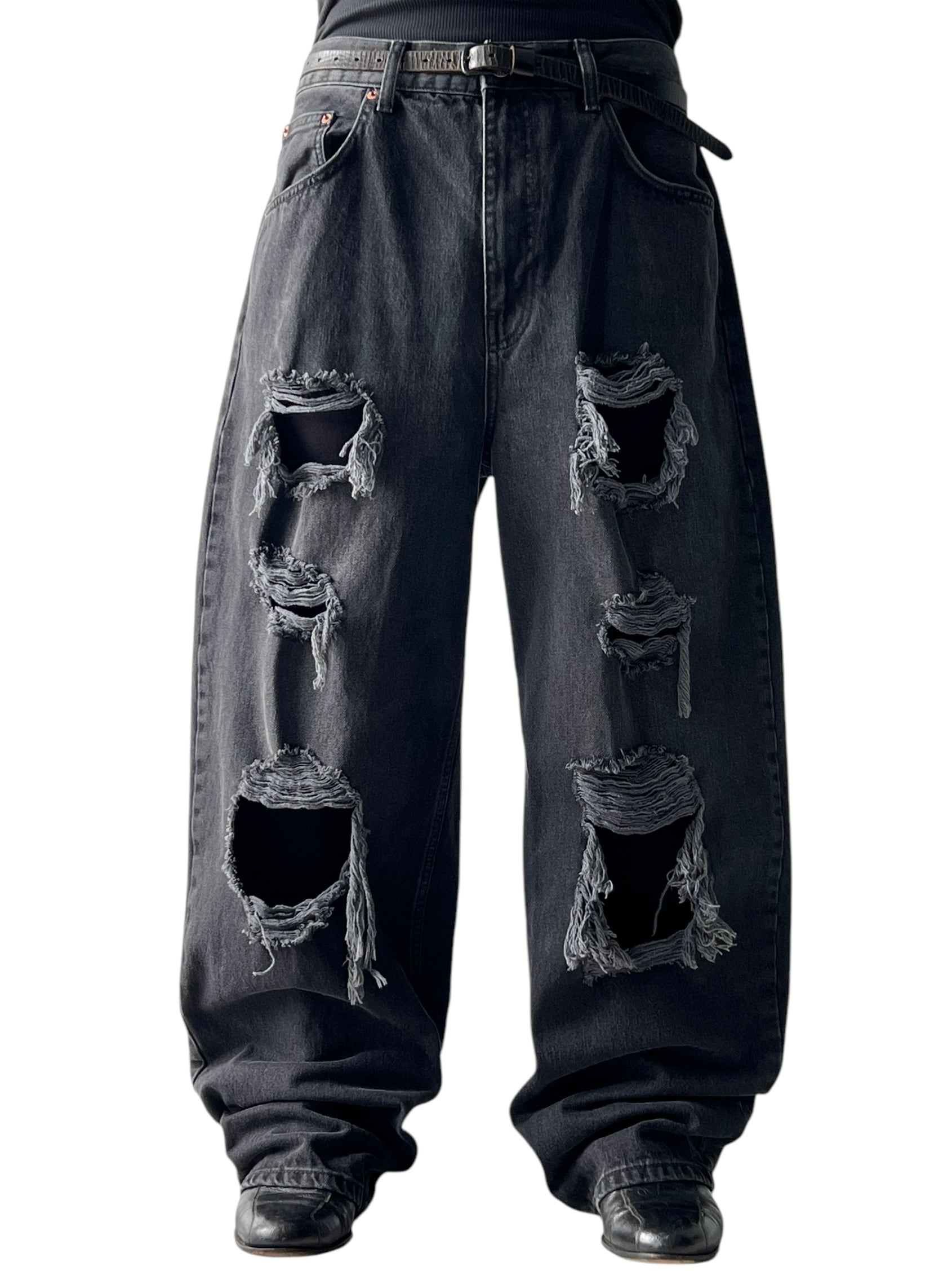 最初からクラッシュ加工が施されたデザインで先染めのブラックデニムパンツ❗️