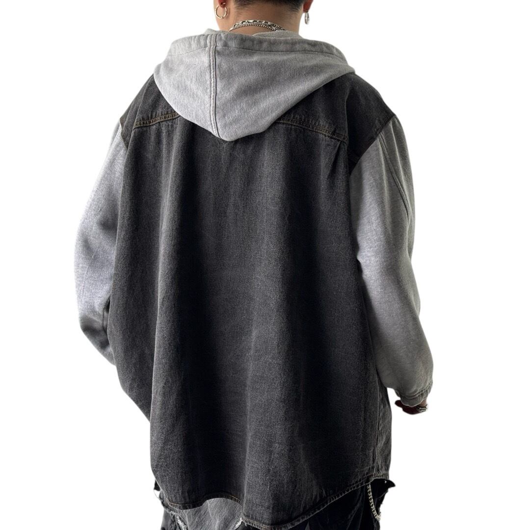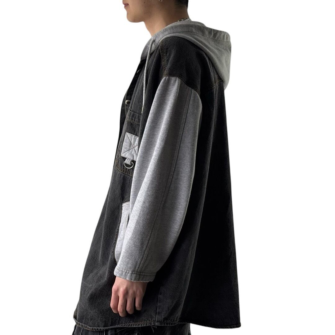 デニムシャツのボディに、フードが取り付けられ、袖が切り替えでパーカーの袖になっているうなデザイン‼️