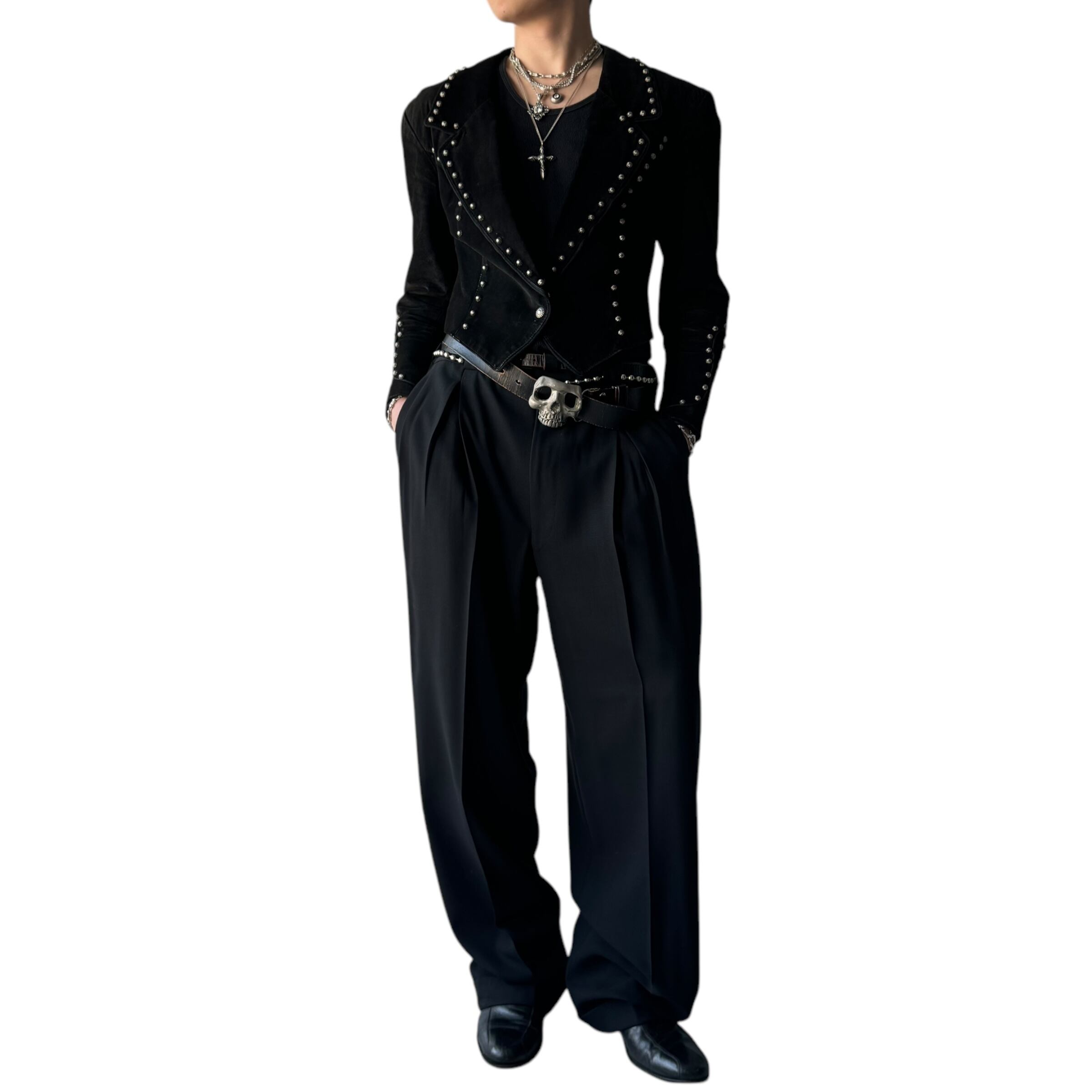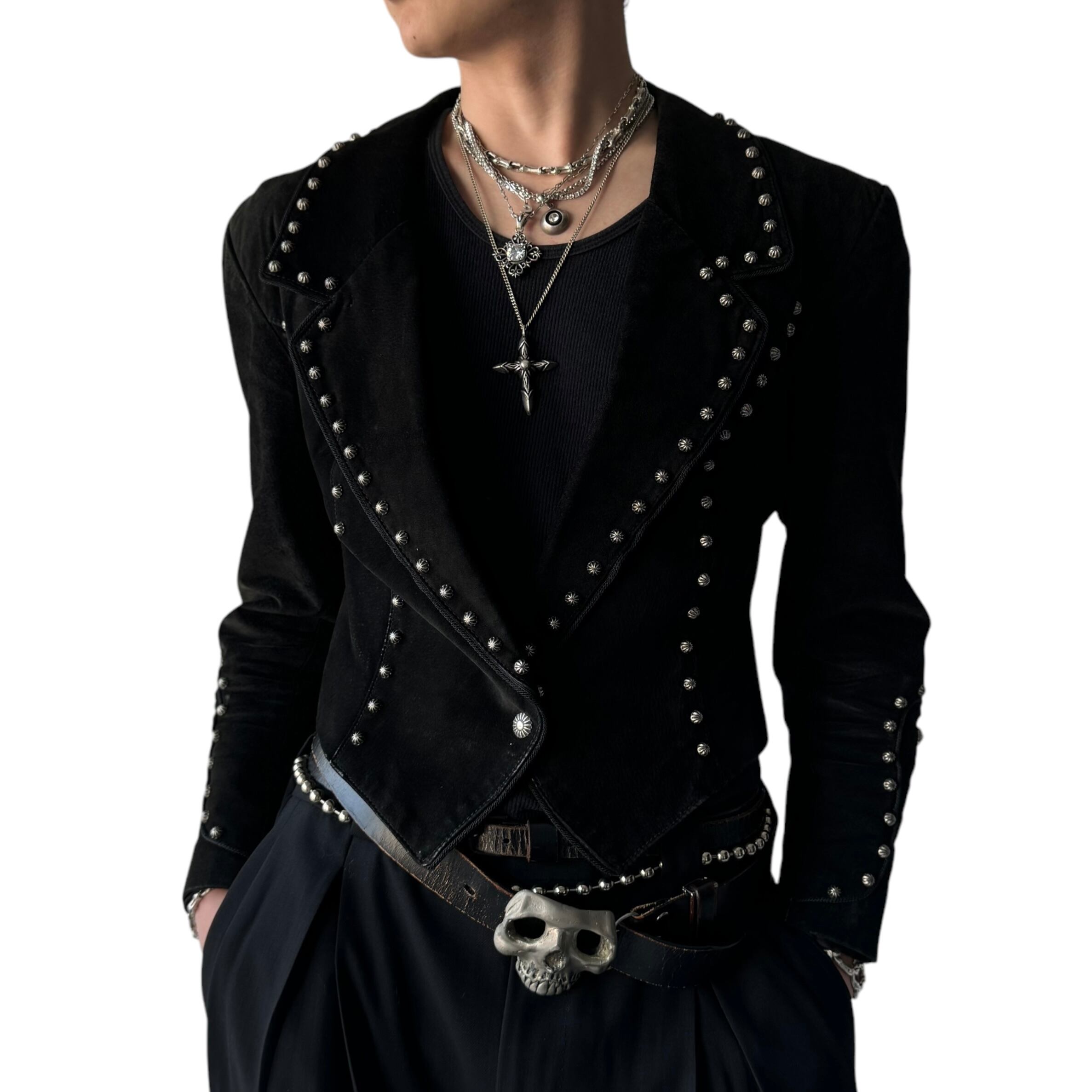 フロントから両袖、背面にスタッズが打ち込まれた目を引くデザインとなっており、さらにはウエストをギュんとシェイプさせたシルエットが圧倒的クールな1着✨️