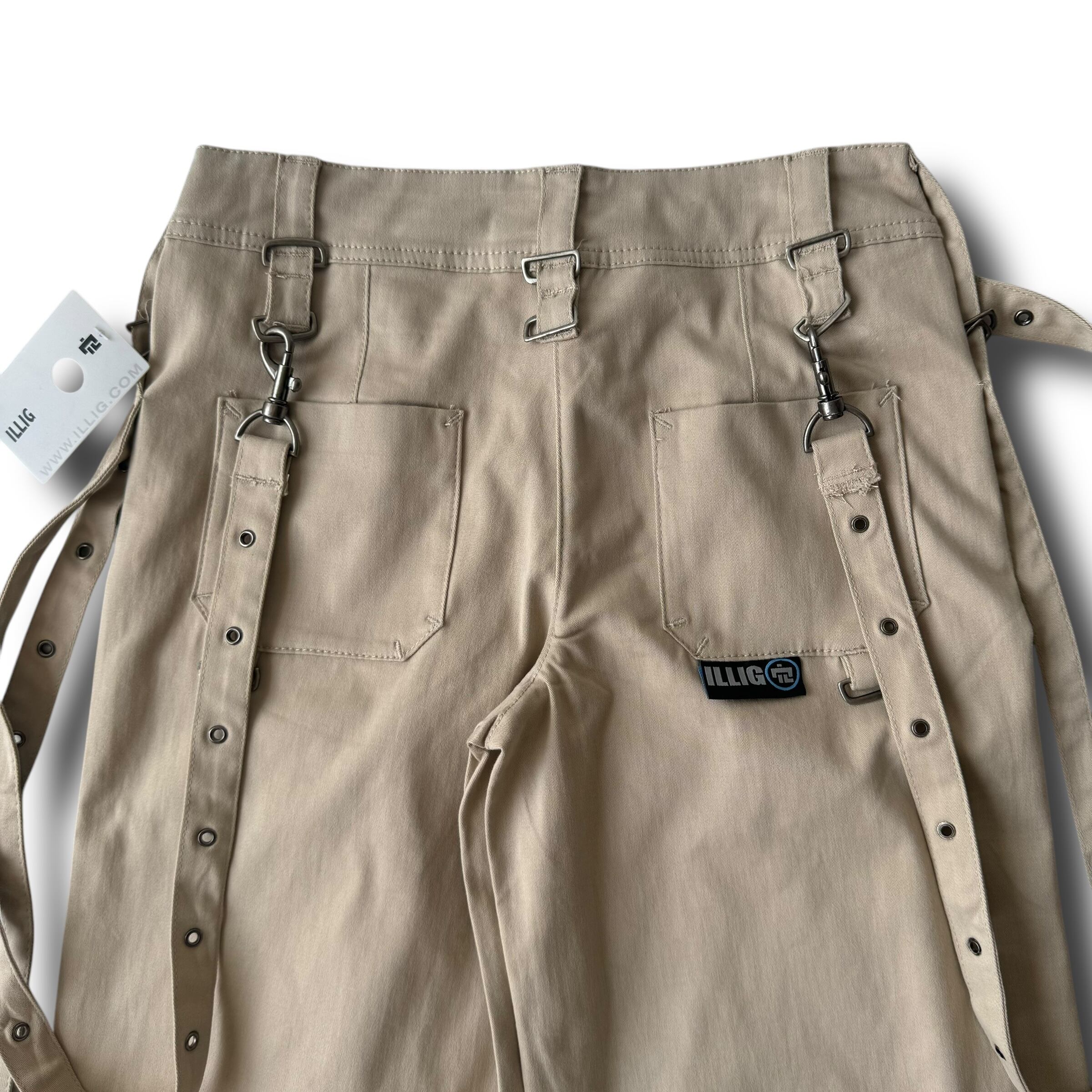 要所にアジャスタブルベルト付きで両サイドにはベルトがタレるアクセント。両膝にもベルト付きで絞って変形可能◎