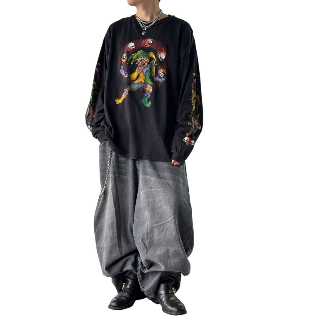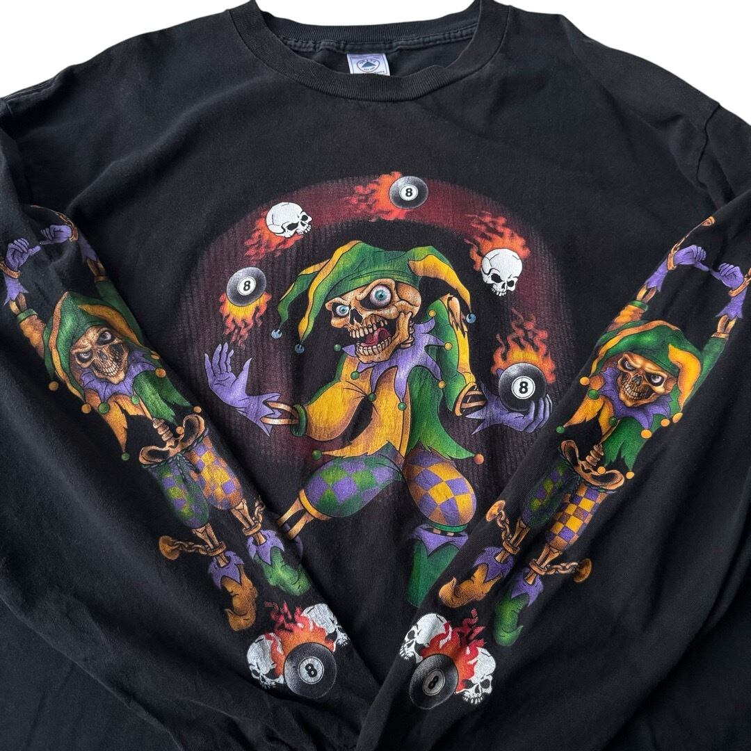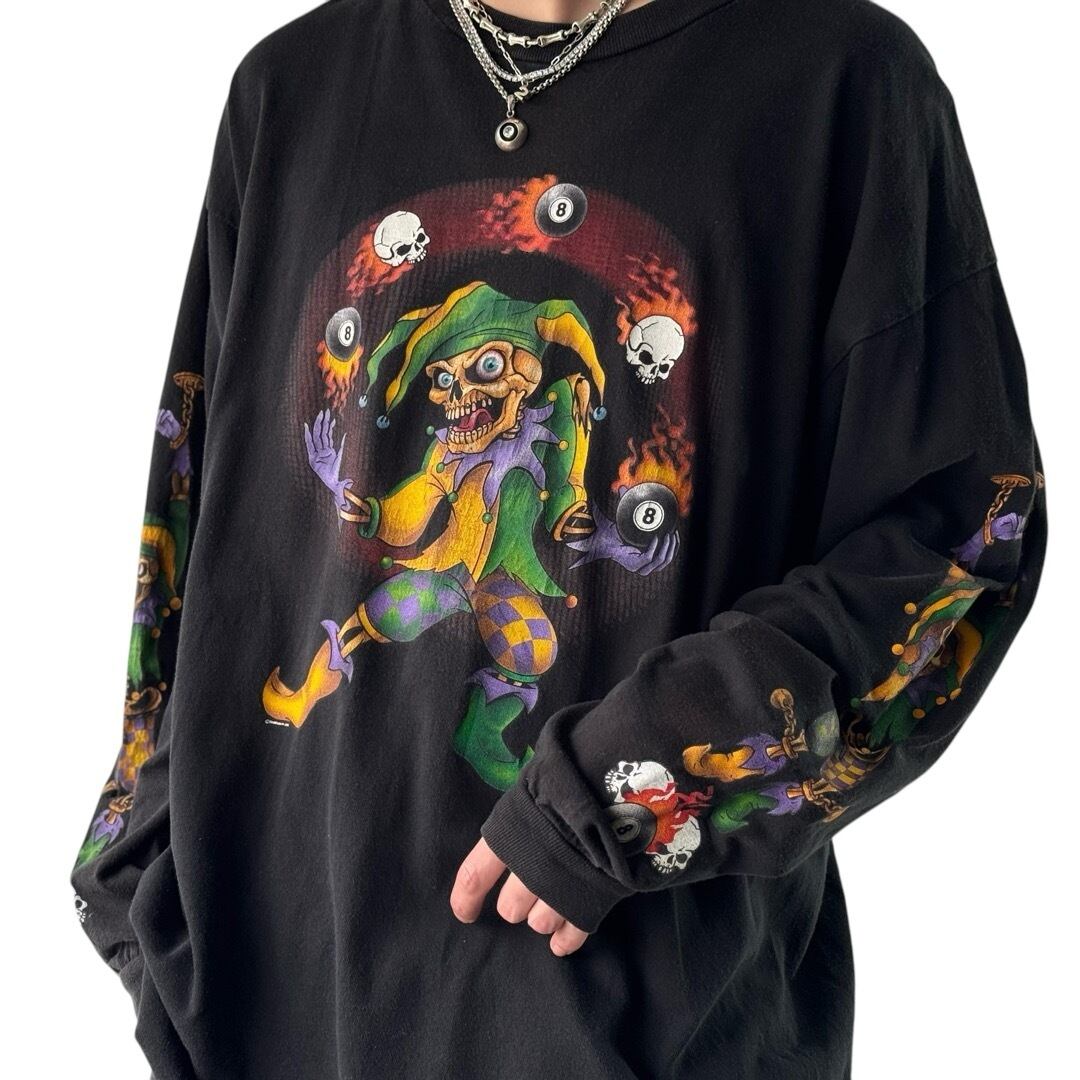 骸骨がピエロのような服を着て骸骨と8ボールを投げているデザインがフロントにプリントされており、両袖には、手枷をつけられた骸骨ピエロがプリントされている面白デザイン‼️‼️‼️