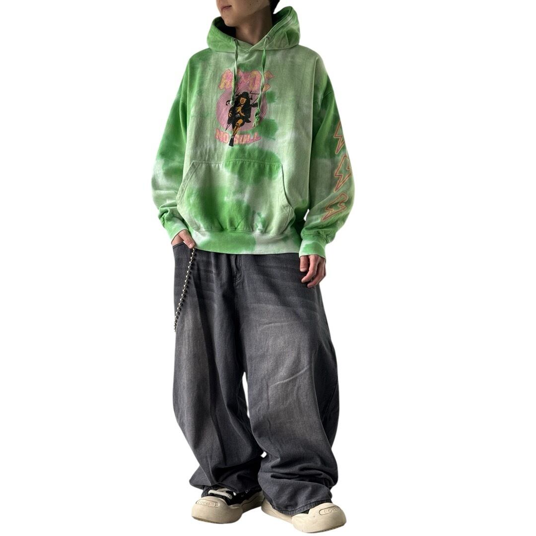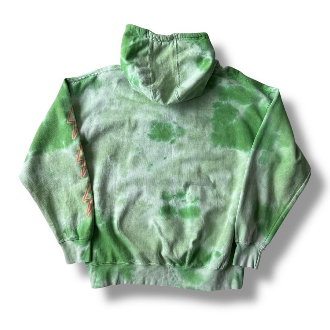 白ボディのパーカーに緑でタイダイ染めがされており、元のピンクのプリントが際立って可愛らしい感じ✨️‼️