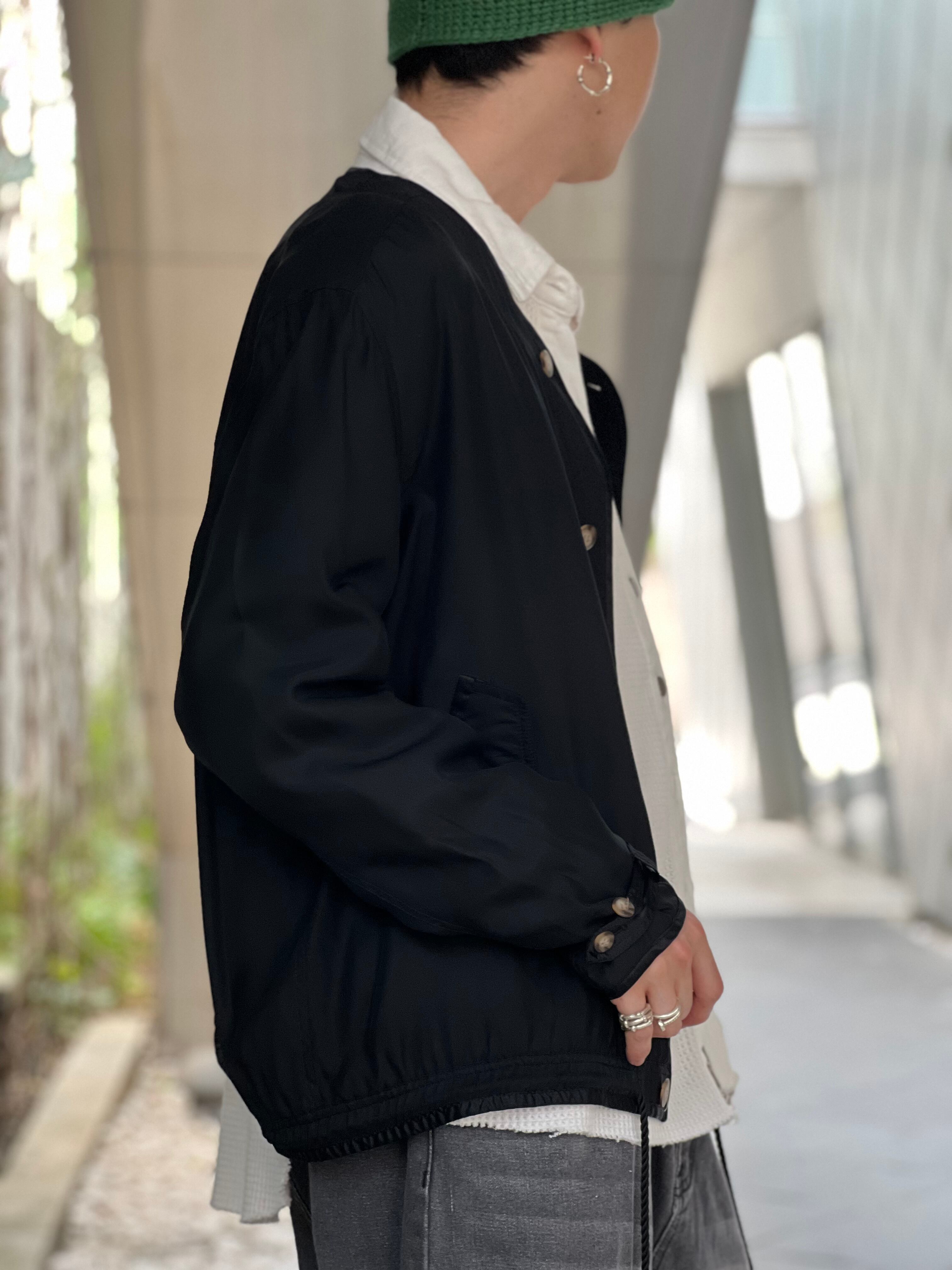 ノーカラーデザインなので、デニムジャケットやシャツなどの上から羽織り襟を出して着るのもgood◎