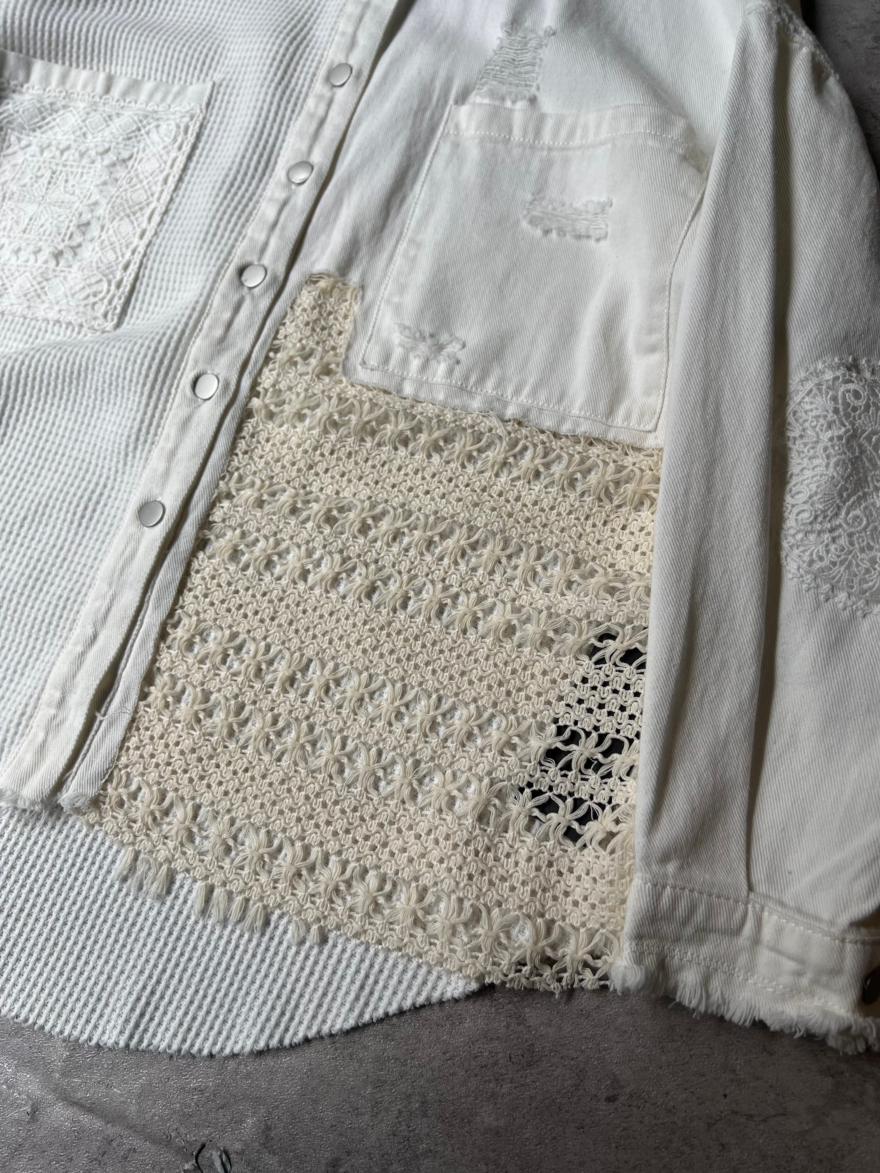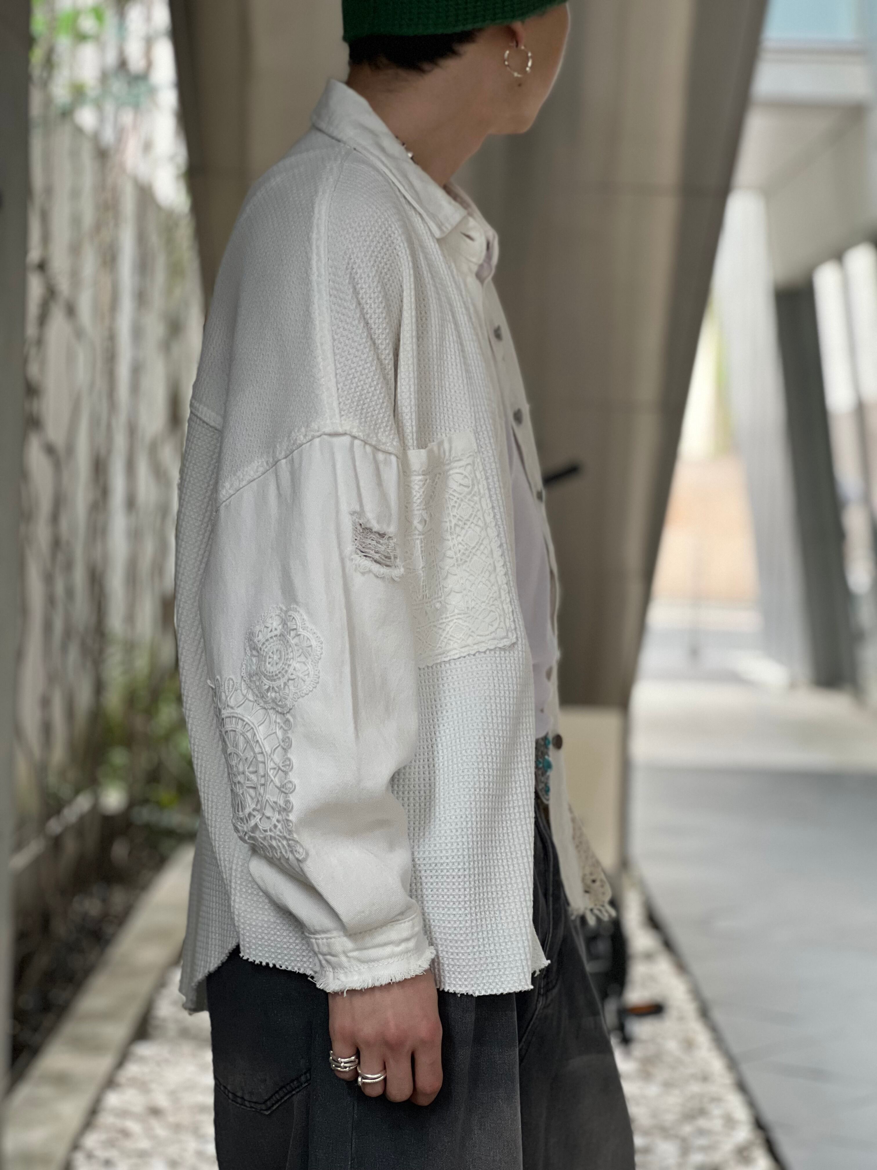レースのエルボーパッチが着いてあったり、背面に大きくレースが張りつけられていて真ん中にパールまで付けられていて一見真っ白な服ですが、変わったデザインのジャケット✨️✨️