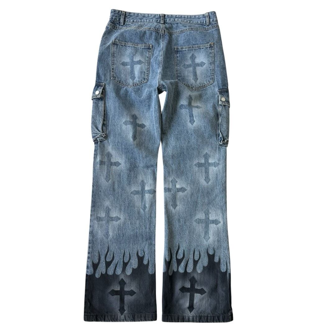 スプレーでクロスのデザインが全体にされているカーゴデニムパンツ✨️✨️