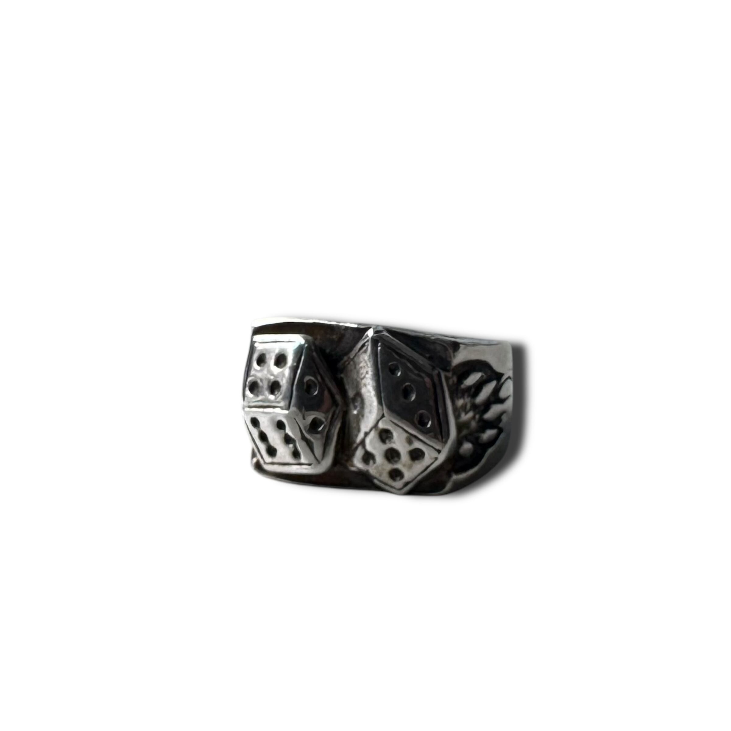 センターにサイコロのモチーフ、サイドにファイヤーの彫り込みを施したデザイン性文句なしのシルバーリングの入荷‼️