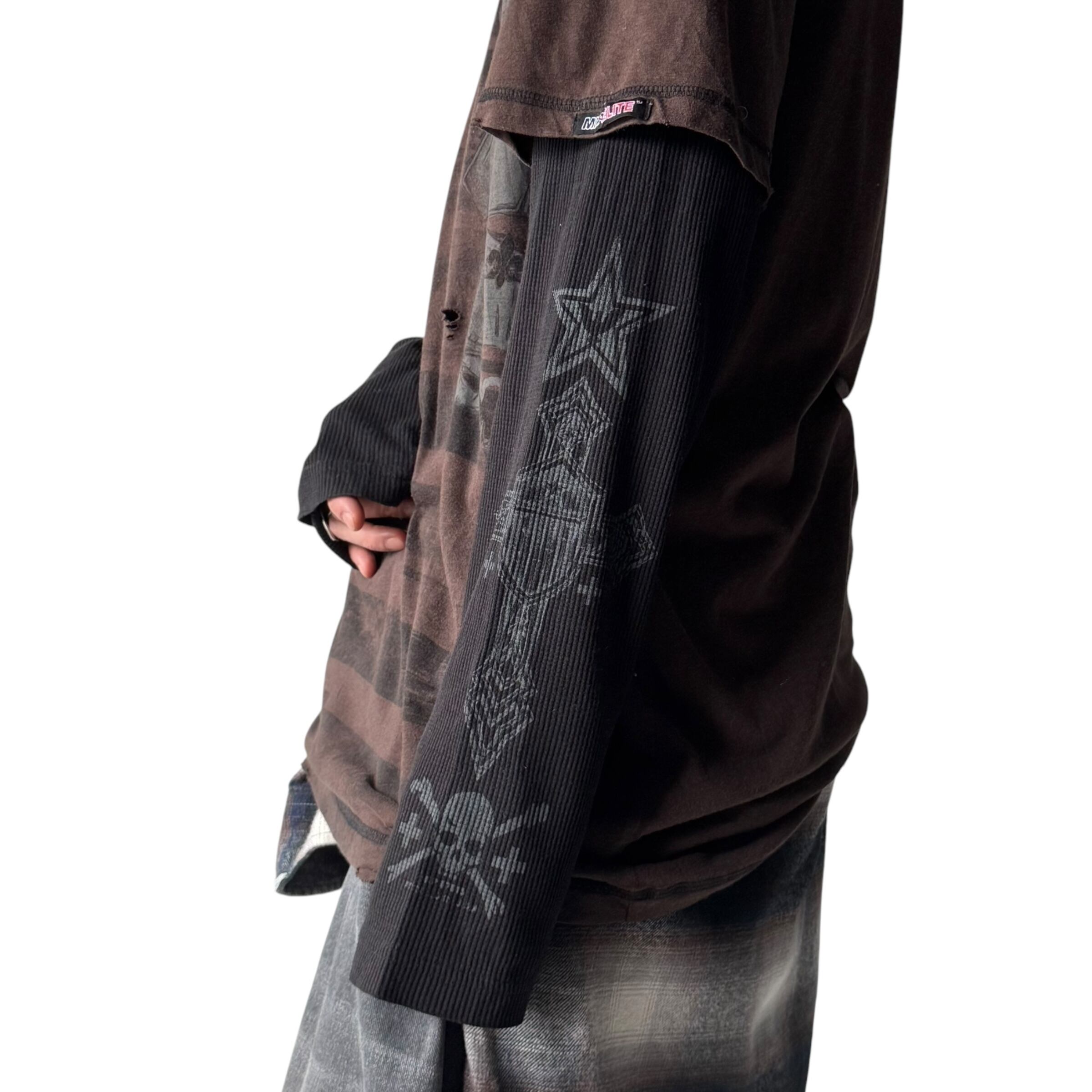 ダメージ加工を施したスカルプリントデザインTeeにサーマルスリーブがドッキングしたレイヤードロングスリーブTEE‼️