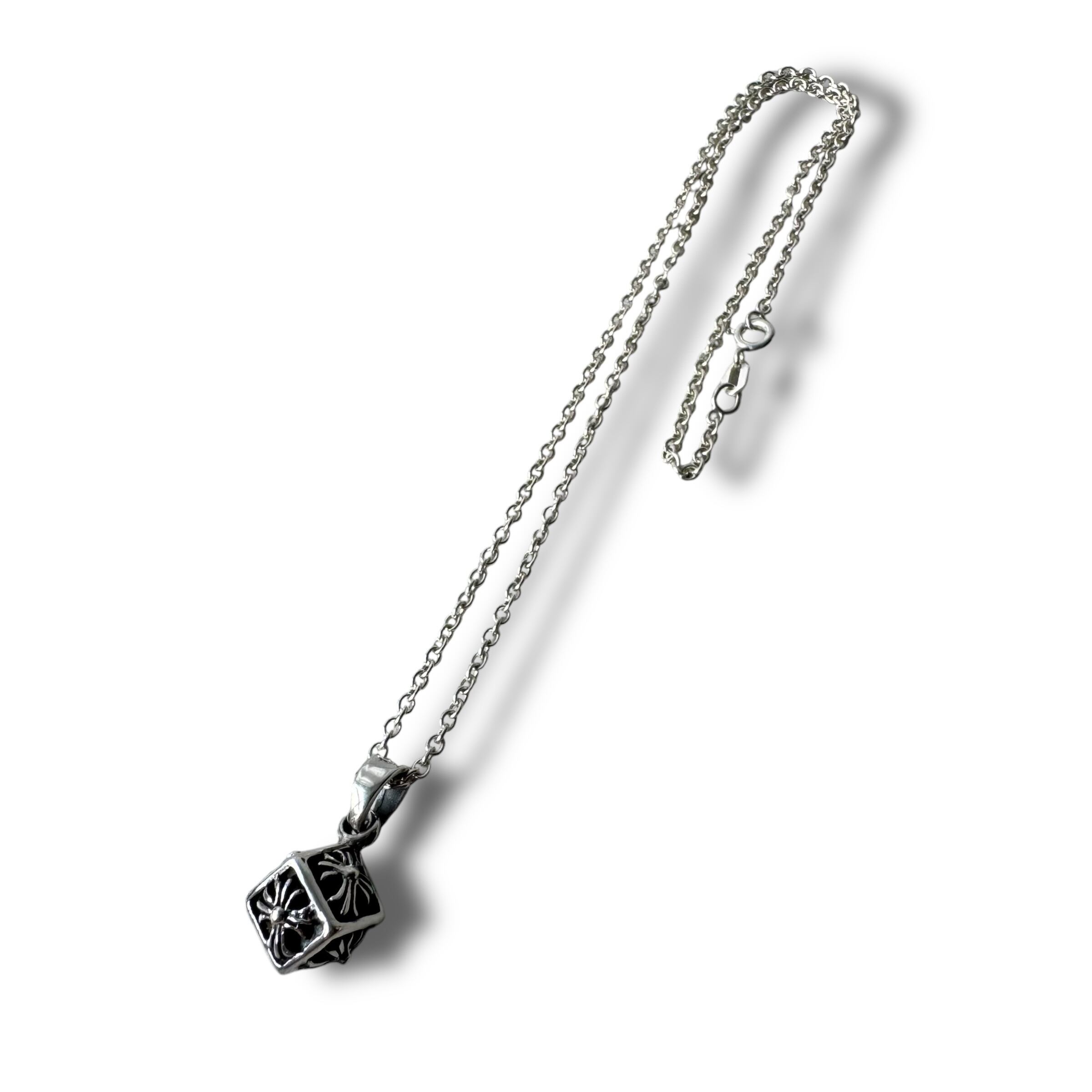 立体的なキューブの中にクロスデザインが施されたインパクト抜群なシルバーネックレス‼️