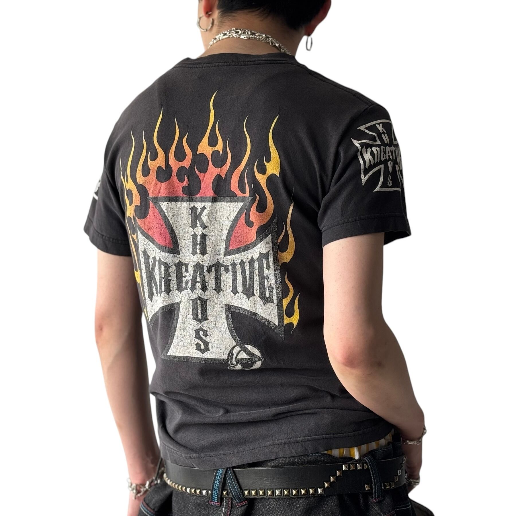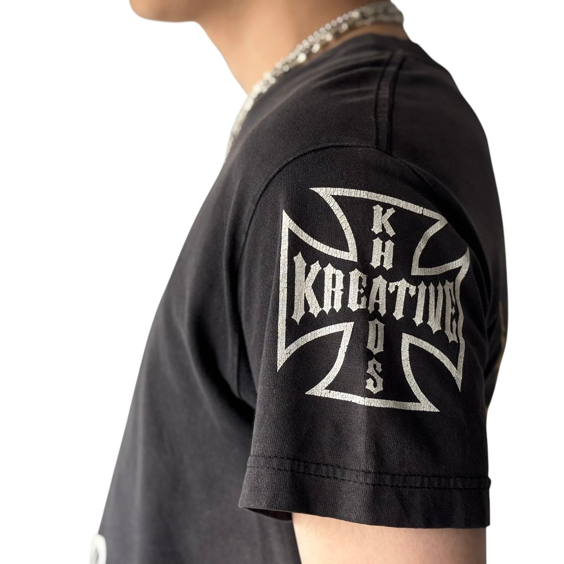 背面と両袖にブランドなどでもサンプリングされているアイアンクロスがプリントされており、前面にはオールドイングリッシュでKHAOSとプリントされていている今大人気モチーフ詰め合わせTシャツ✨✨