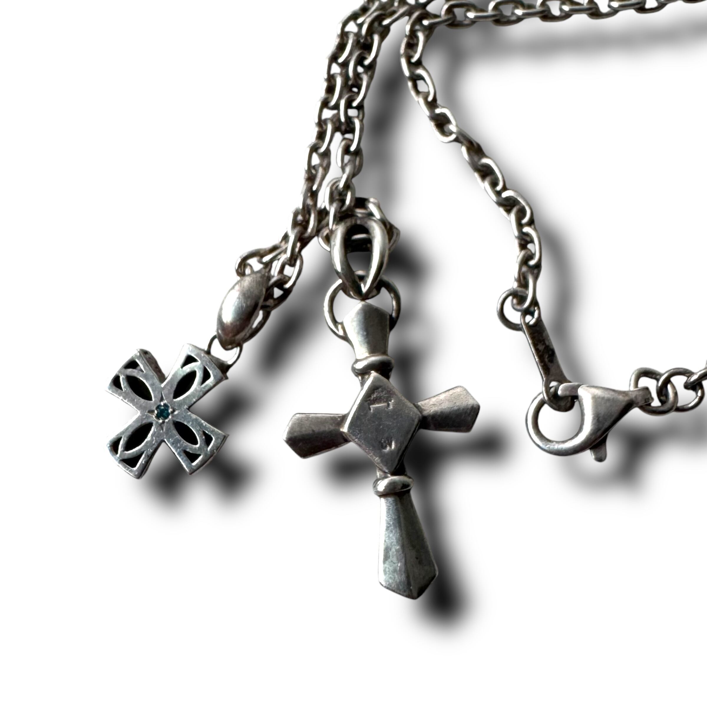 ペンダントトップがふたつも着いておりデカ目のなクロスの方は中央に小さなクロスを飼っていて、小さめの方のトップには真ん中にちょこんと水色のストーンがさりげなく留められているデザイン‼️✨