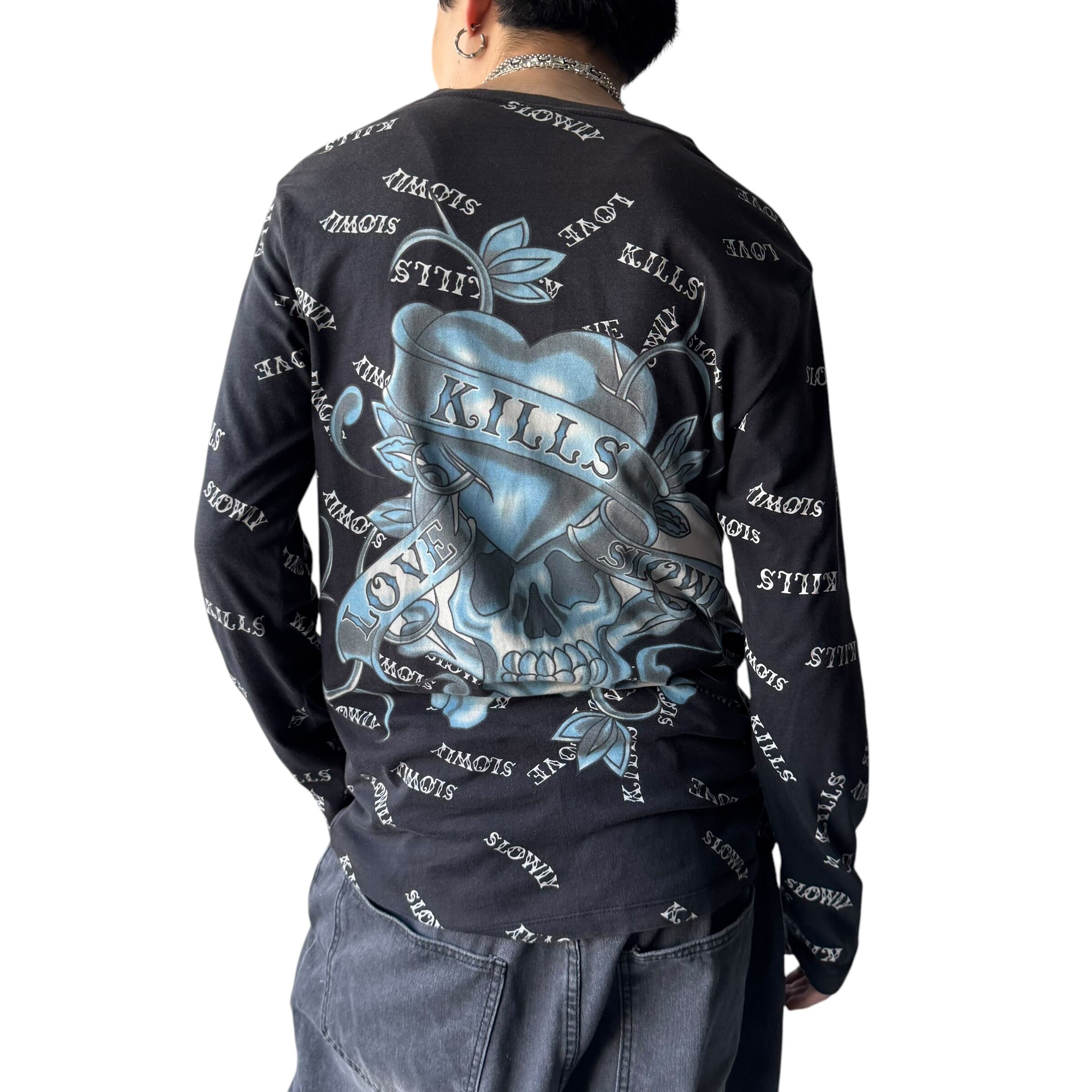 全体に"LOVE" "KILLS" "SLOWLY"とデザインされておりその上から前面と背面にTHEエドハーディーな骸骨がプリントされており、前面の骸骨の方にはジャラジャララインストーン爆盛り‼️‼️