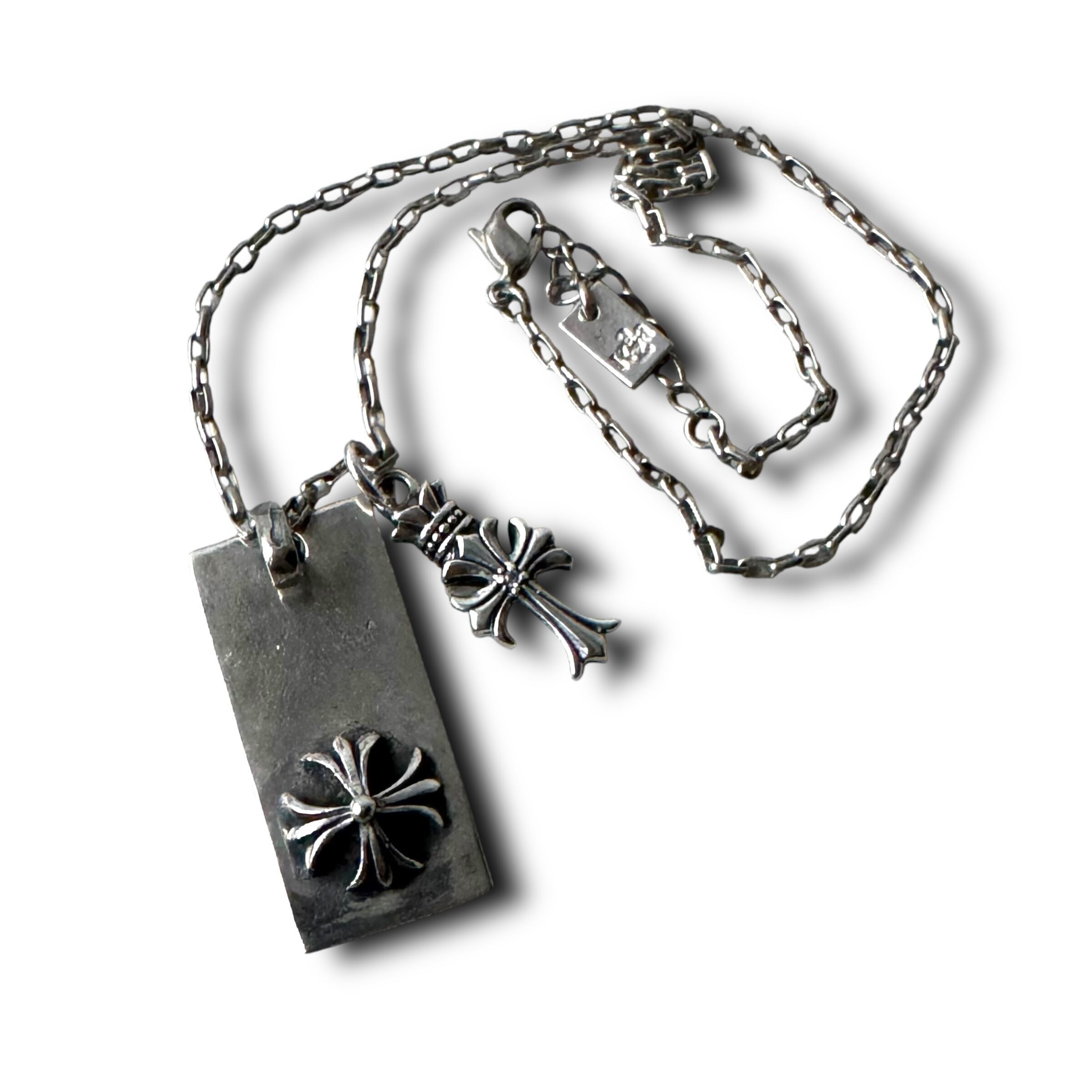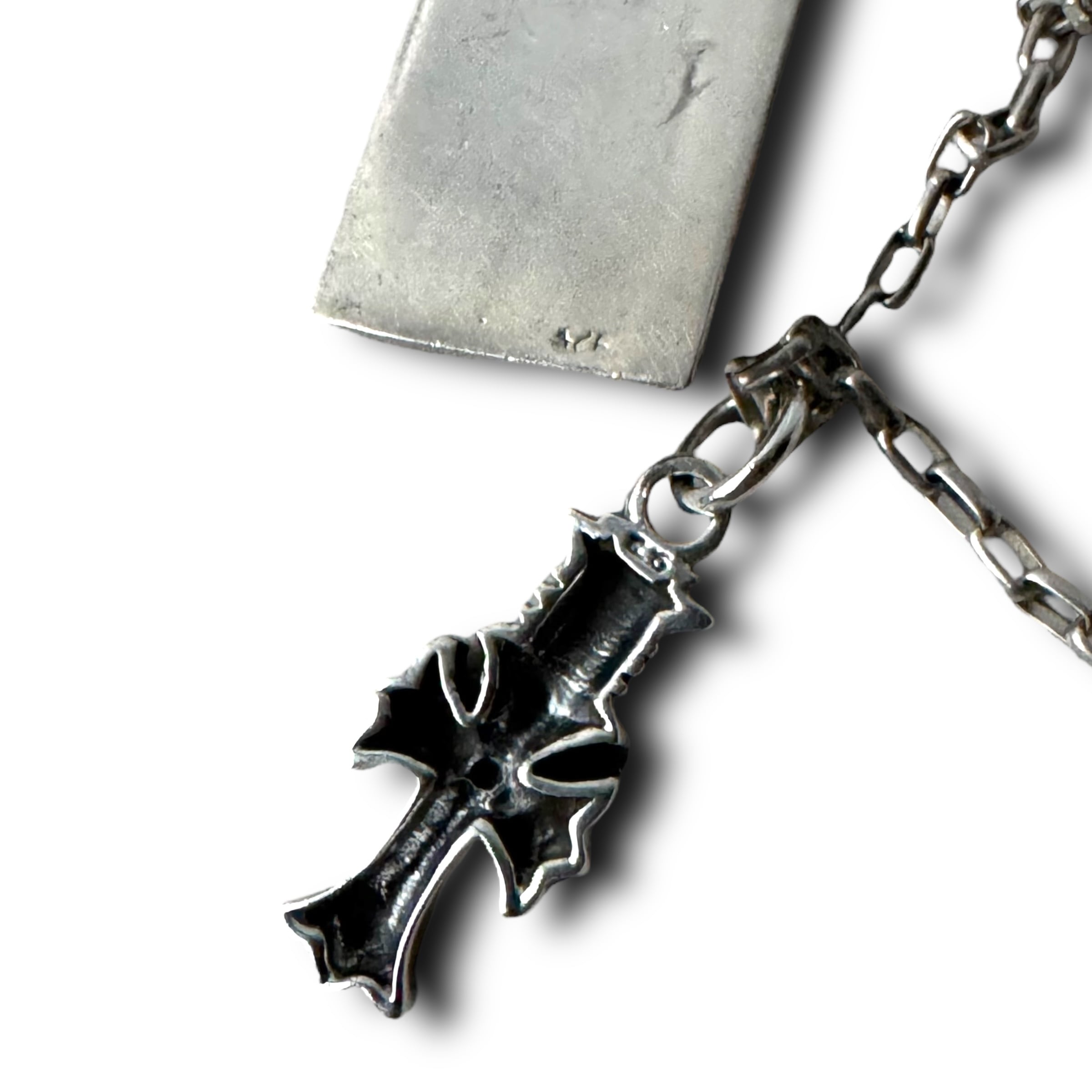 プレートにクロスのモチーフとクロスチャームをあしらったデザインシルバーネックレス。
