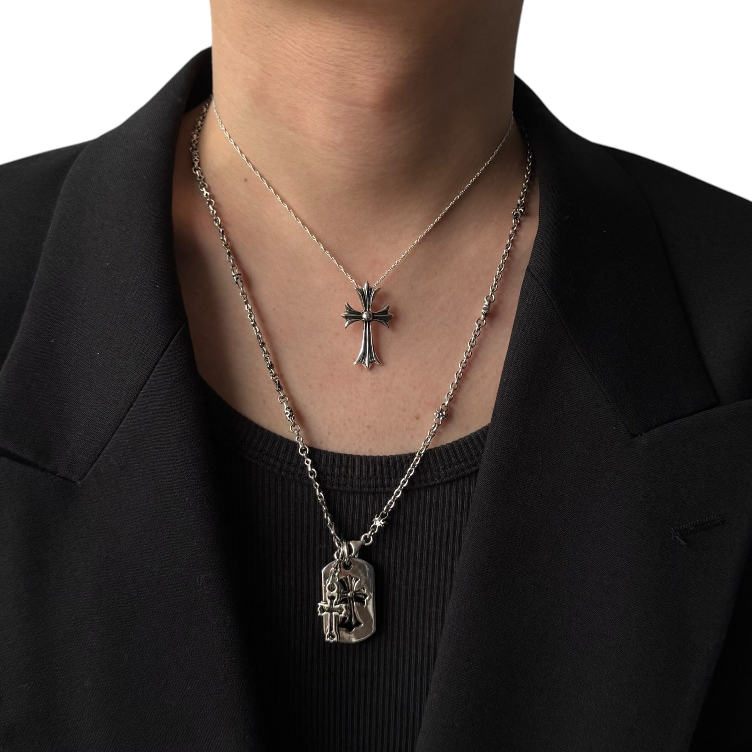 クロスの形に切り抜かれたドッグタグとそれに合わせて同じ大きさのクロスが着いており、2つもトップが着いた贅沢デザイン✨✨