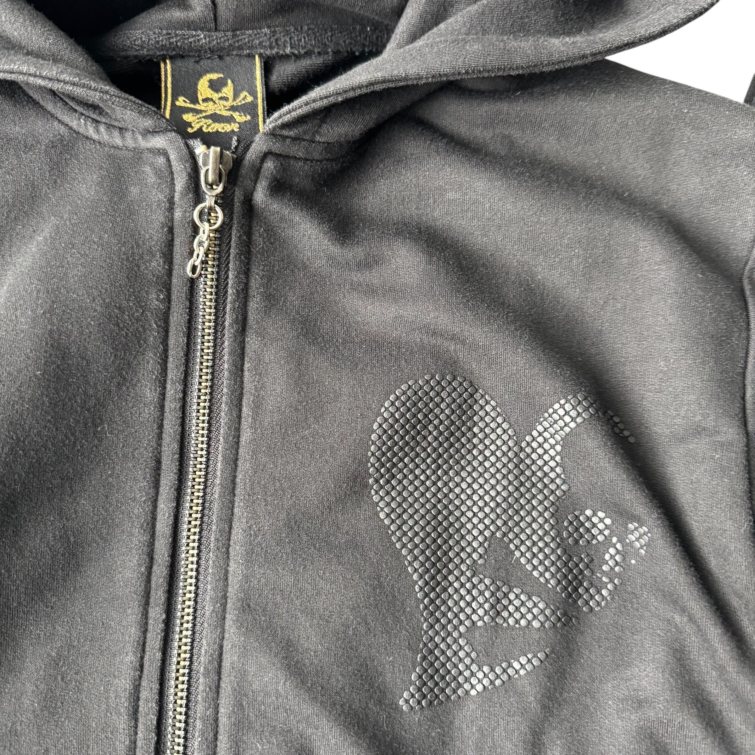上下どちらとも同色プリントがされており、パーカーの方には前面にハートとドクロ、背面にはでかでかとドクロ‼️