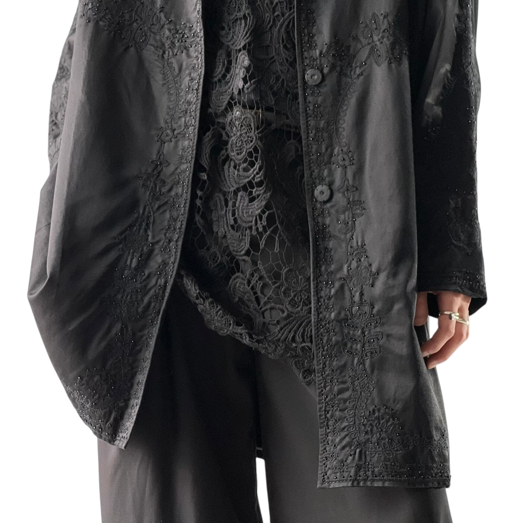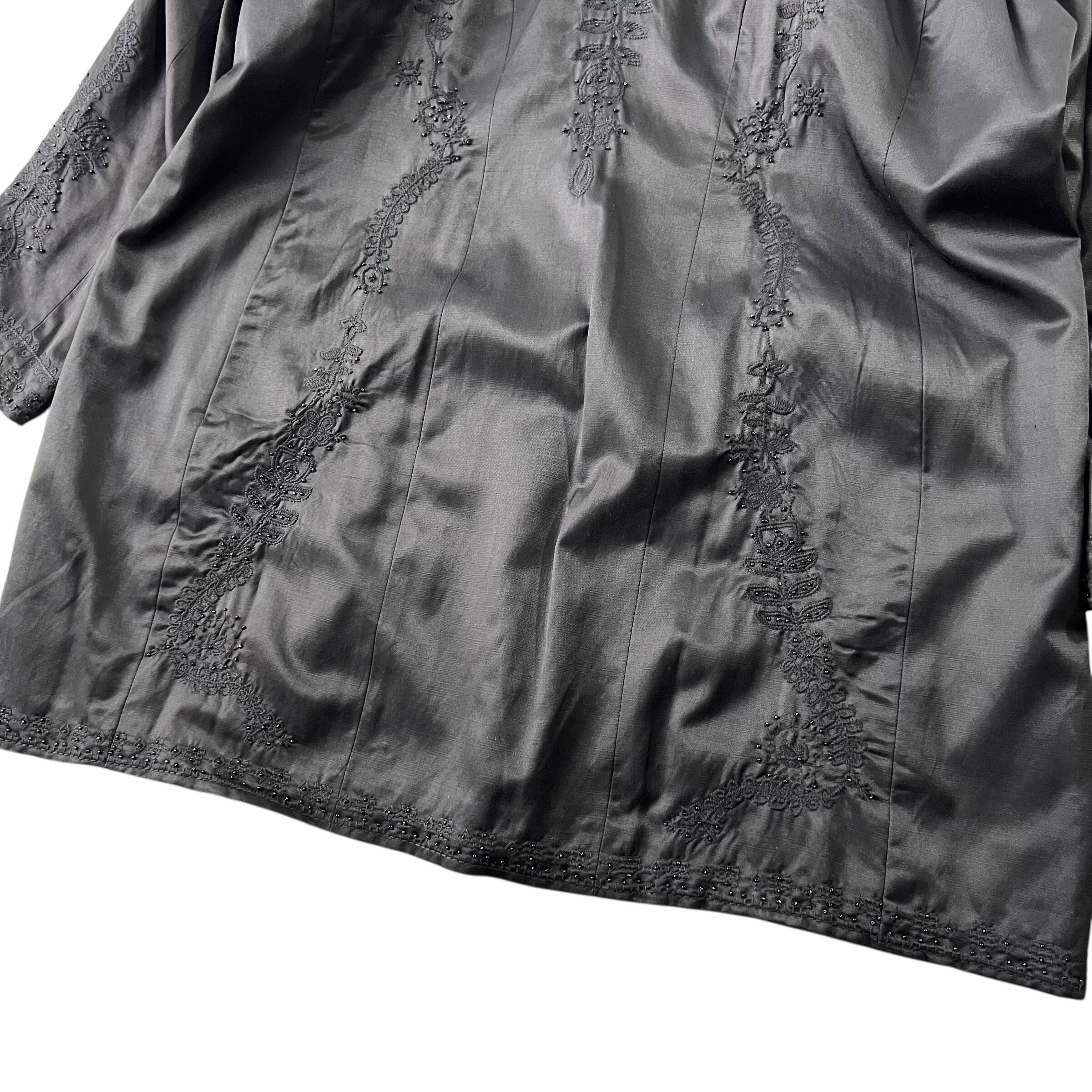 オールブラックで、同色なので派手にならず良い塩梅♡ 刺繍は襟から袖や背中まで360℃、見え方にもお洒落に抜かりなし。