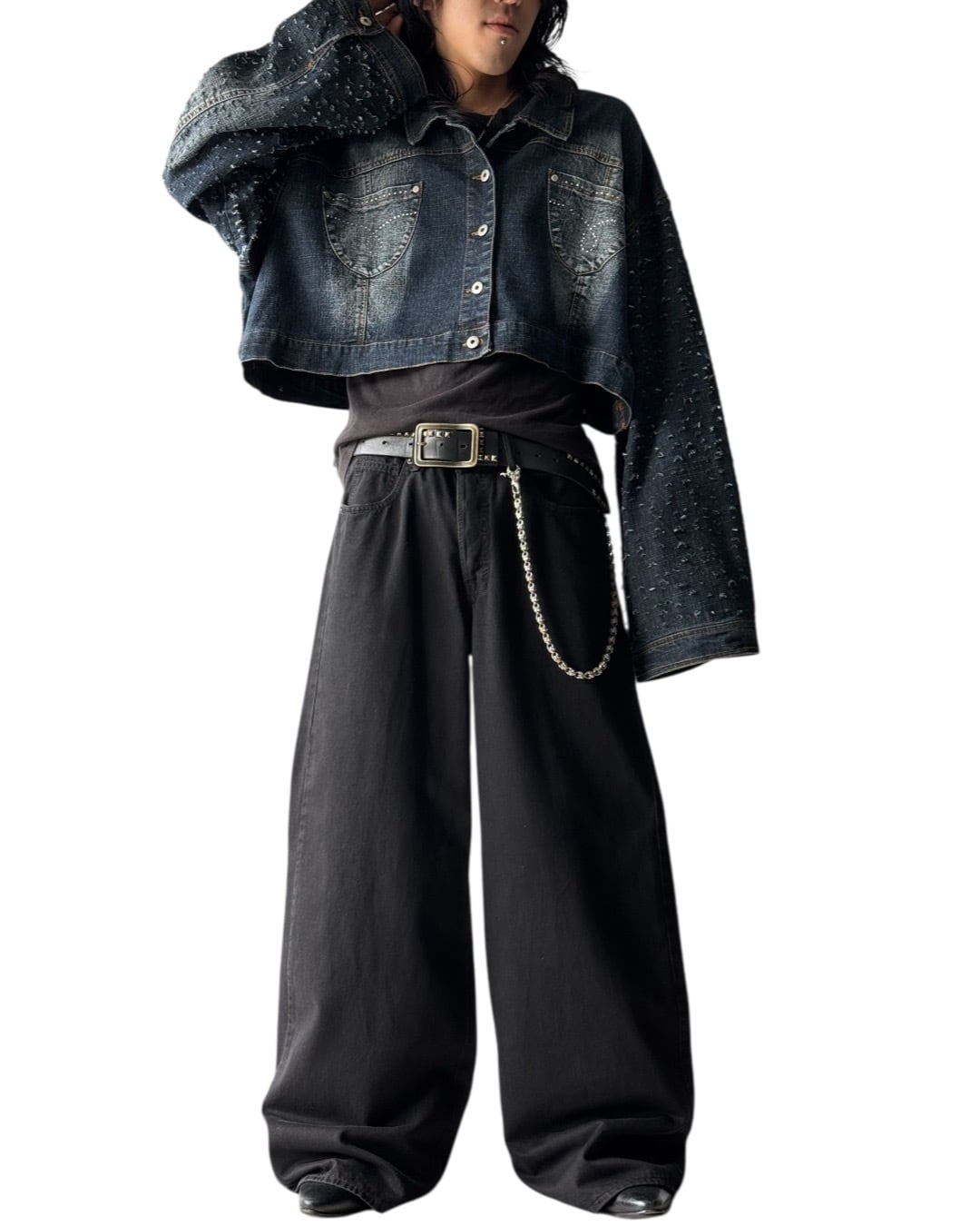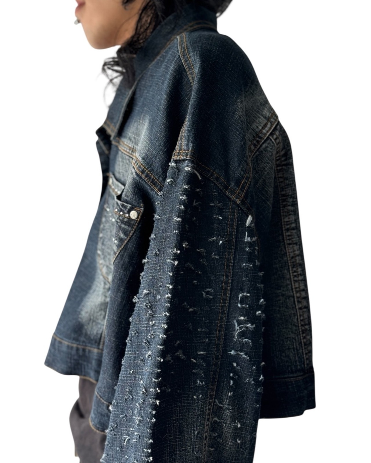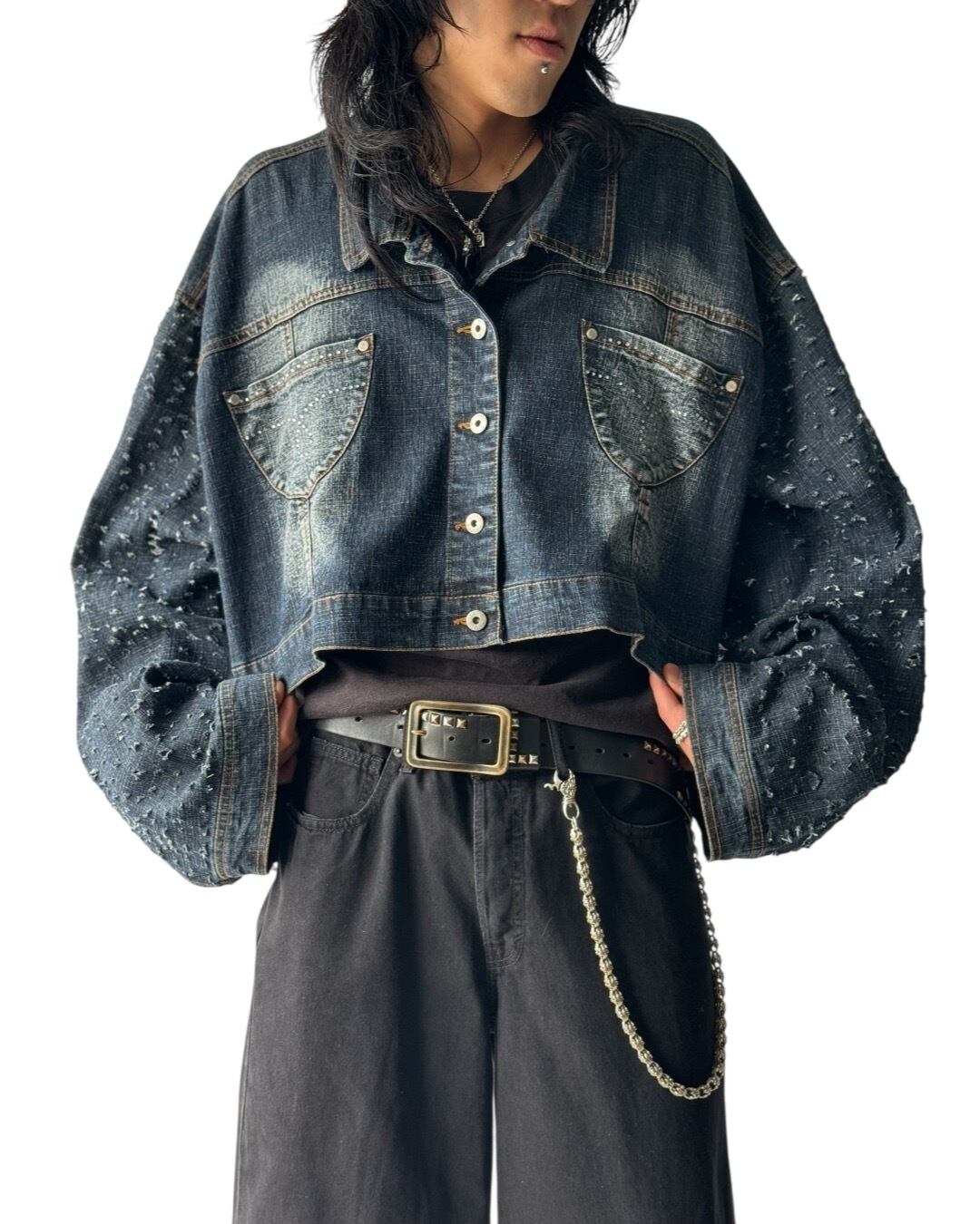 デザイナーズブランドでありそうなかなり短丈で袖がかなり長く、胸ポケットにはラインストーンが着いており、袖にはダメージが入っていて主役級に活躍する1着‼️‼️