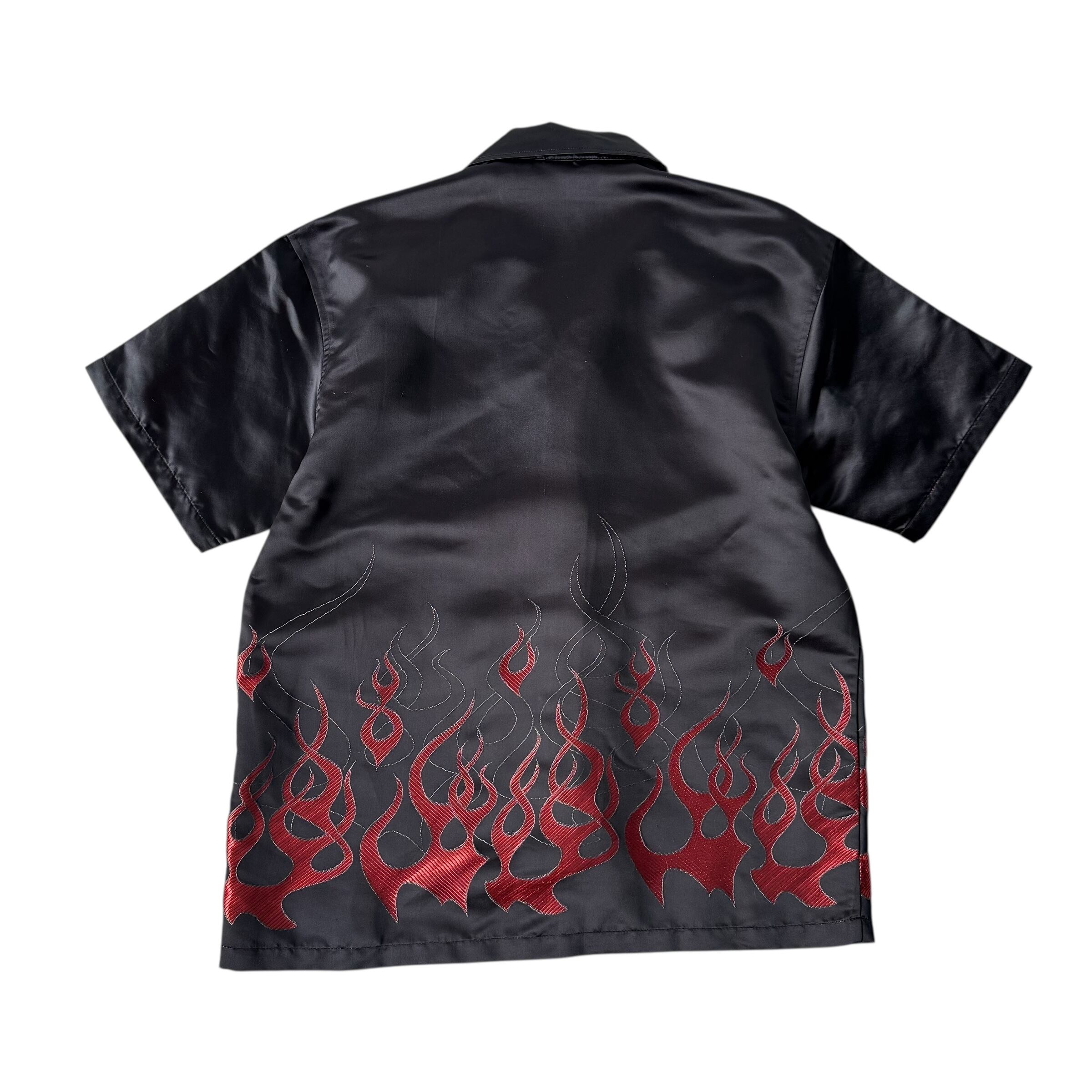 ♾ odo ♾ rayon fire patterned design open collar shirt sizeL