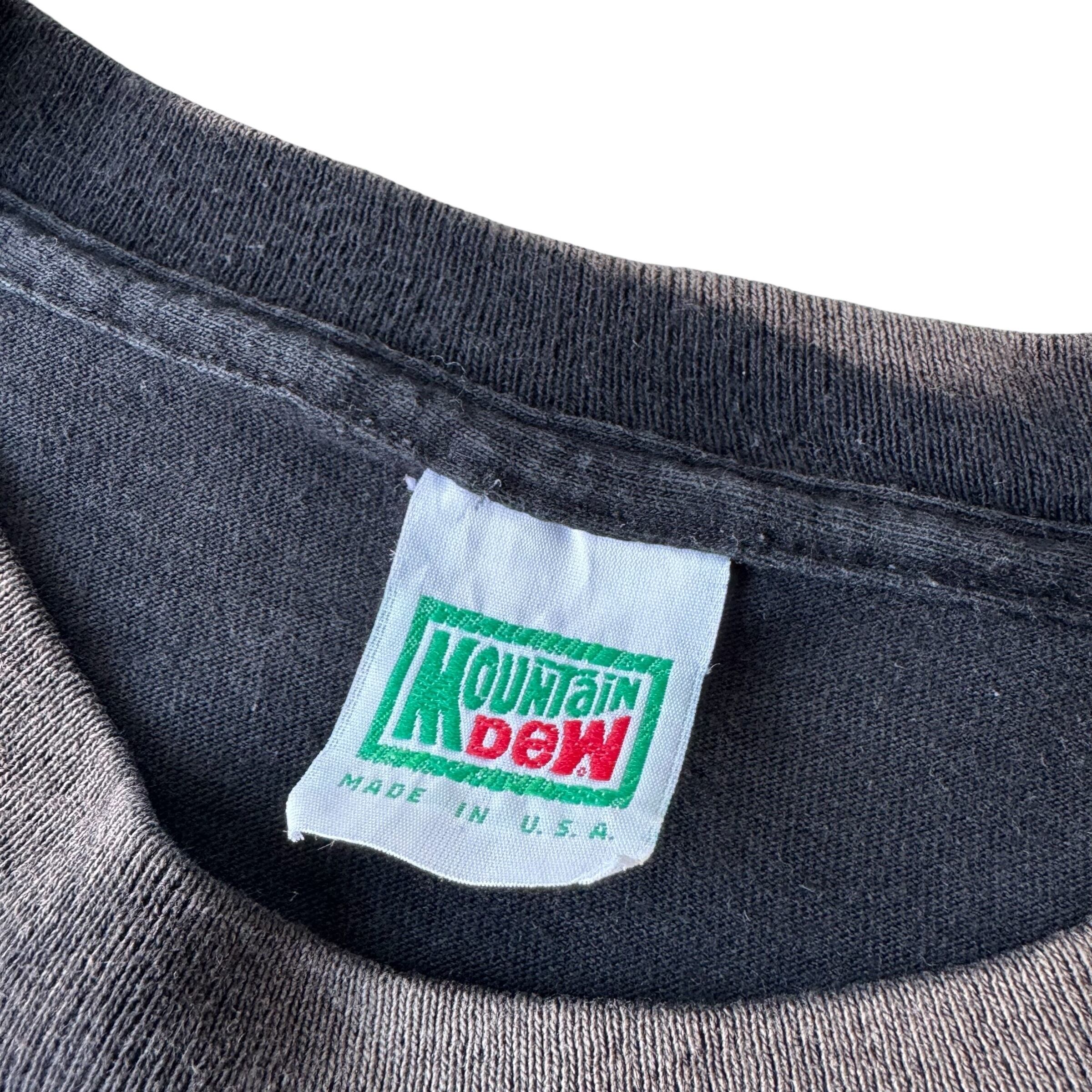 ♾90‘s MOUNTAIN DEW♾ good faded text logo design damage breach custom tee MADE IN USA