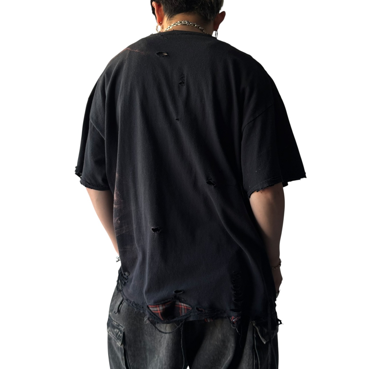 ダメージ部分から覗かせたチェック柄だったり部分的なブリーチ加工、ダーティな感じをお洒落に落とし込んだグランジフェードデザインが唯一無二な1着✨