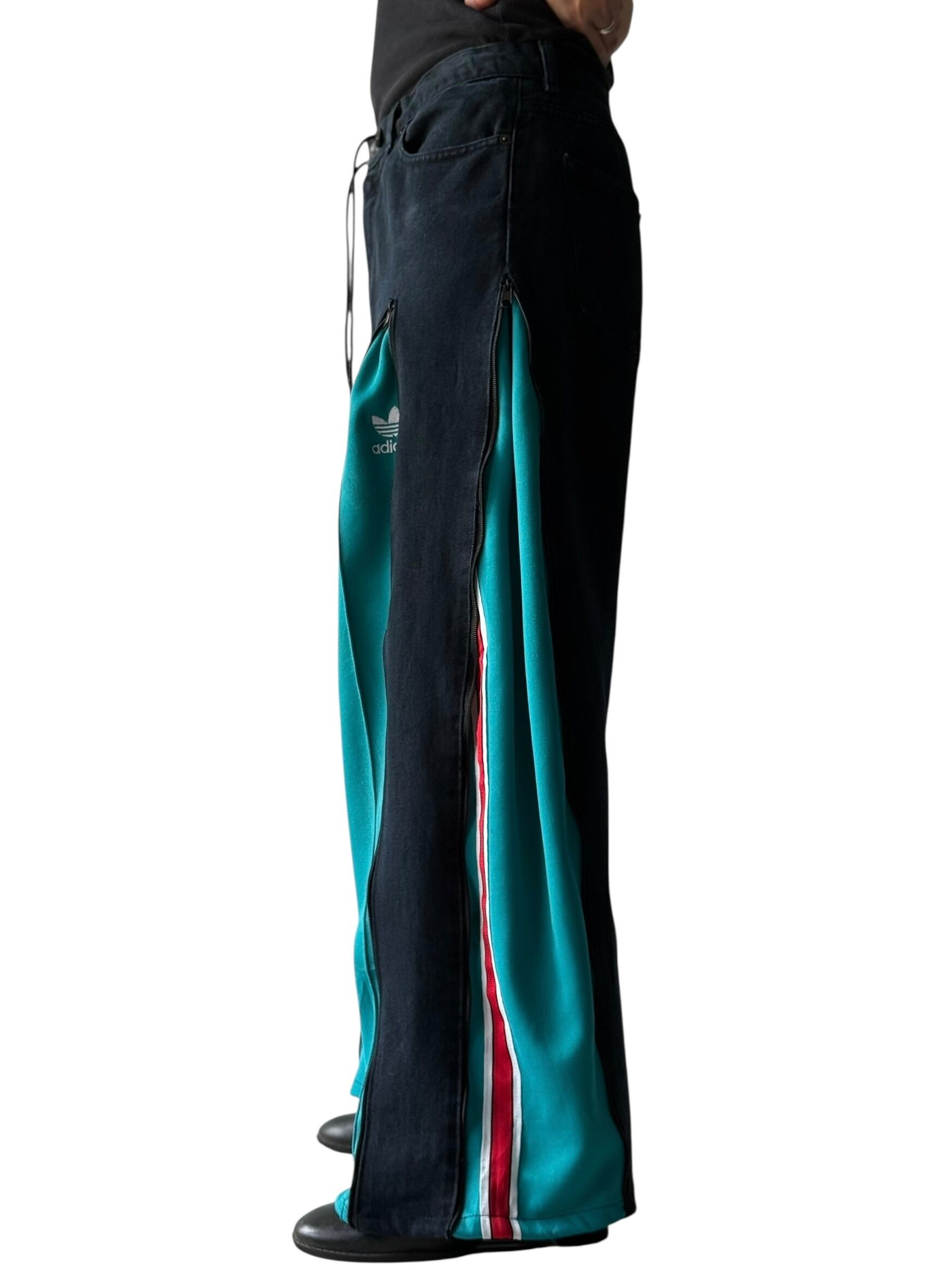 フェードブラックデニムにadidasのトラックパンツをドッキングさせた極上ワイドフレアシルエットに変貌を遂げたとてつもないカスタムデザインがめちゃくちゃ映える1本☺️❣️