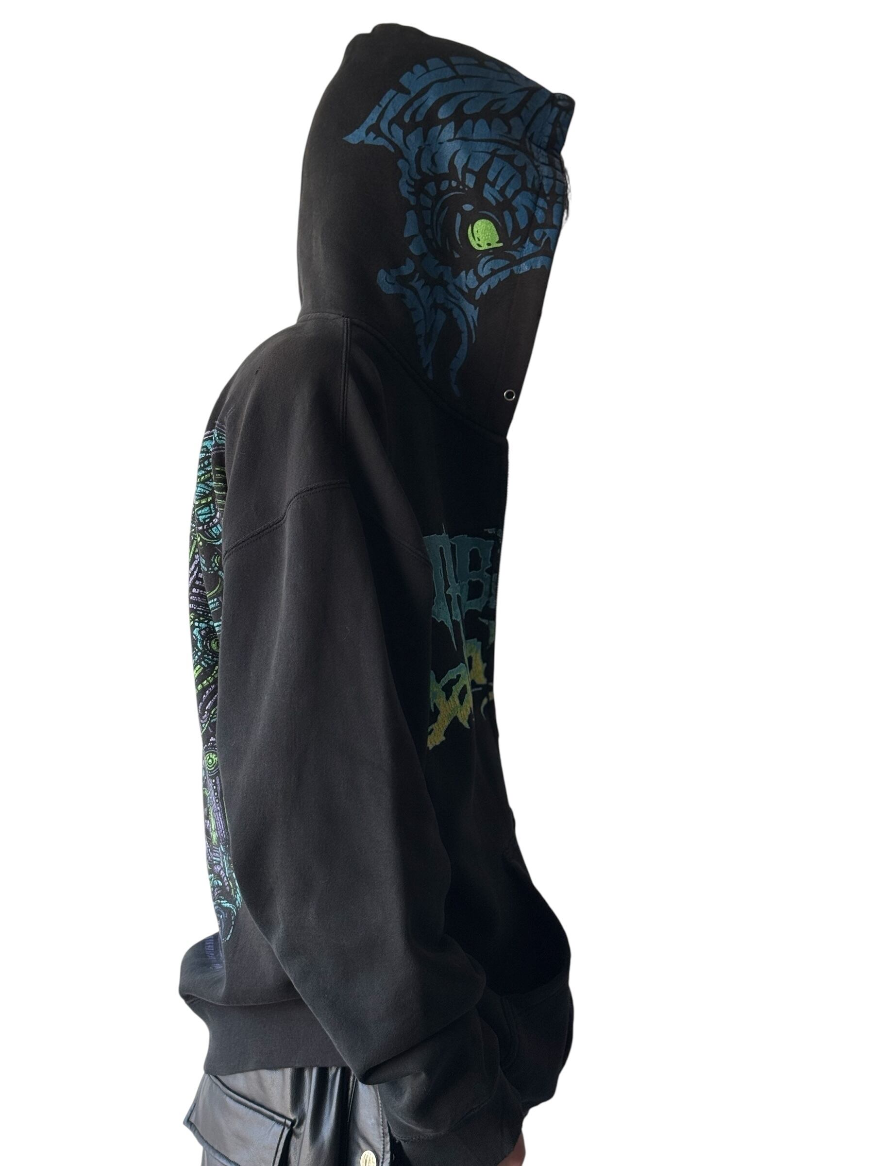 フロント、背面、フード部分にバンドらしいデスぃ目を引くグラフィックがデザインされておりどこから見ても文句ナシのカッコ良さ‼️
