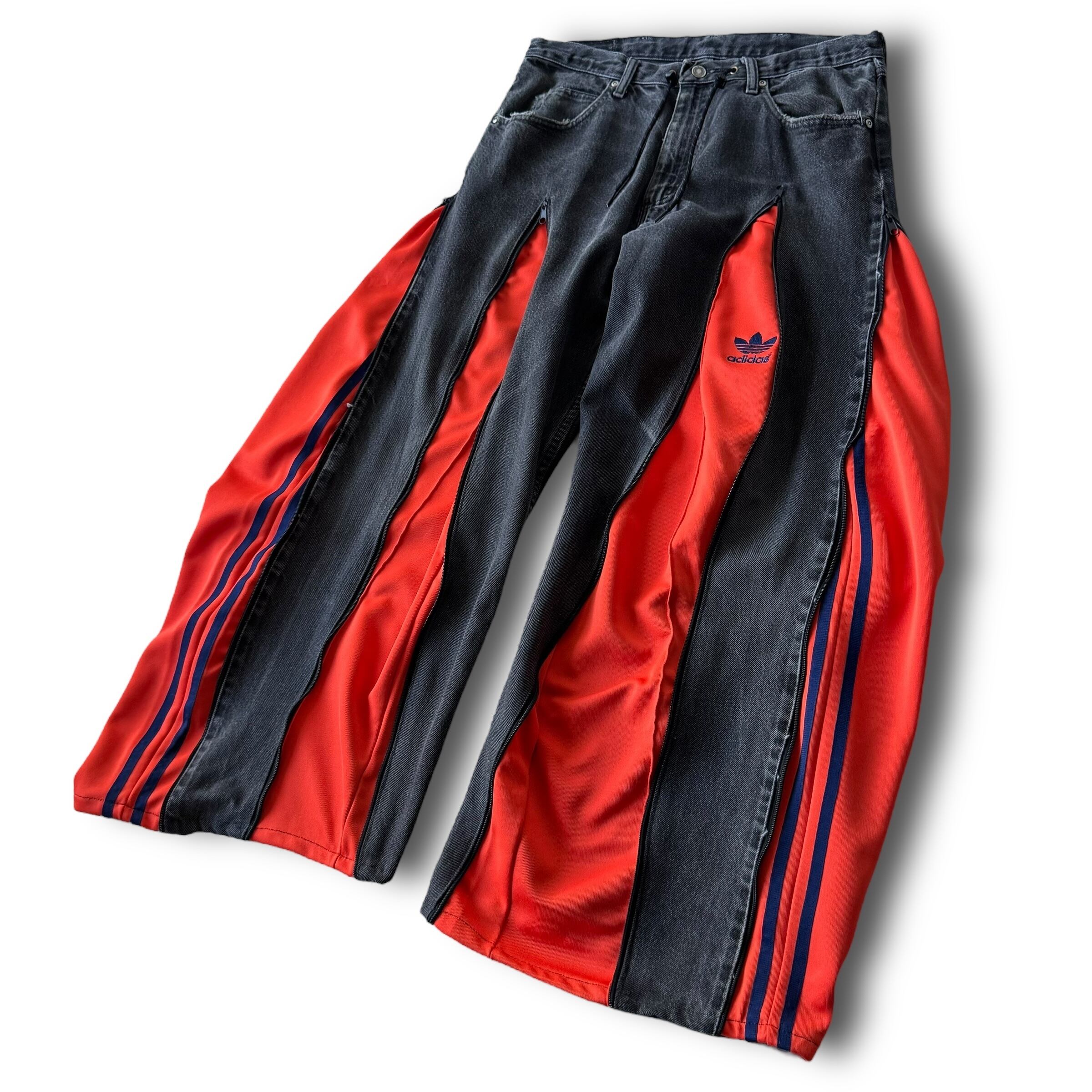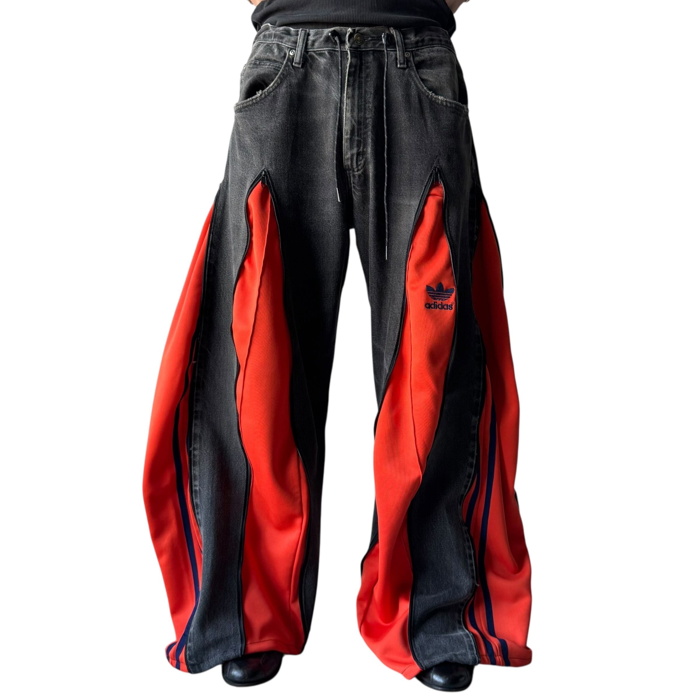 wranglerボディーを使用し、フェードブラックデニムにadidasのトラックパンツをドッキングさせた極上ワイドフレアシルエットに変貌を遂げたとてつもないカスタムデザインがめちゃくちゃ映える1本‼️