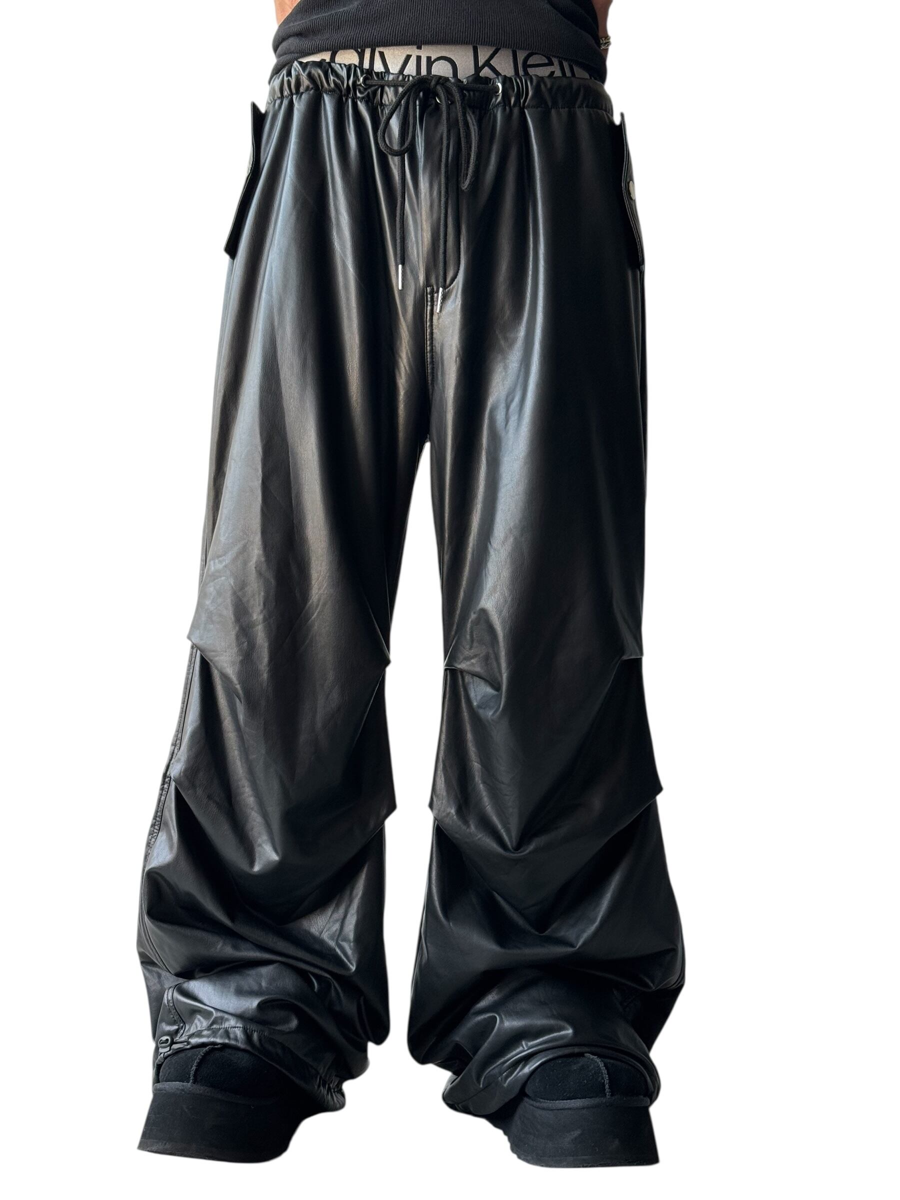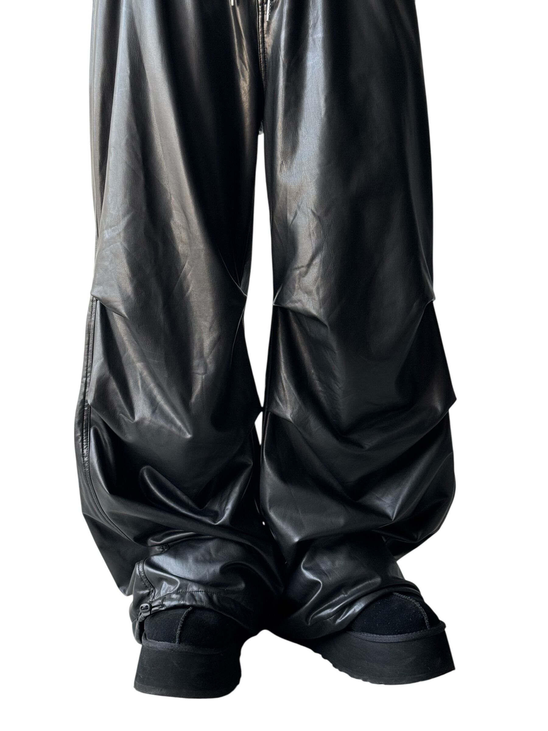 膝部分にタックの入った立体感あるルーズなシルエットが存在感ありpvcレザーの異素材感がコーデのポイントに◎