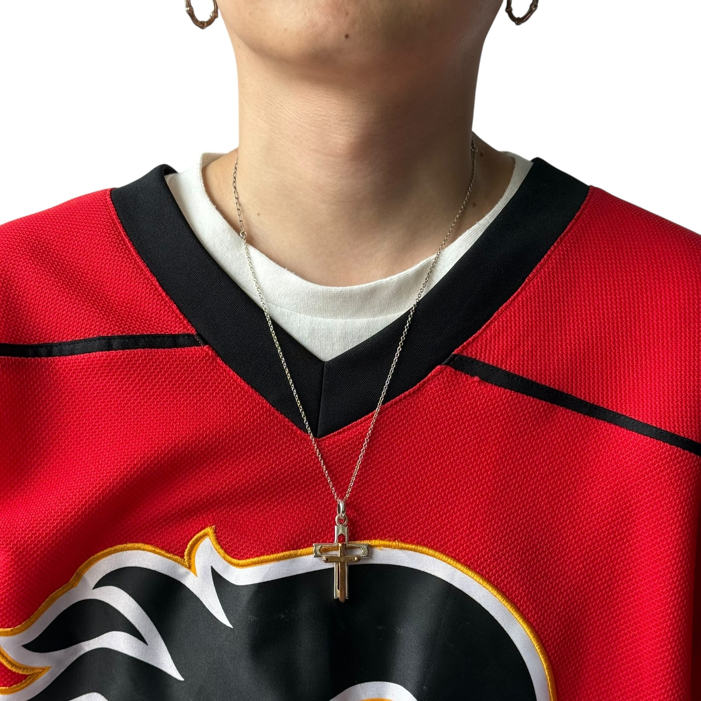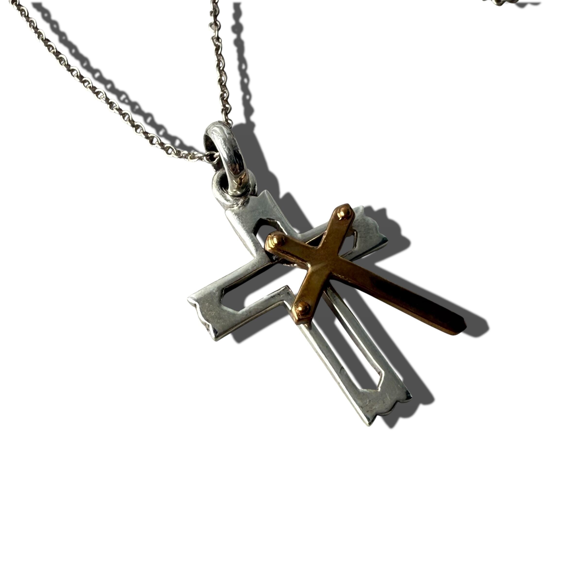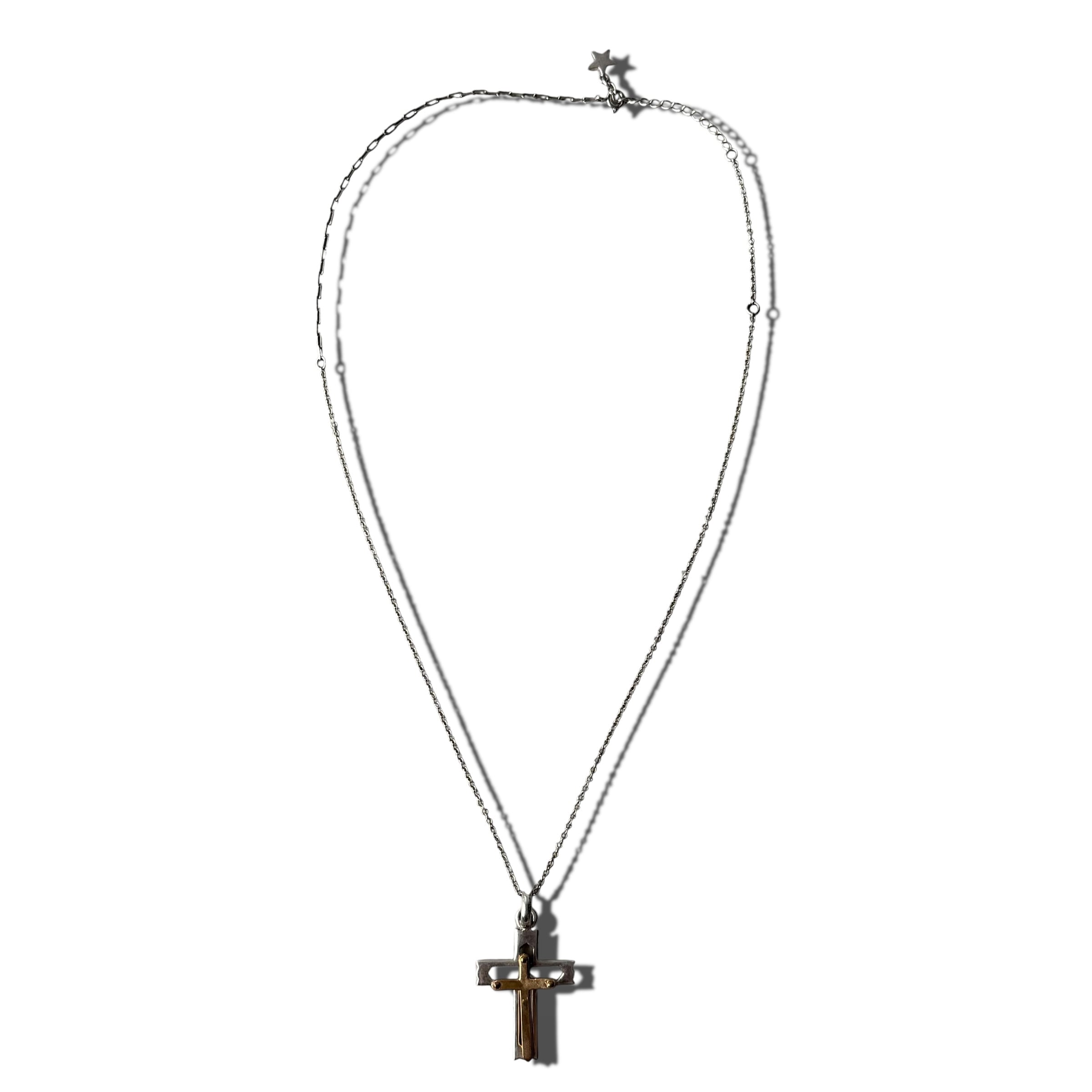 くり抜きのシルバークロスにゴールドカラーのクロスが重なったおしゃれなトップが魅力的なデザインネックレス!!