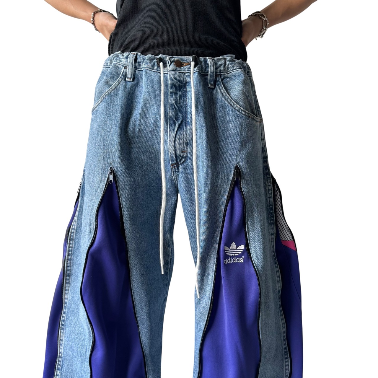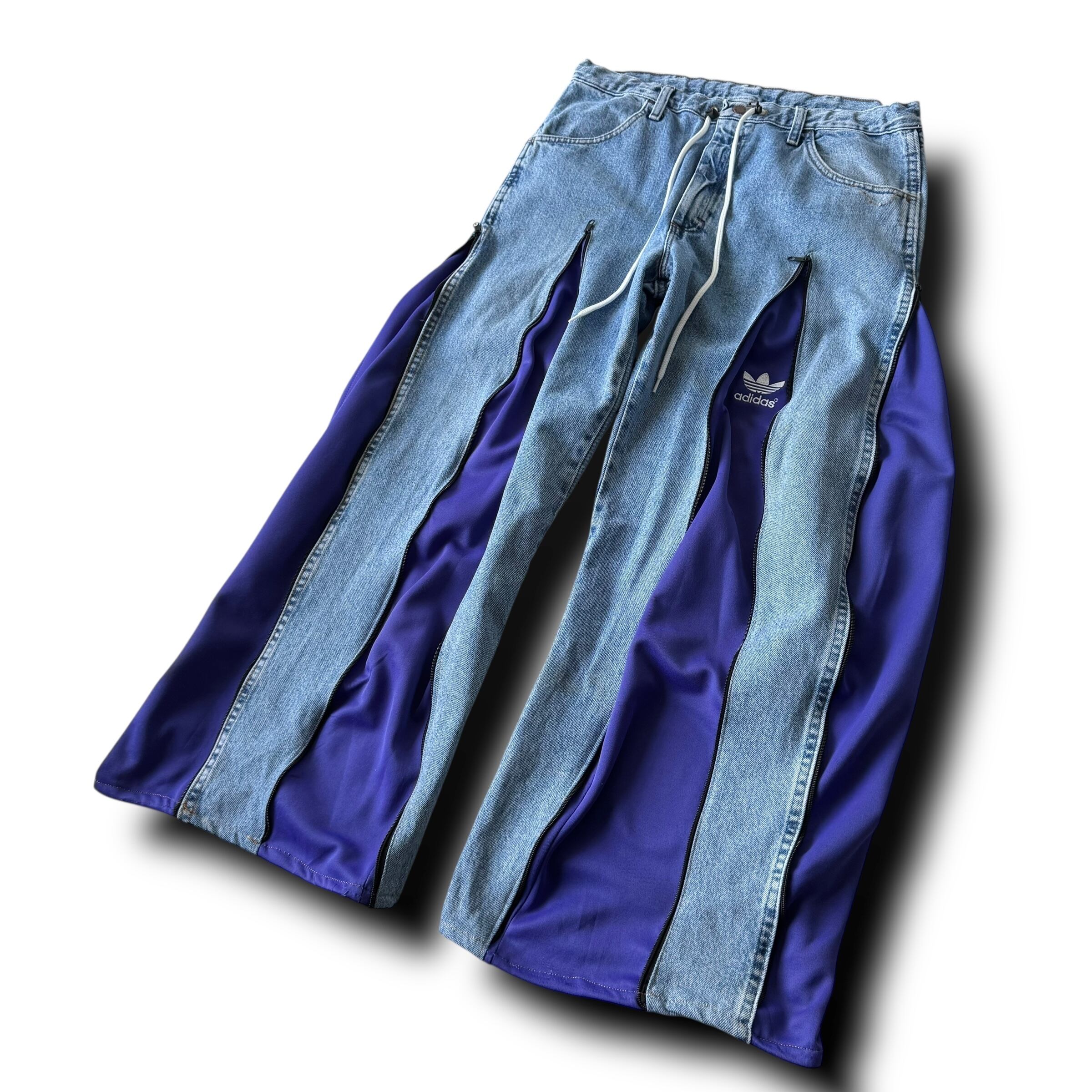 フェード感の素敵なデニムにadidasのトラックパンツをドッキングさせた極上ワイドフレアシルエットに変貌を遂げたとてつもないカスタムデザインがめちゃくちゃ映える1本☺️❣️