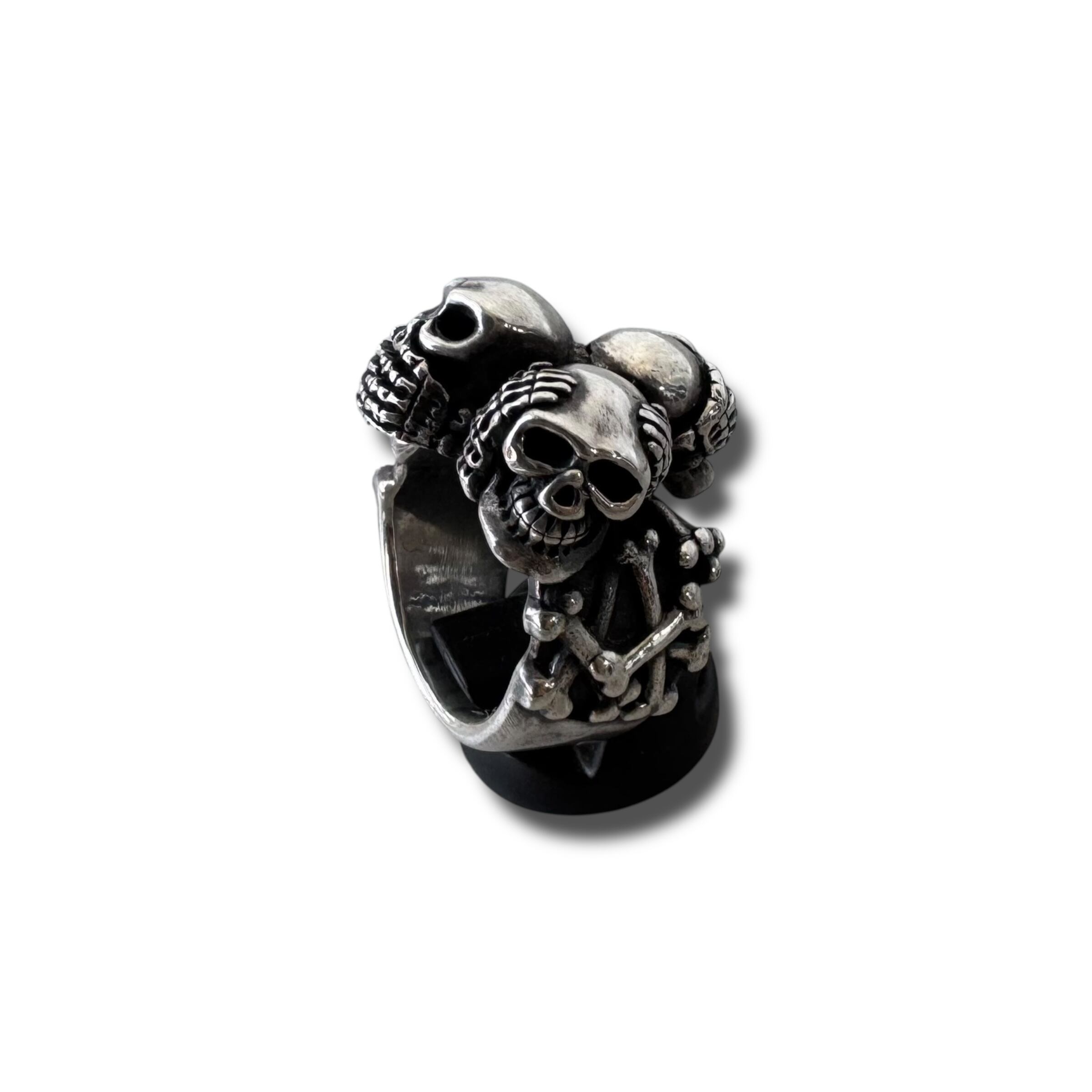 髑髏モチーフのインパクト抜群なシルエットになんと見ざる聞かざる言わざるデザインが映えまくりなシルバーリング✨️