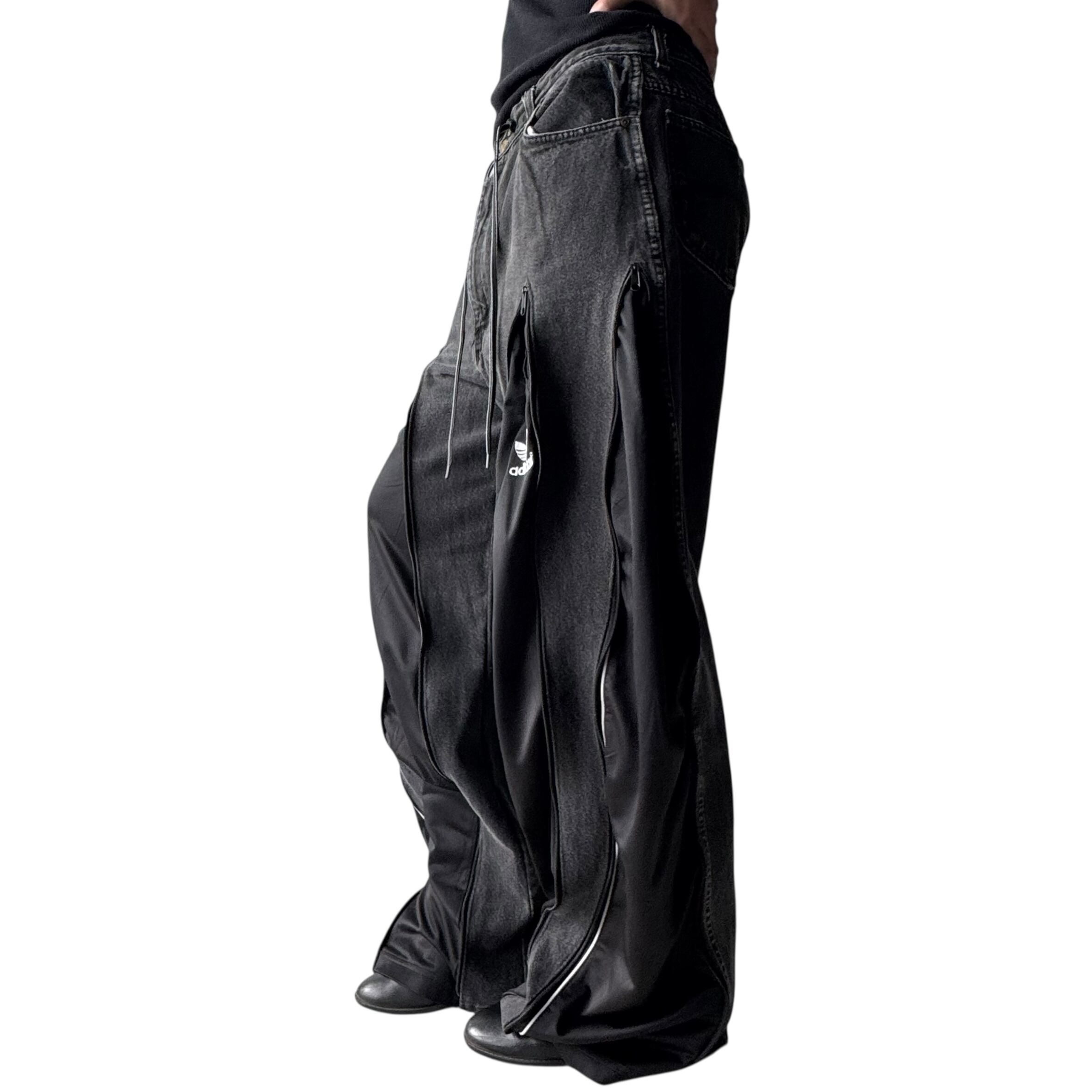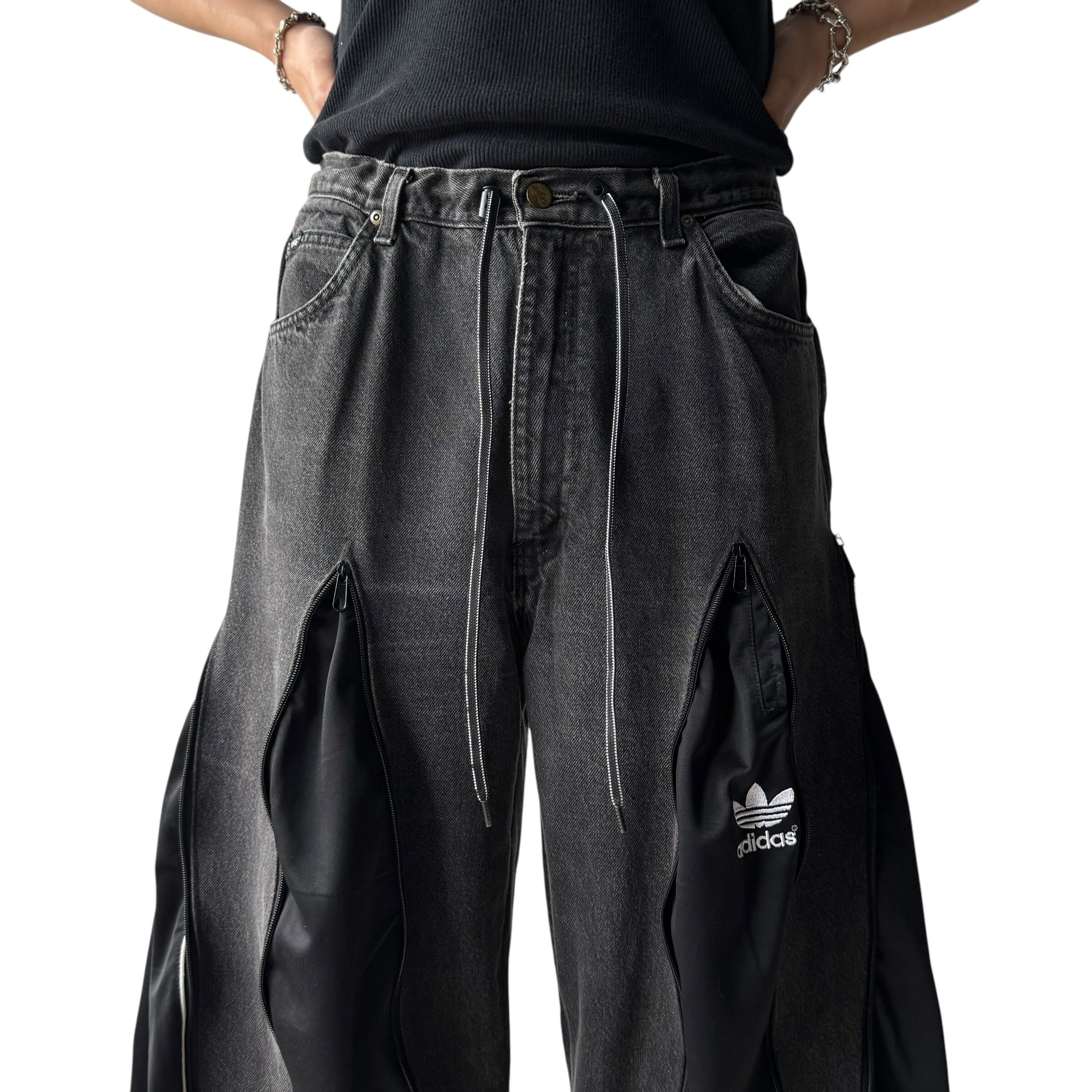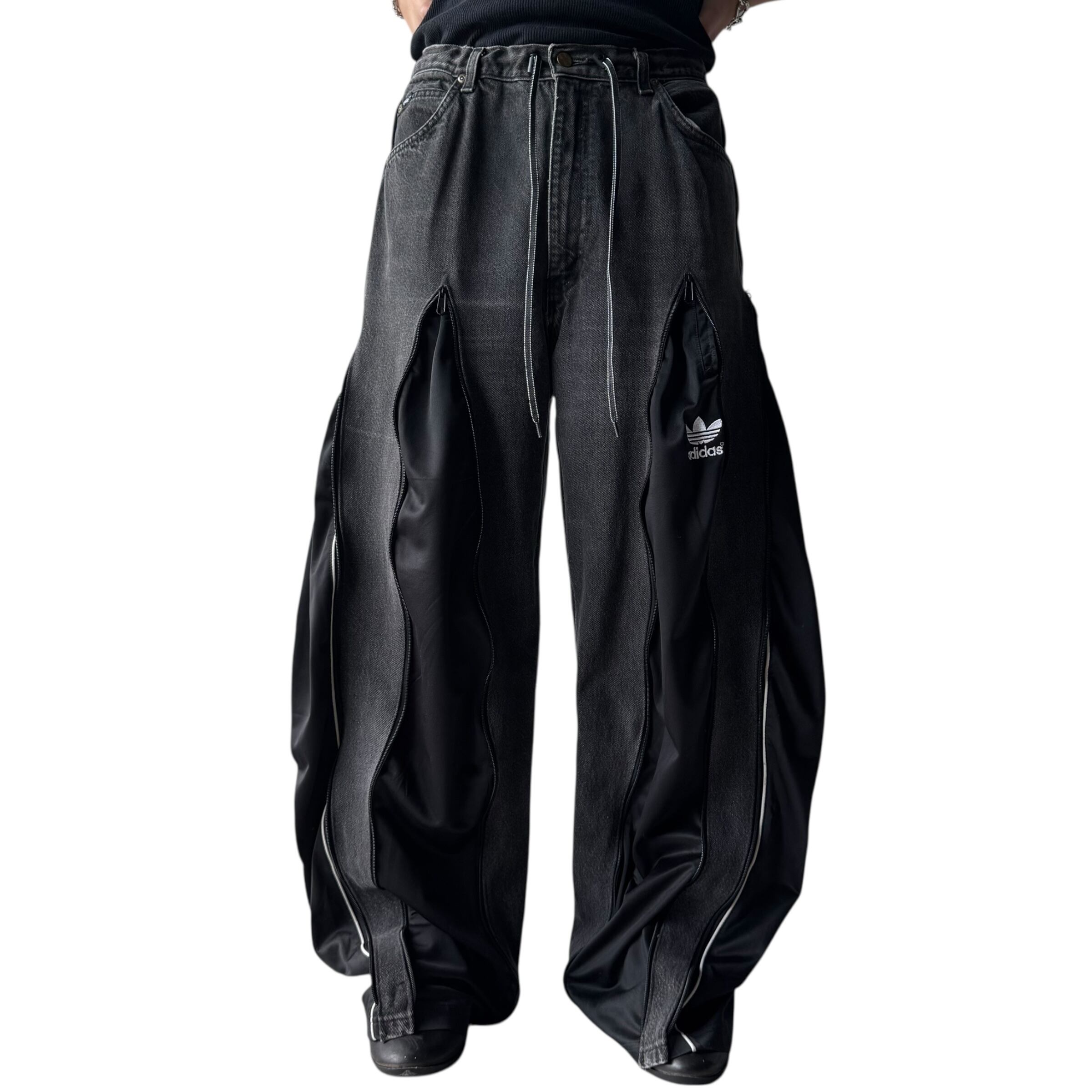 ブラックデニムを使用し、フェードブラックデニムにadidasのトラックパンツをドッキングさせた極上ワイドフレアシルエットに変貌を遂げたとてつもないカスタムデザインがめちゃくちゃ映える1本‼️