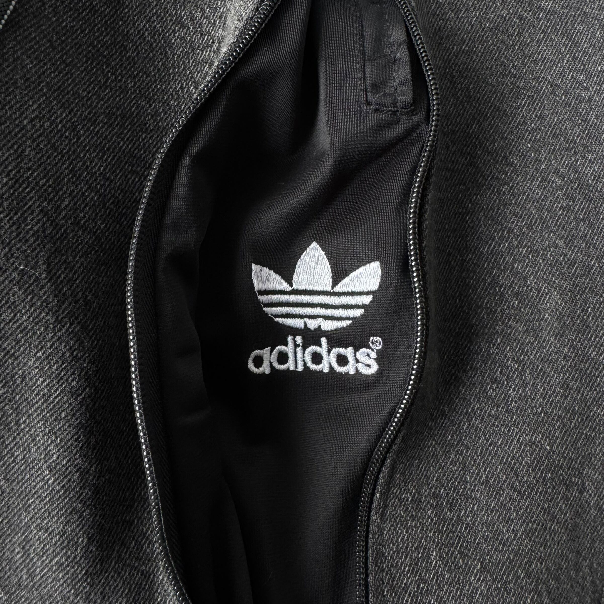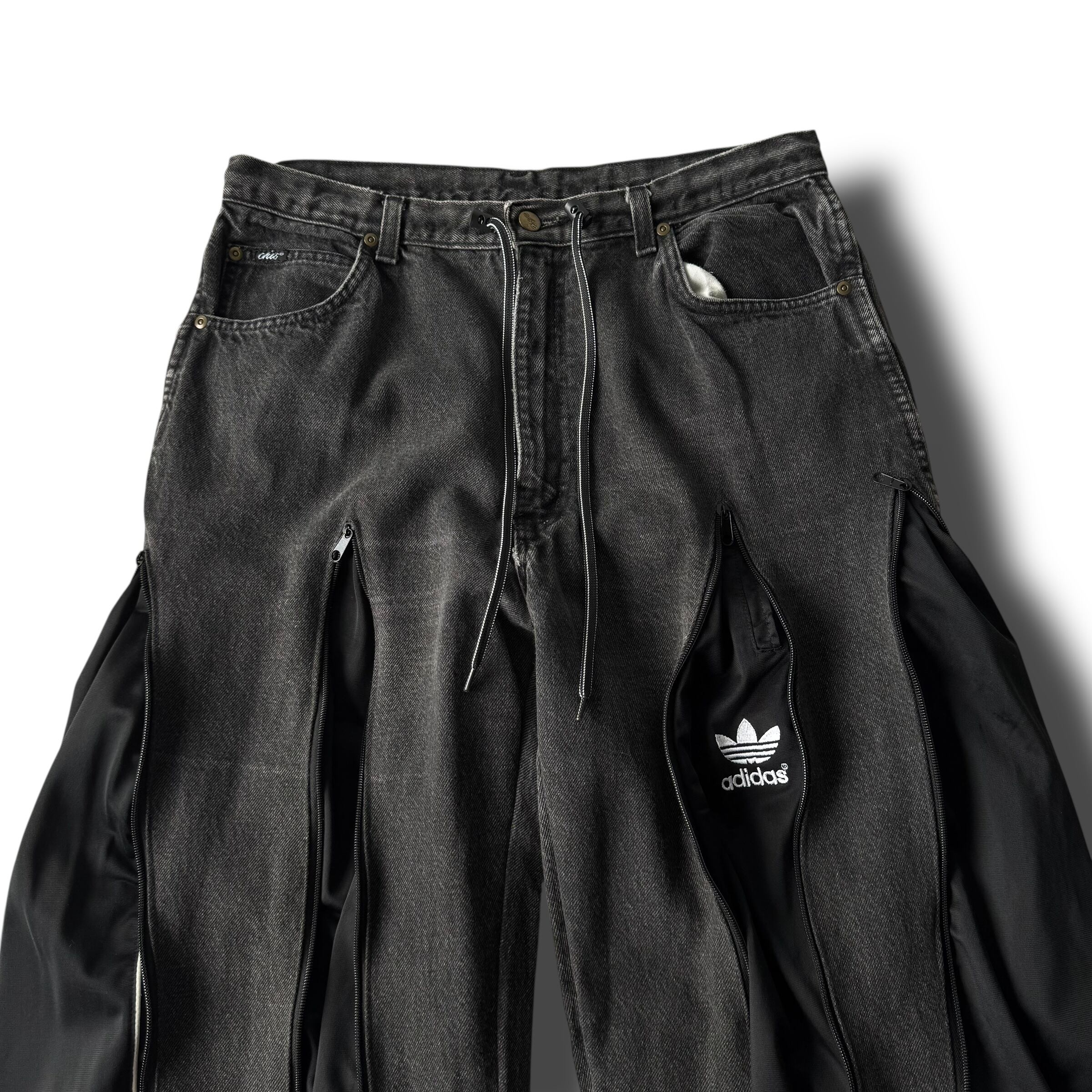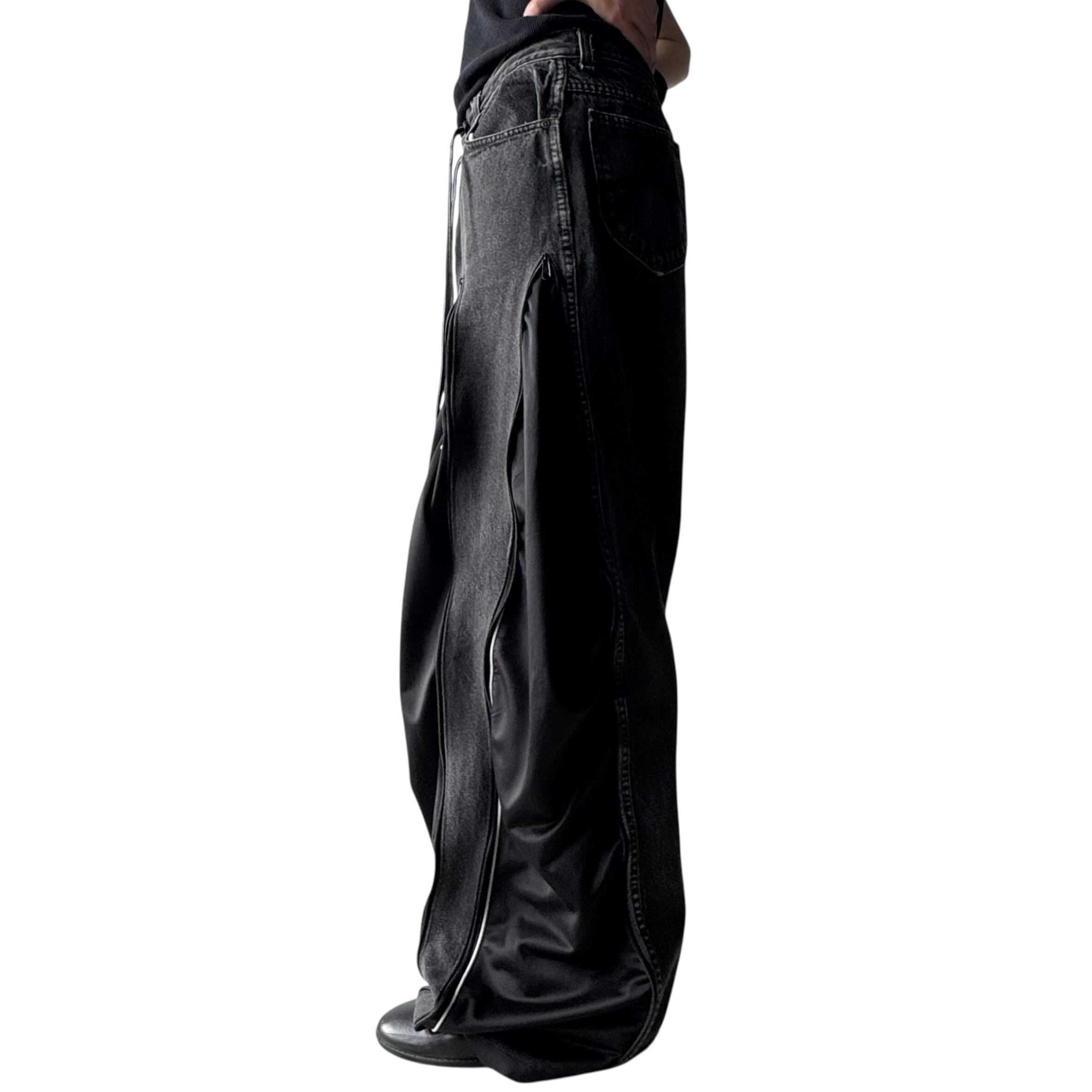 ブラックデニムを使用し、フェードブラックデニムにadidasのトラックパンツをドッキングさせた極上ワイドフレアシルエットに変貌を遂げたとてつもないカスタムデザインがめちゃくちゃ映える1本‼️