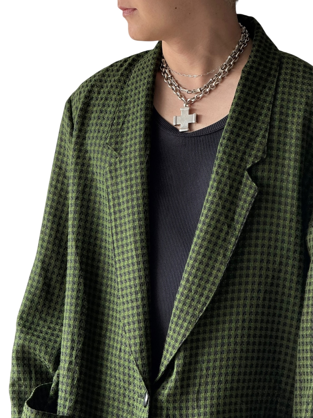 細やかな織柄チェックにゆるめシルエットで完璧。