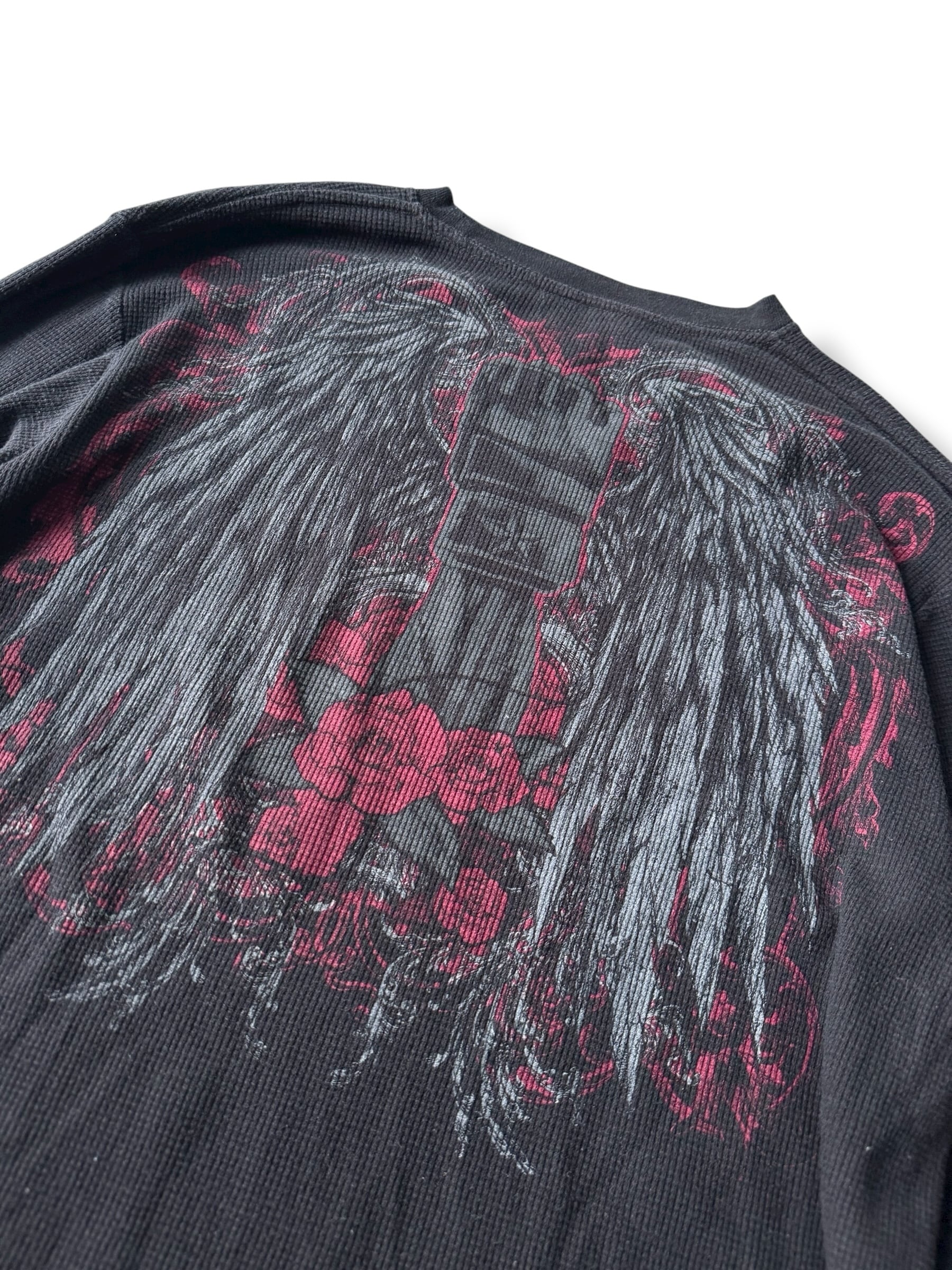センターにはオシャレくすぐるアームクロスにローズフレア、背中には拳を突き上げた両サイドにウィングモチーフがデザインされており、y2kテンションMAXのゴリゴリな1着✨️✨️