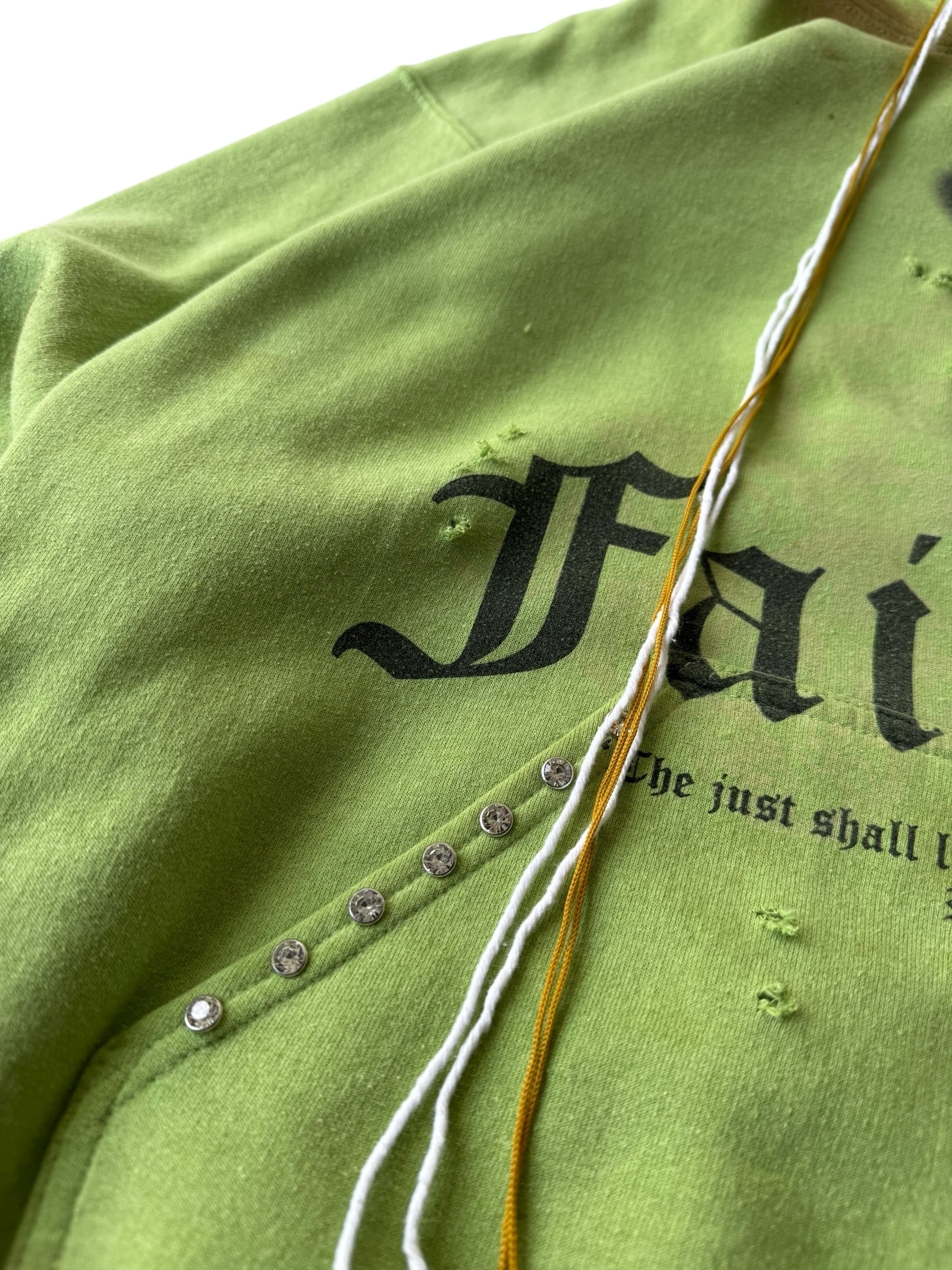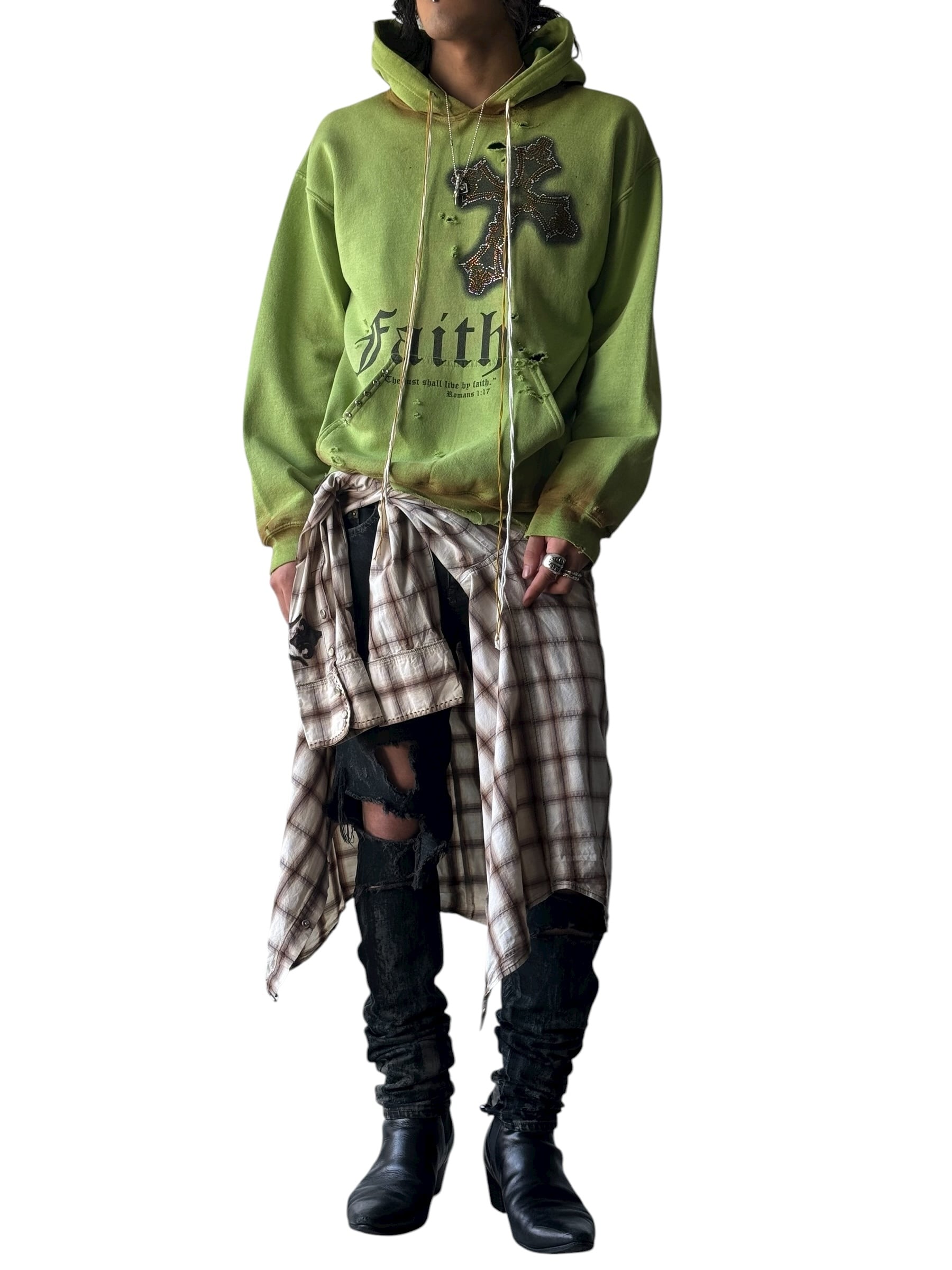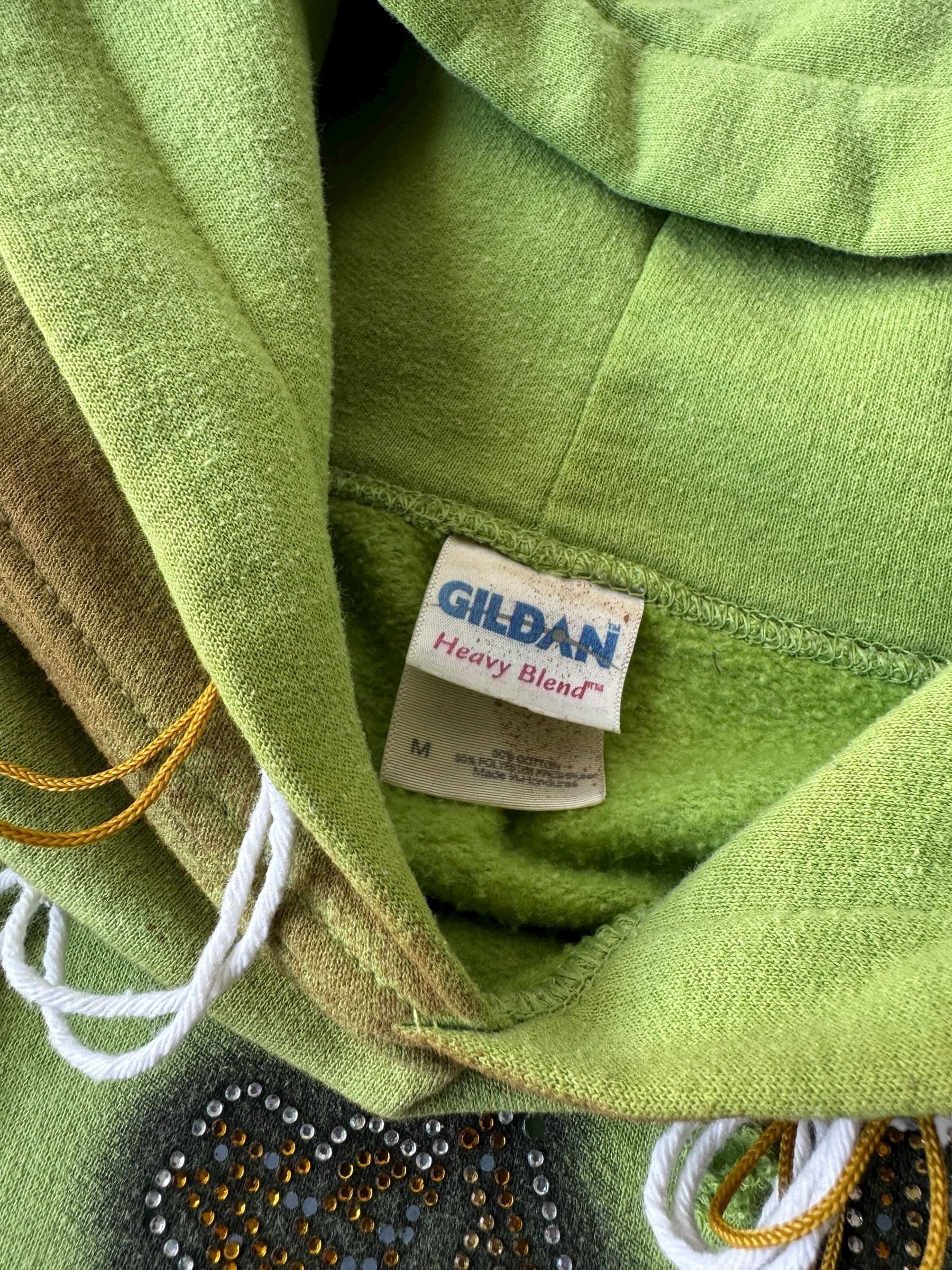 全体的に汚し加工とダメージが施されており、ポケット部分にはストーンがセットされたスタッズが付けられていてフーディーの紐には何本もの紐が付けられていて言葉では説明できないほどかっこいいデザイン‼️‼️