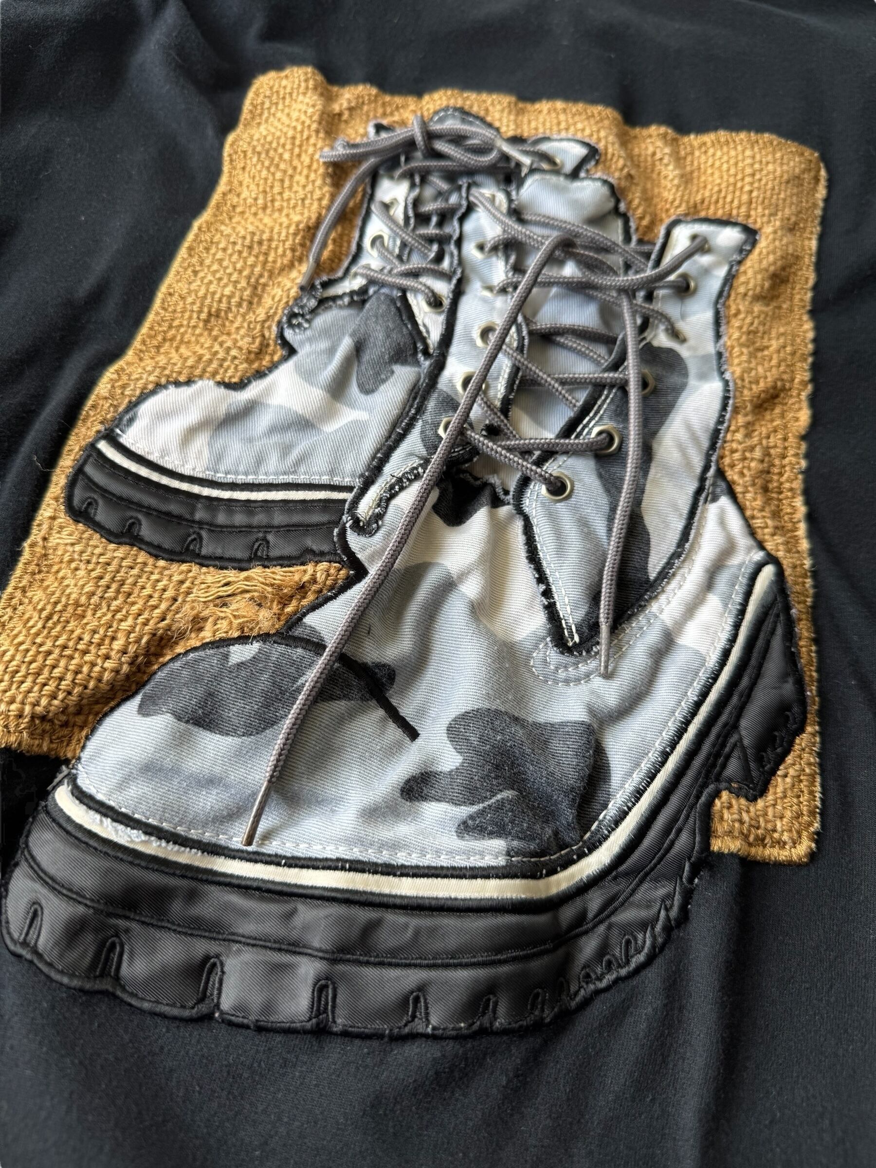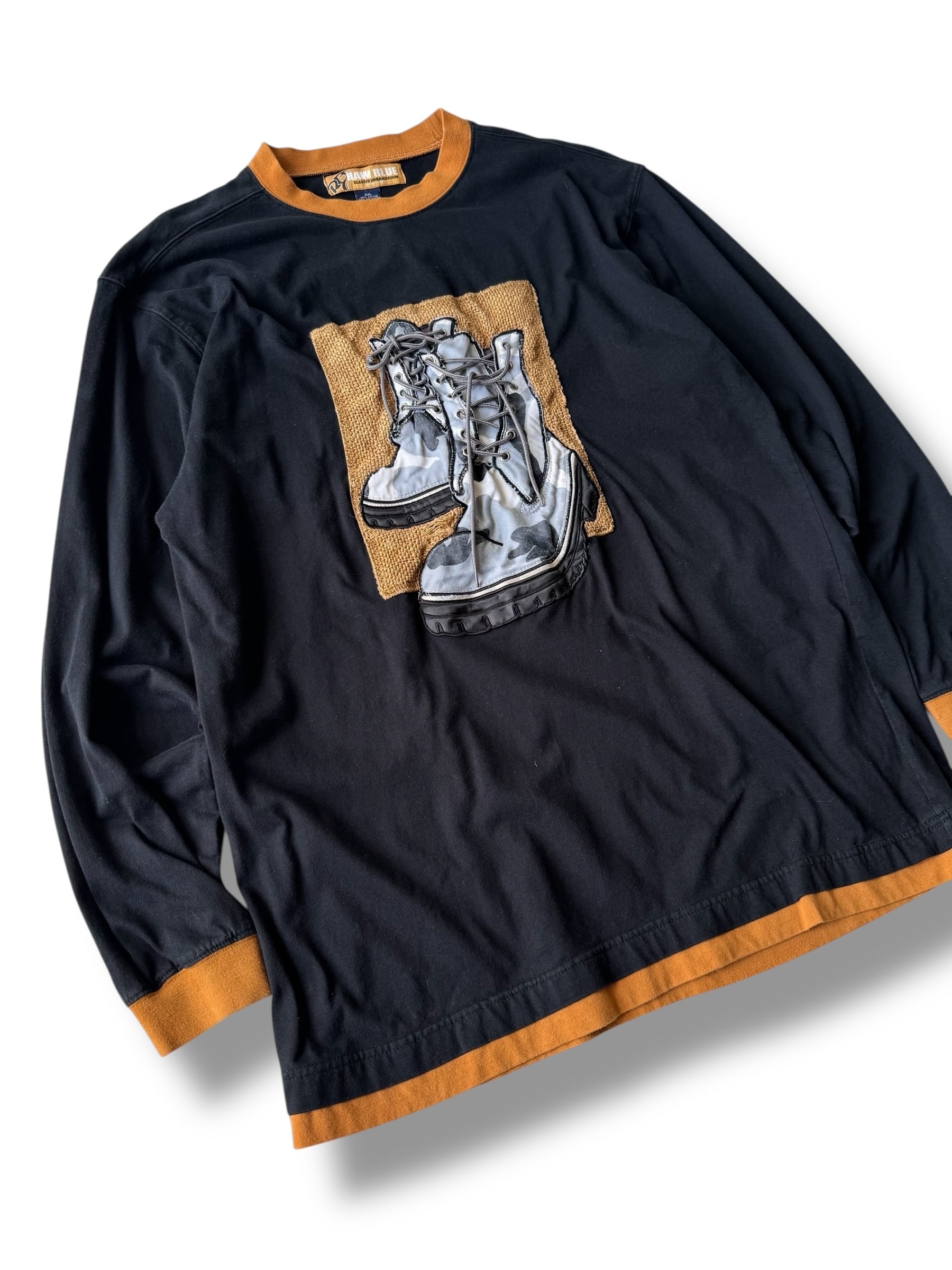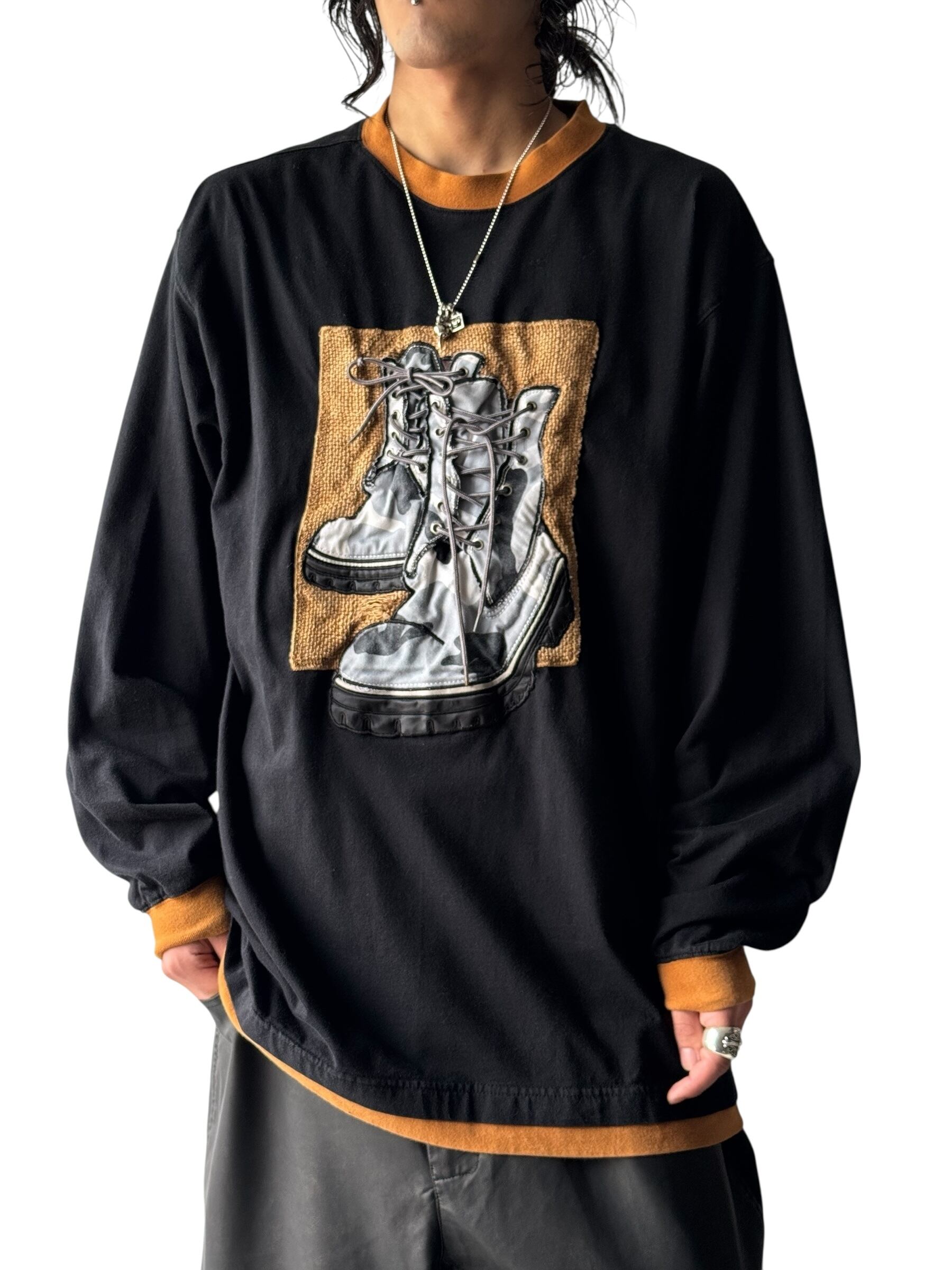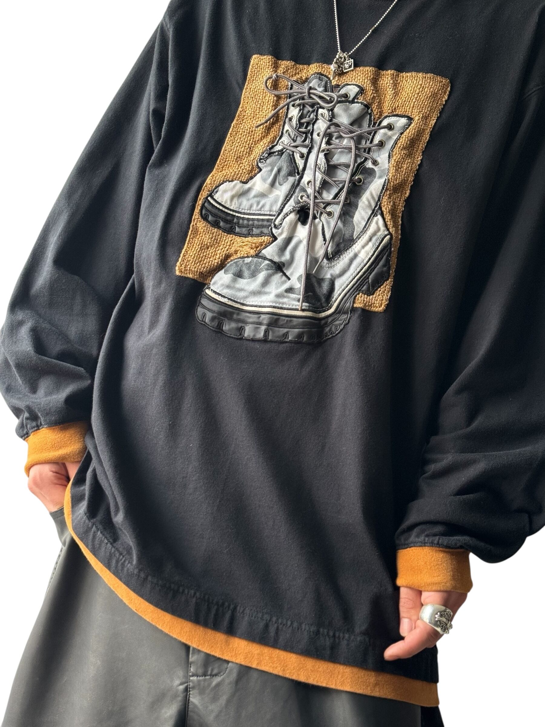 ティンバーブーツモチーフのビッグパッチをフロントに搭載し周りには足跡がプリントされたデザインレイヤードカットソー‼️‼️