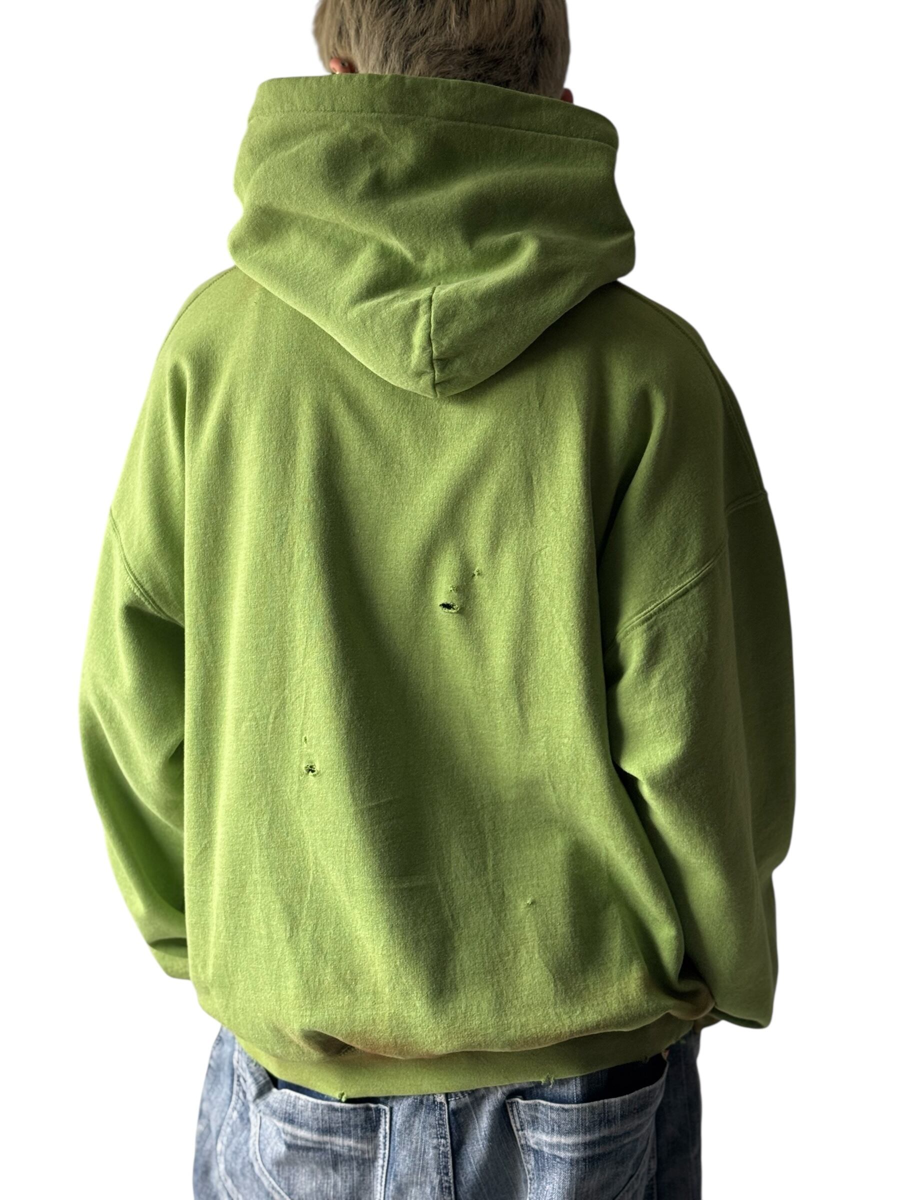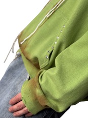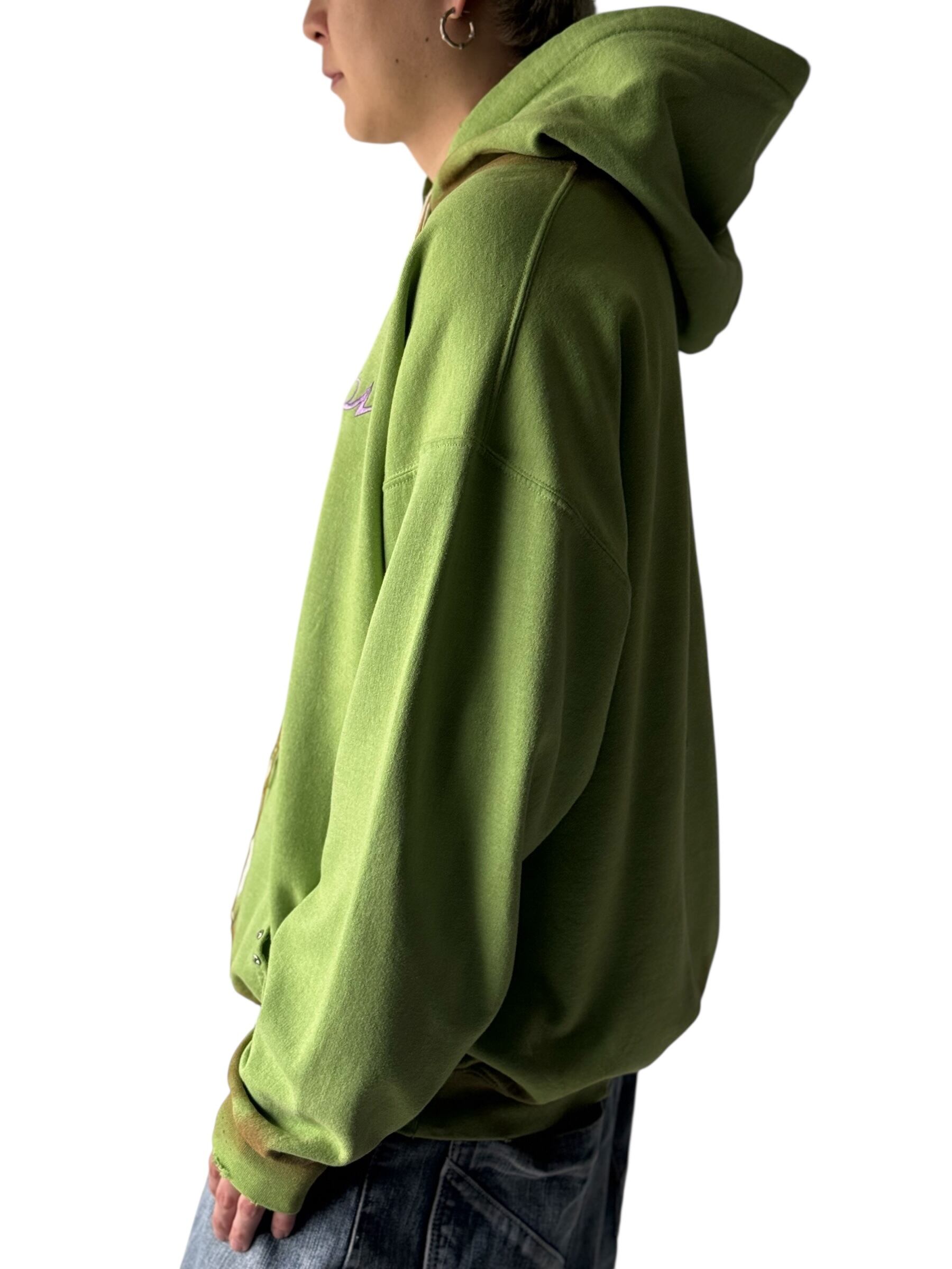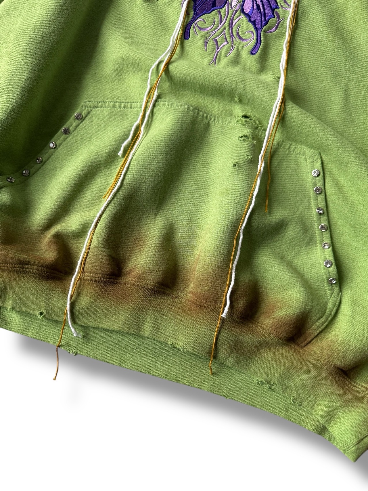 全体的に汚し加工とダメージが施されており、ポケット部分にはストーンがセットされたスタッズが付けられていてフーディーの紐には何本もの紐が付けられていて言葉では説明できないほどかっこいいデザイン‼️‼️