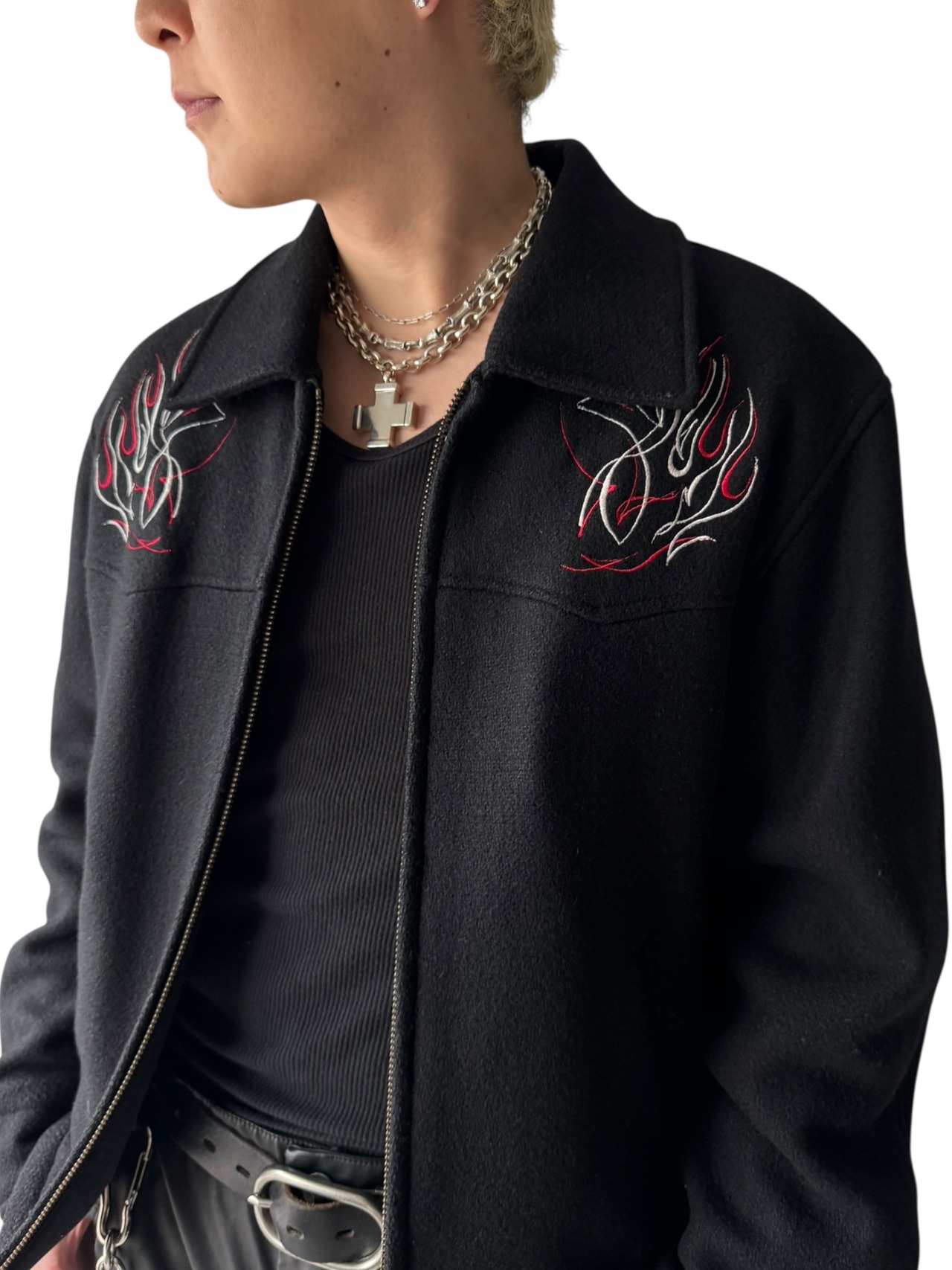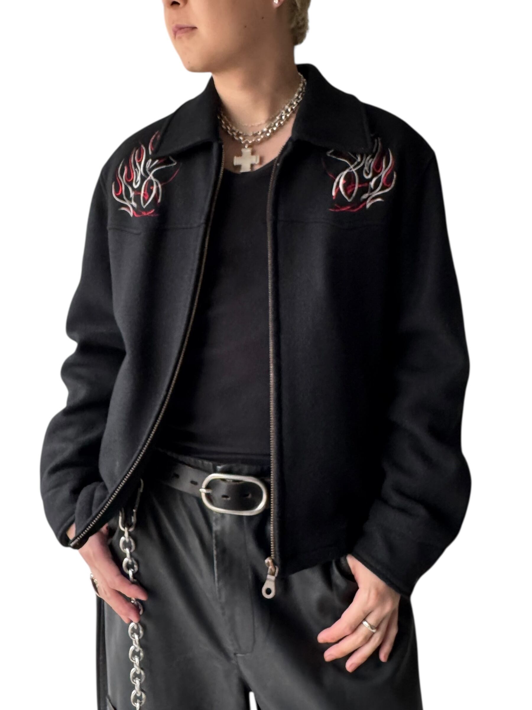 fire pattern embroidered zip up jacket