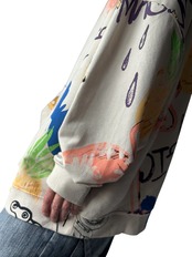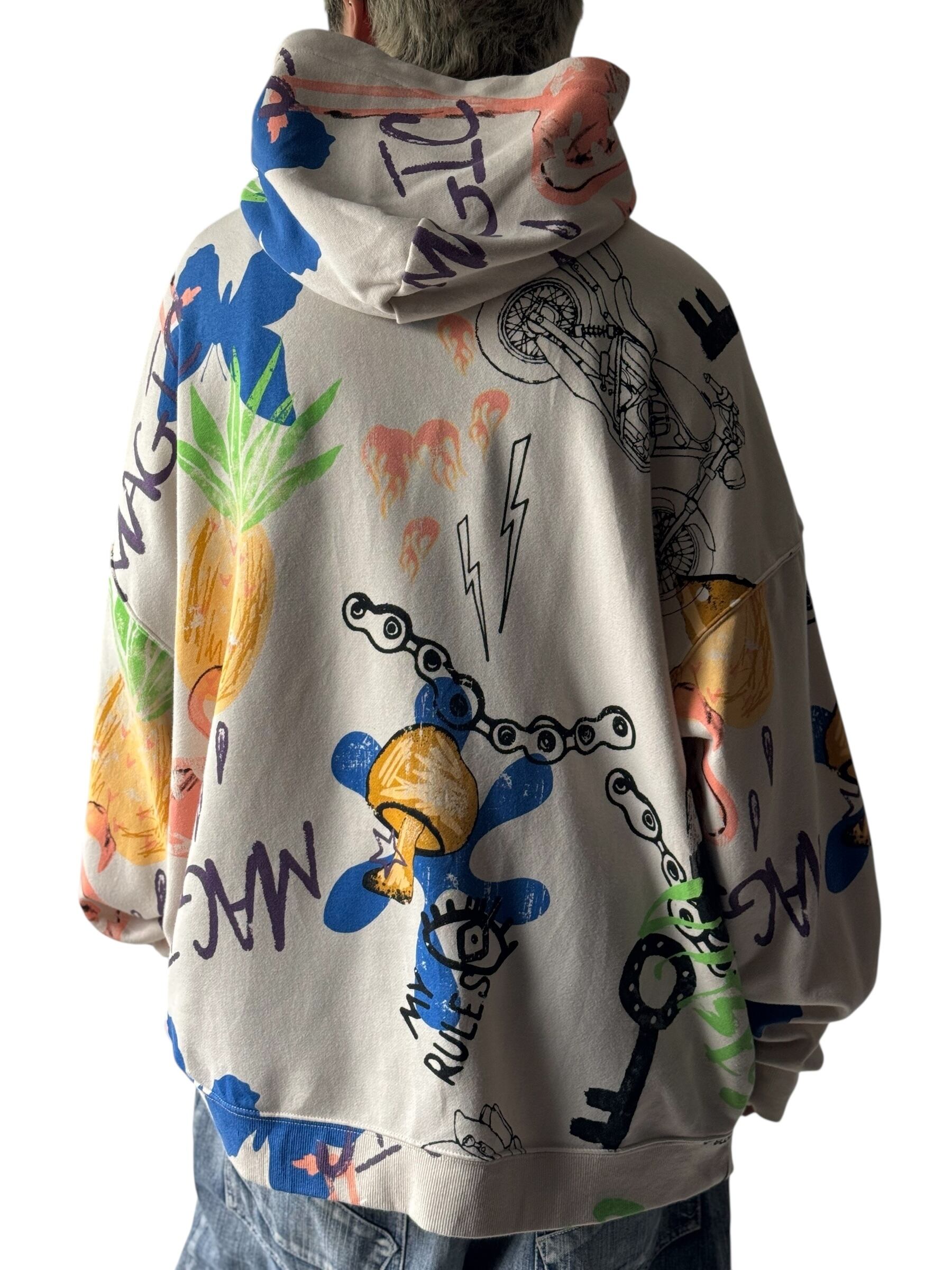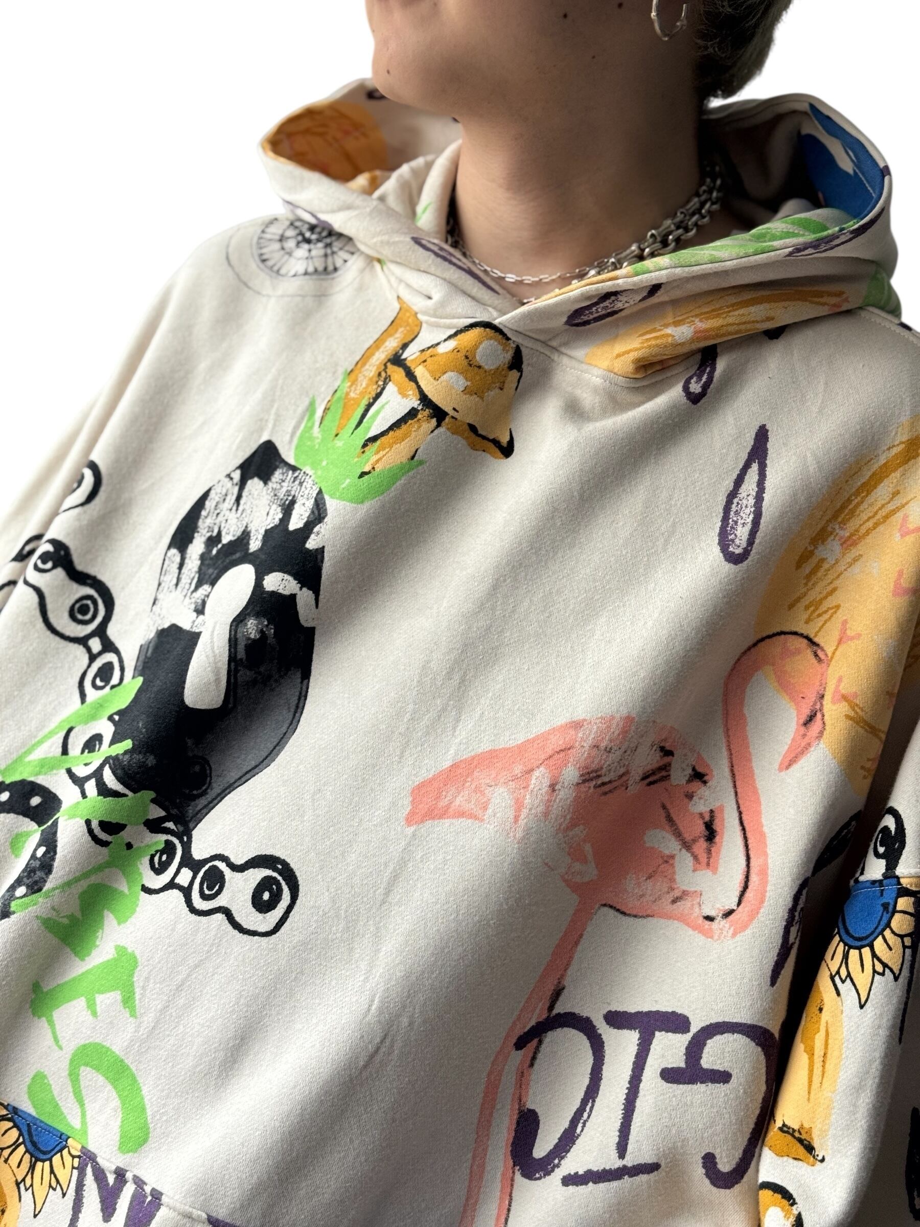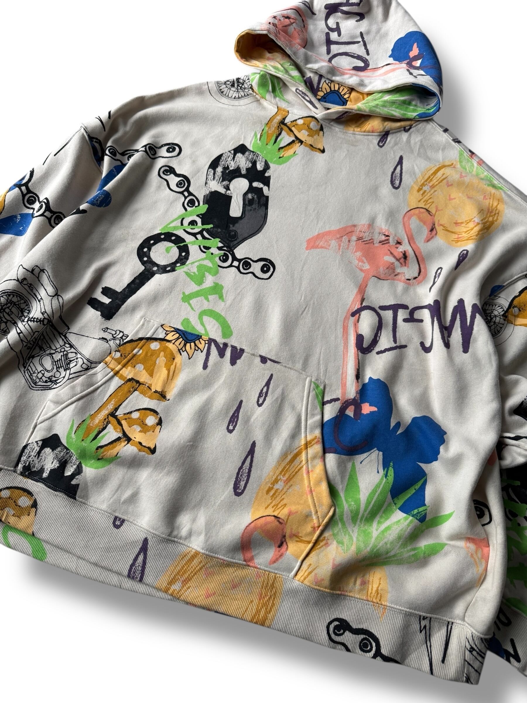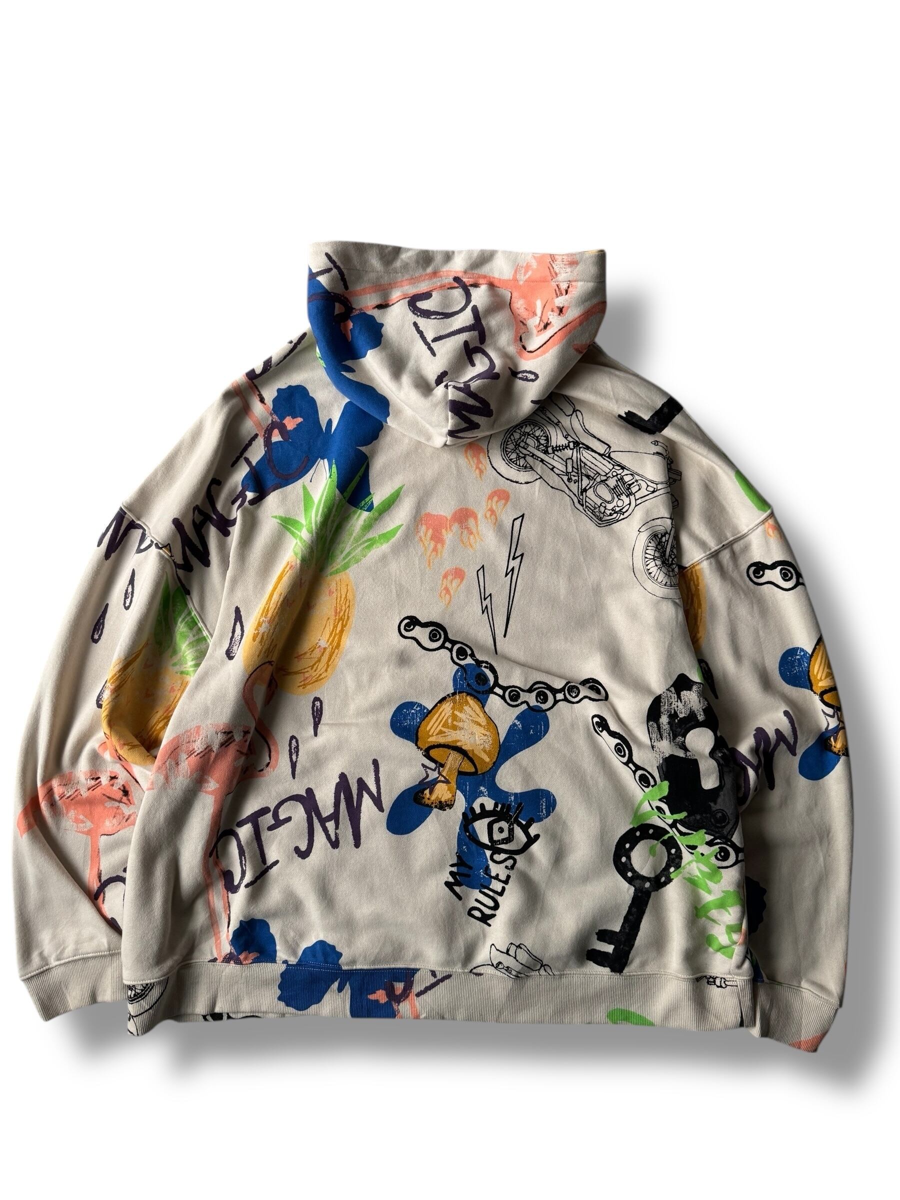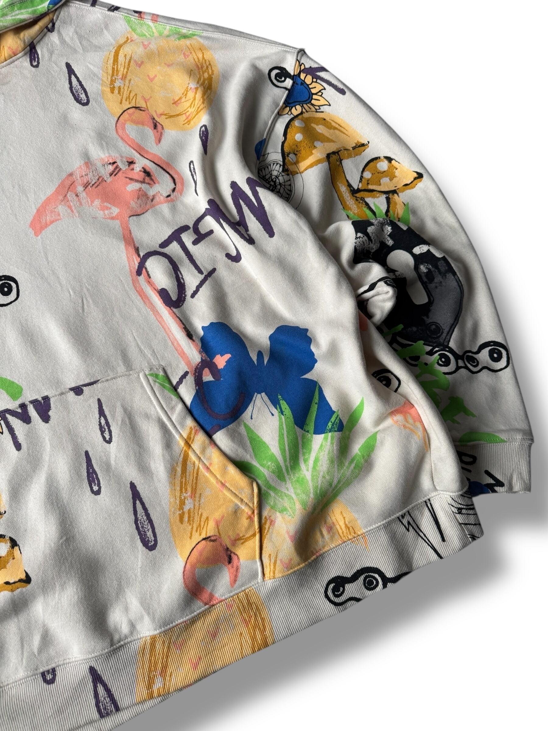 白ボディのパーカー全体に色んなイラストやレタリングが色んなカラフルなカラーでプリントされており超絶キュート✨️✨️