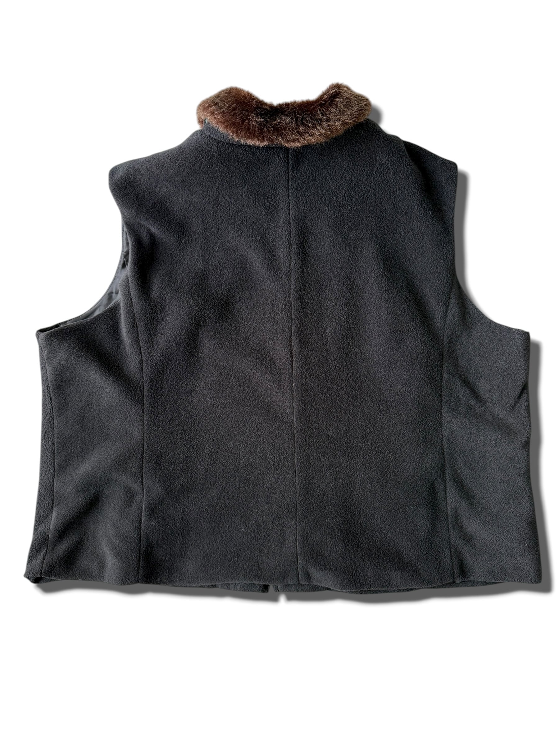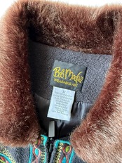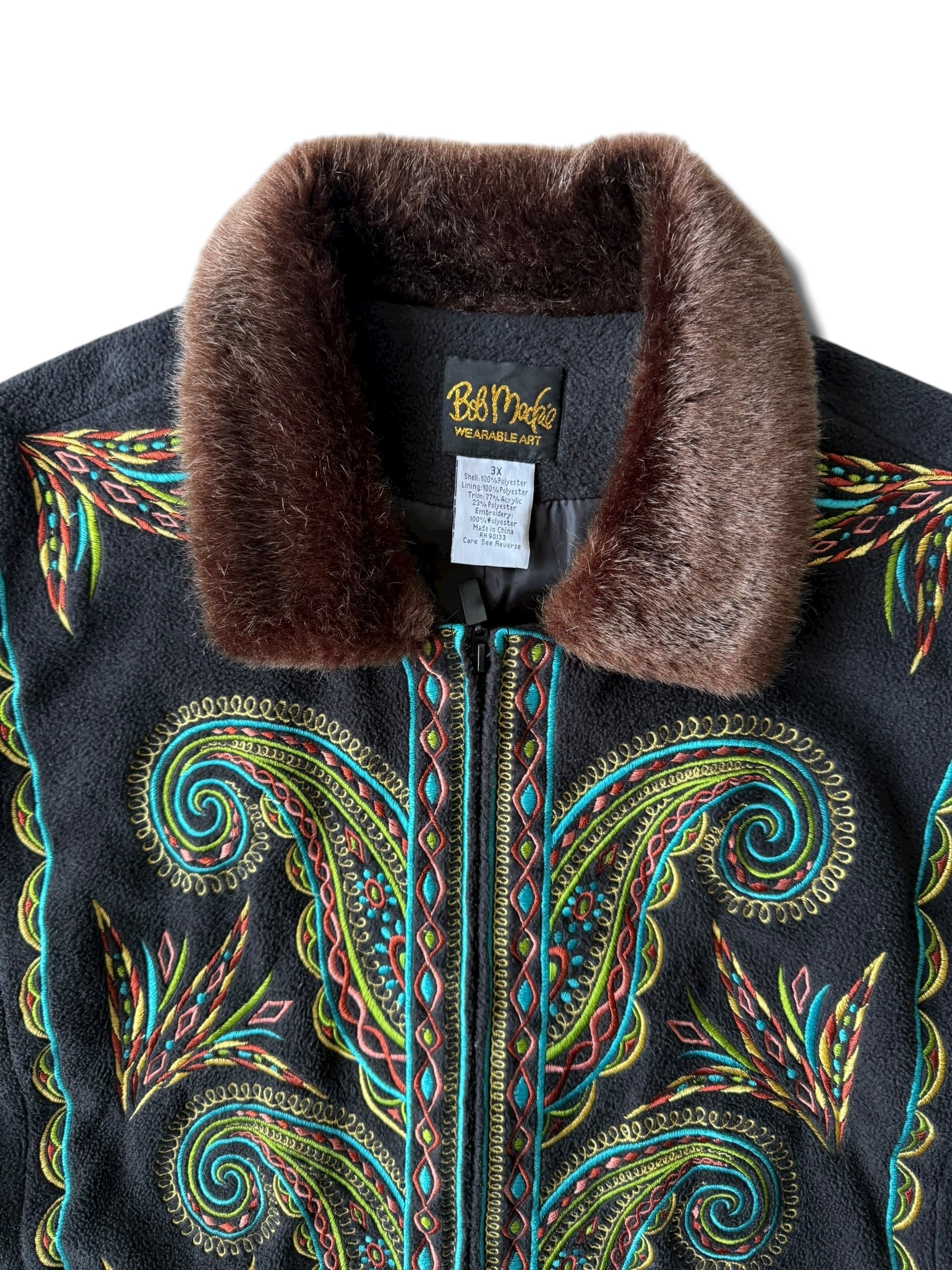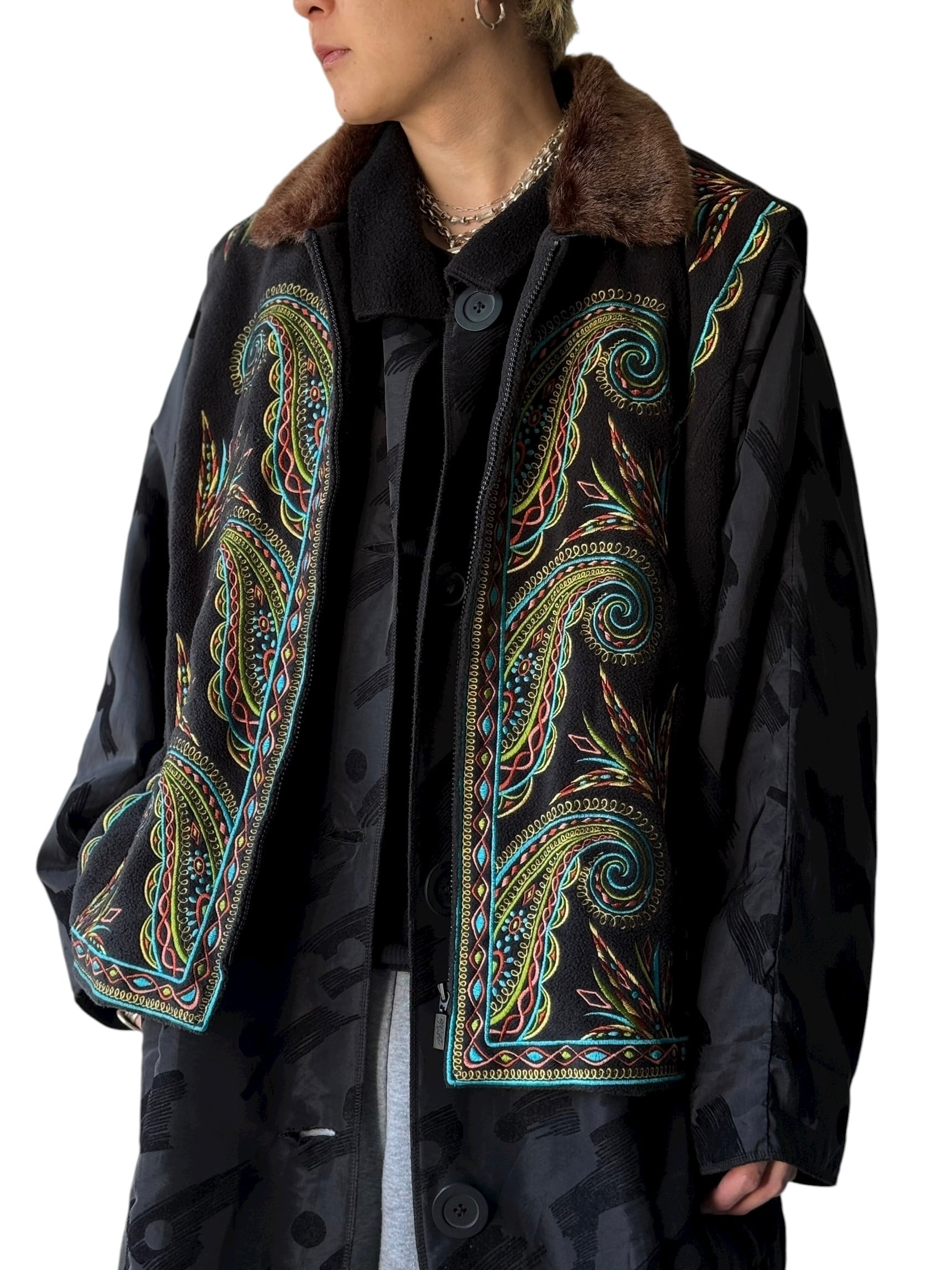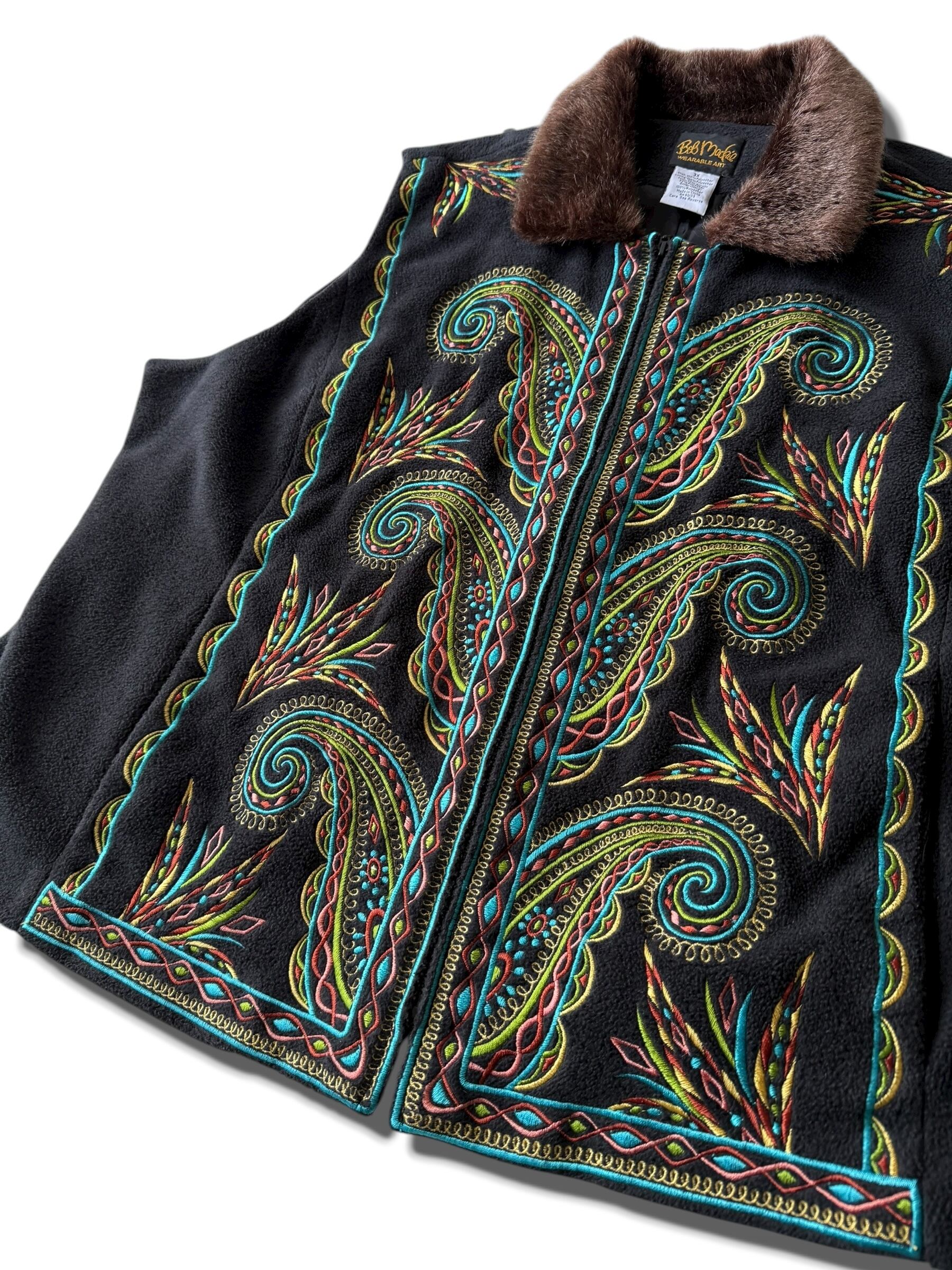 【Bob Mackie】 Fur collar swiching Embroidered fleece zip vest