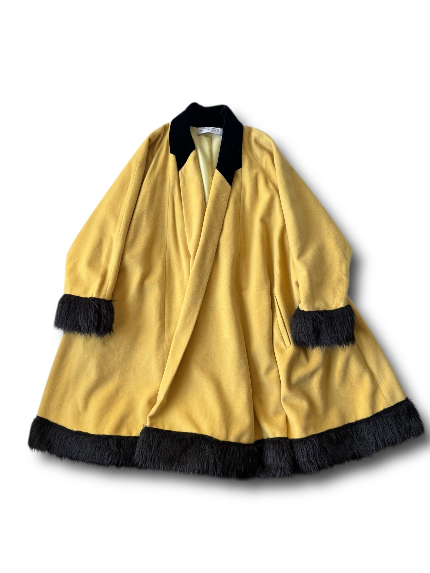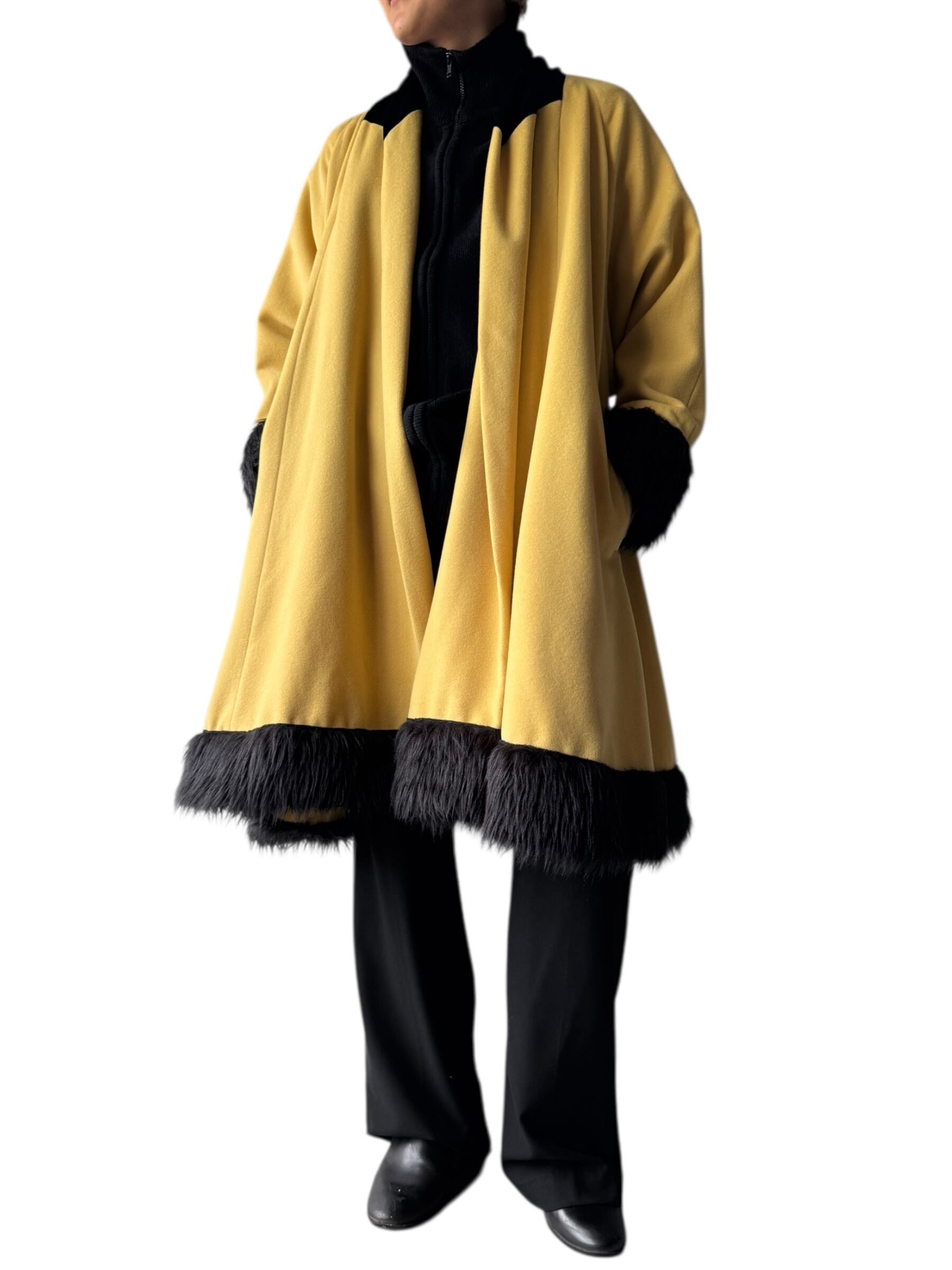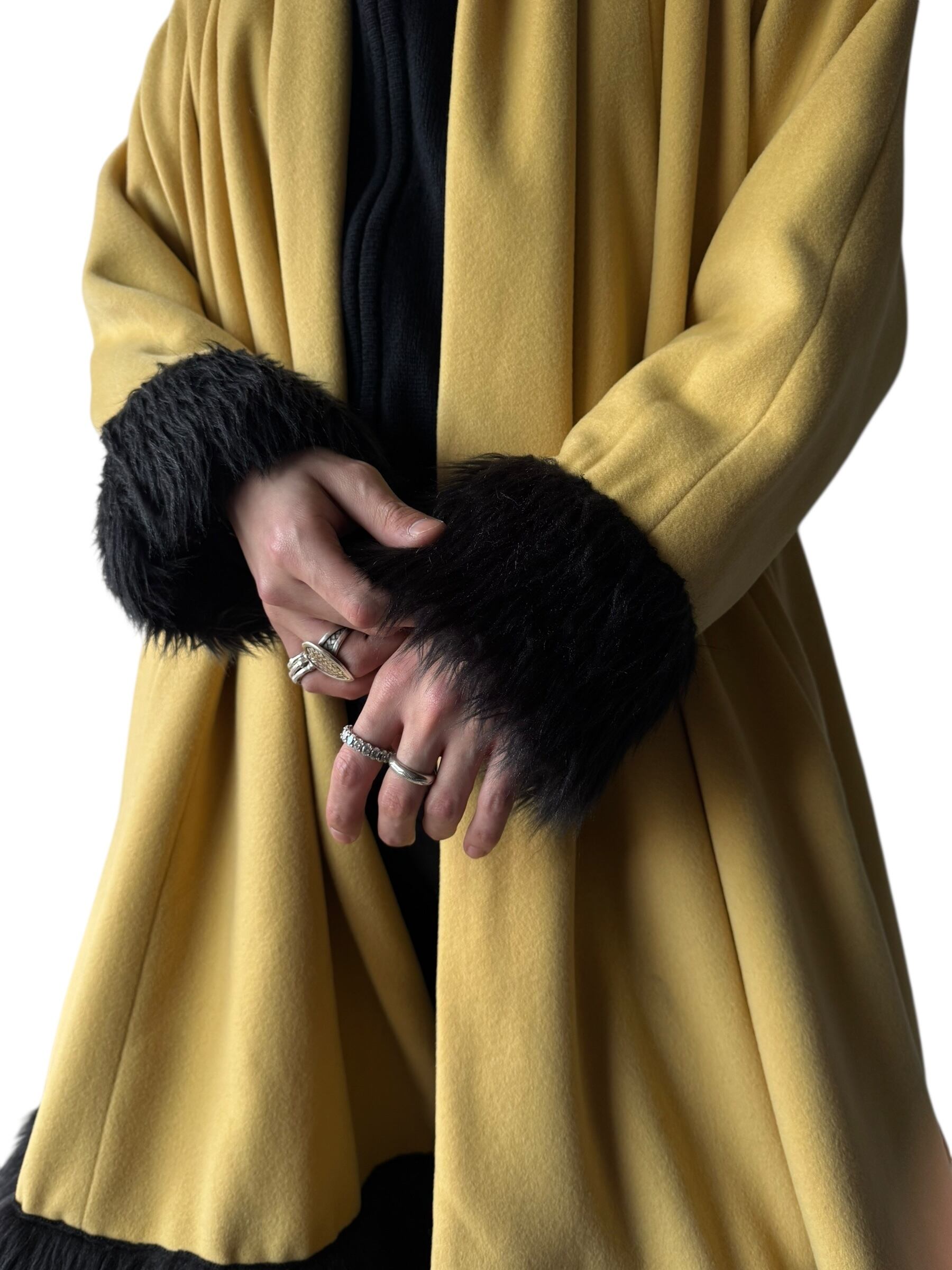 袖、裾、襟が黒になっており、襟はベロアで袖と裾だけファーになっており、可愛らしい黄色のボディにささる黒がめちゃくちゃカッコイイ✨️✨️
