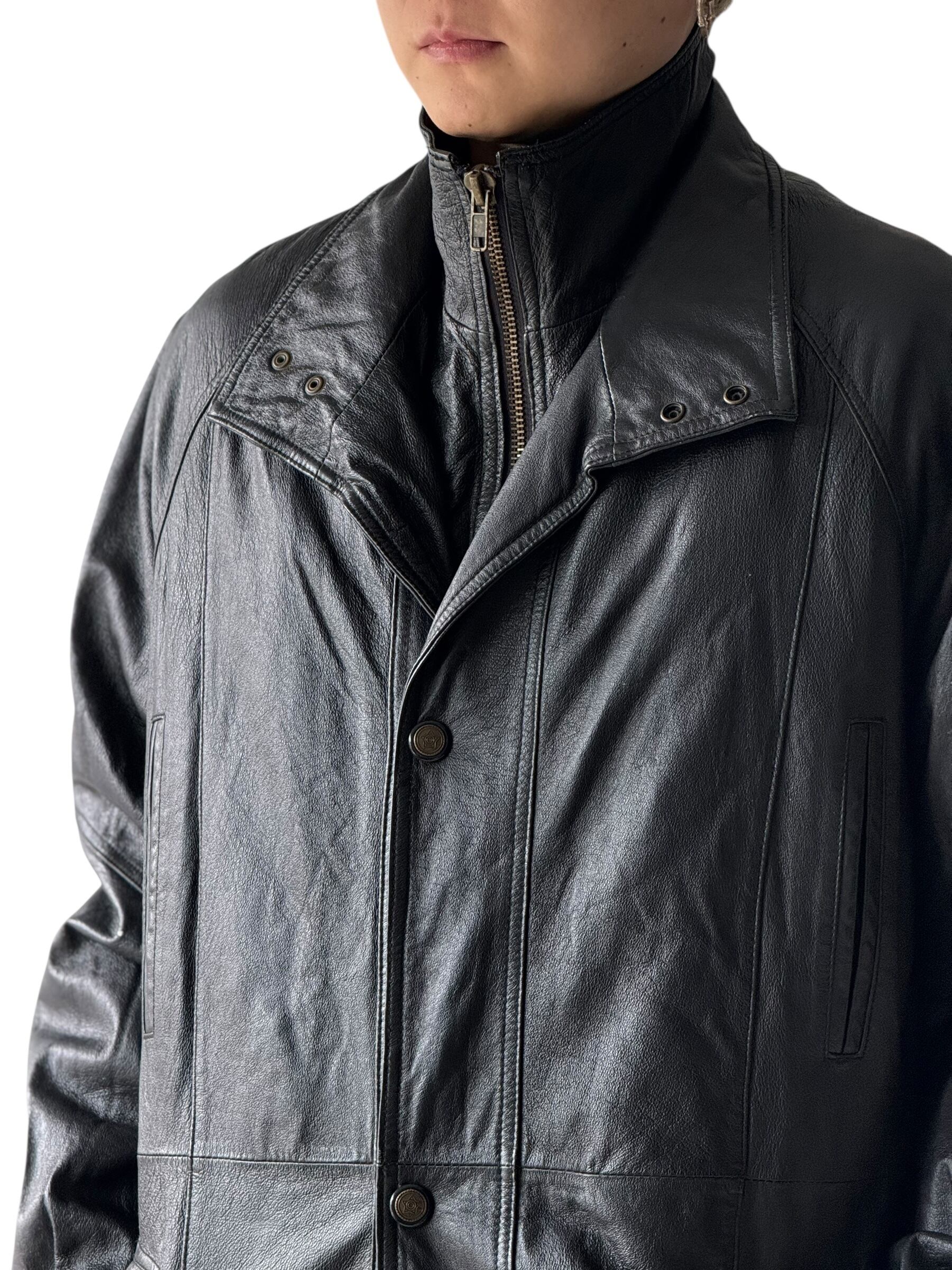 内側にハイネックをドッキングさせたレイヤードデザインが抜群にかっこいいレザーコート‼️